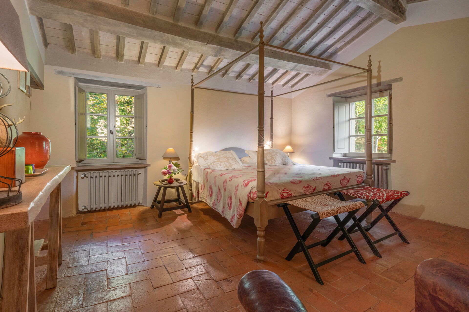 Casa di Giulio situata a Vivo D'orcia è una porzione di colonica con ingresso indipendente, restaurata recentemente mescolando antico e moderno per renderla particolarmente accogliente ed al tempo stesso piena di fascino.Piano terra: salotto con camino al quale si accede da una porta finestra; spaziosa cucina con apertura sull'esterno; camera a due letti con bagno con doccia alla quale si accede tramite alcuni scalini. Da qui si accede direttamente al cortile esterno dove si trova anche il tavolo da pranzo ombreggiato da una pergola.Primo piano: camera di passaggio con letto singolo; camera matrimoniale con letto a baldacchino e bagno en suite con doccia.La piscina con acqua salata in comune con gli altri appartamenti della tenuta si trova a 5 minuti a piedi dalla casa.