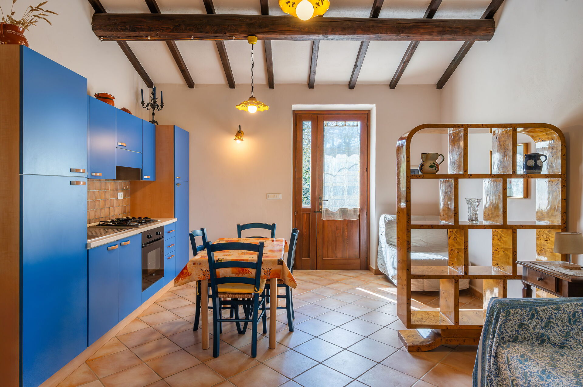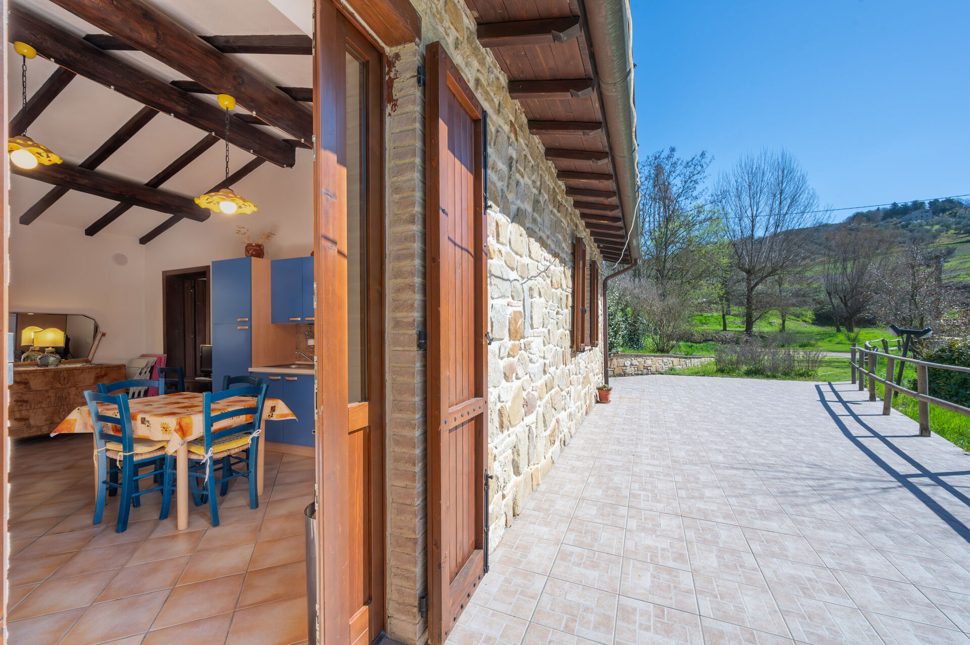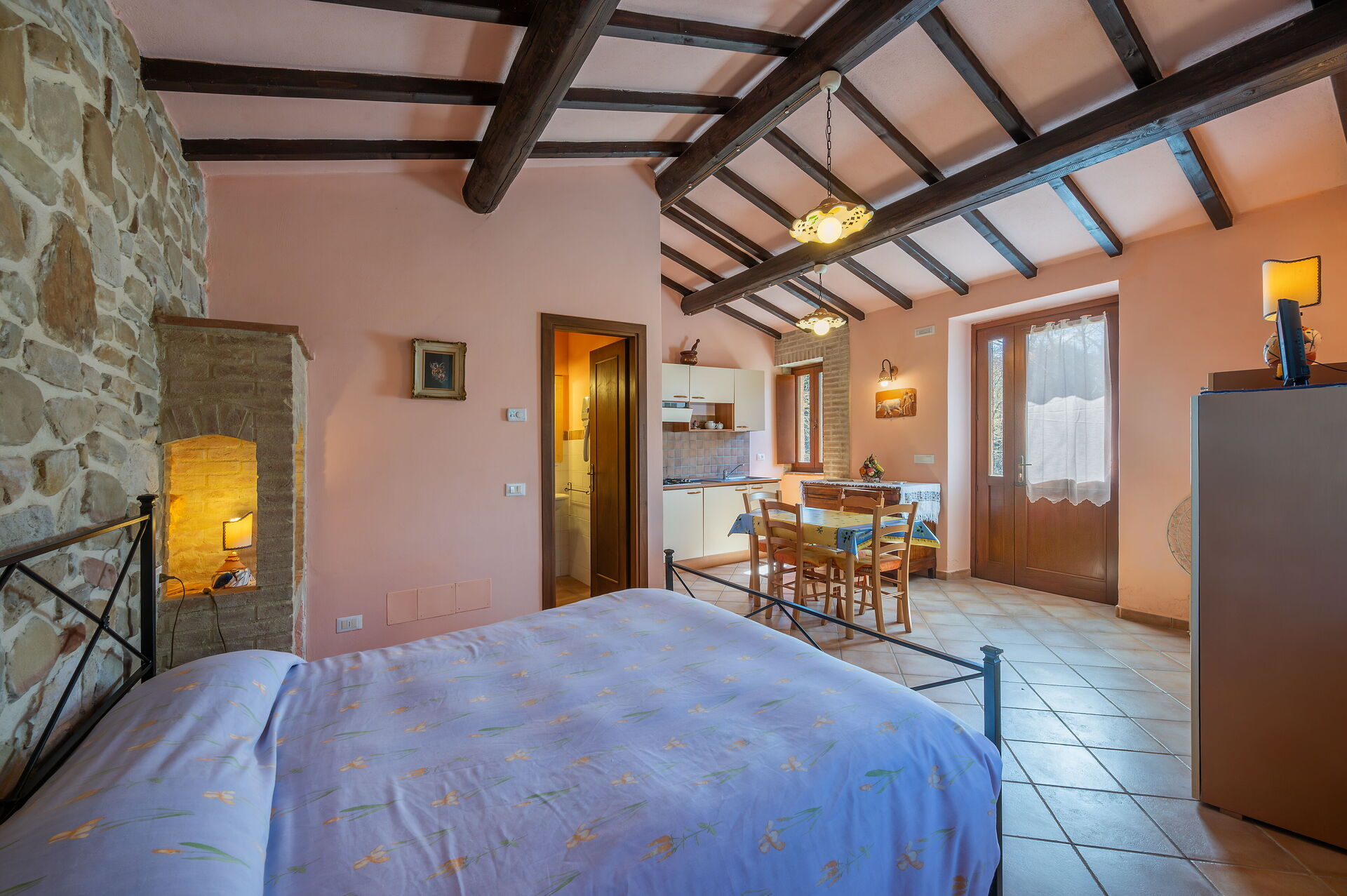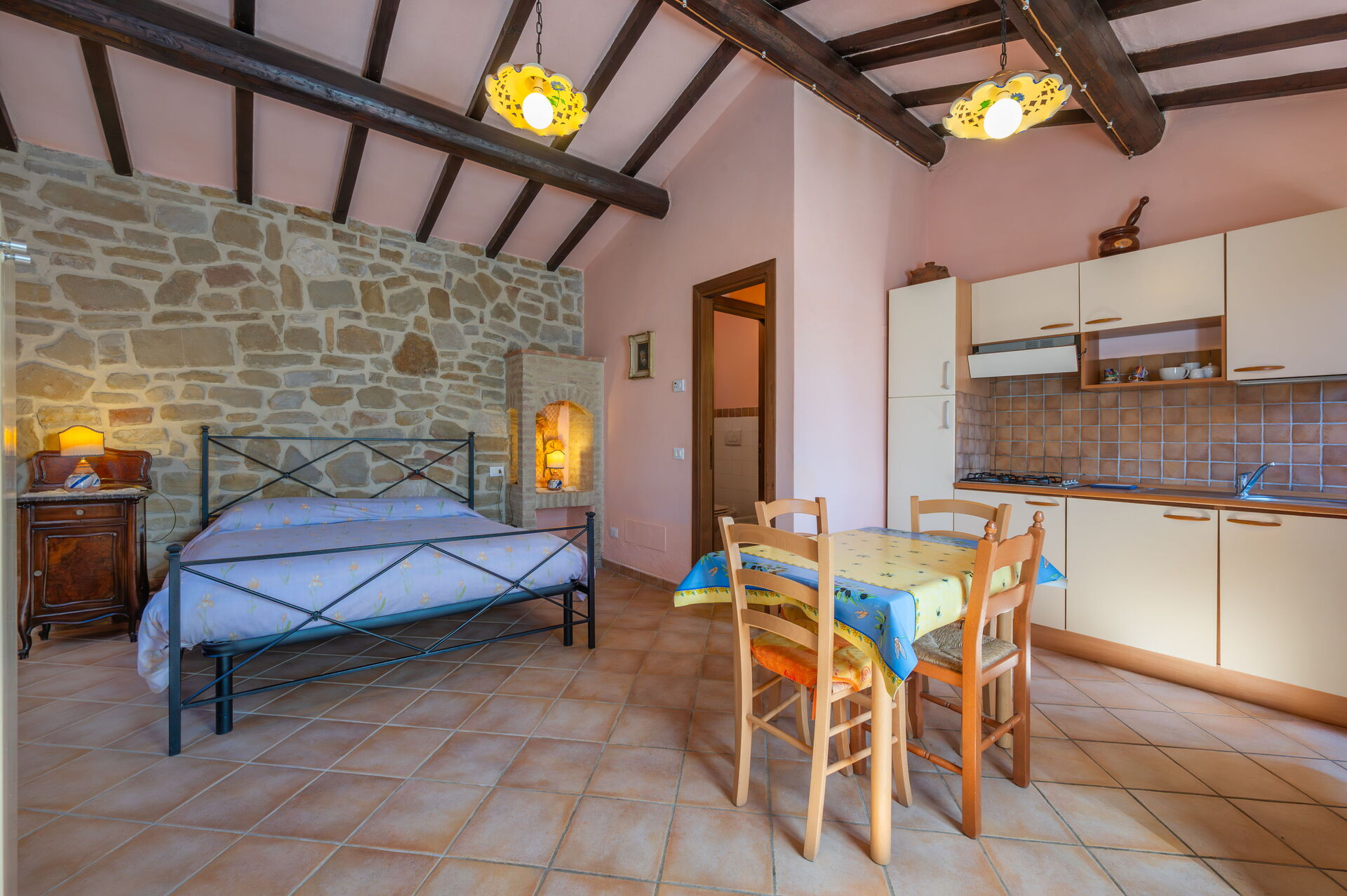 Porzione di casa indipendente con terrazza privata con vista direttamente sul lago privato della struttura. La struttura centrale si compone di cucina e soggiorno con divano e una camera matrimoniale con bagno completo, le altre due camere matrimoniali con bagno privato sono collegate esternamente e si presentano come due monolocali per consentire agli ospiti una maggiore privacy. Aria condizionata in tutta la struttura.