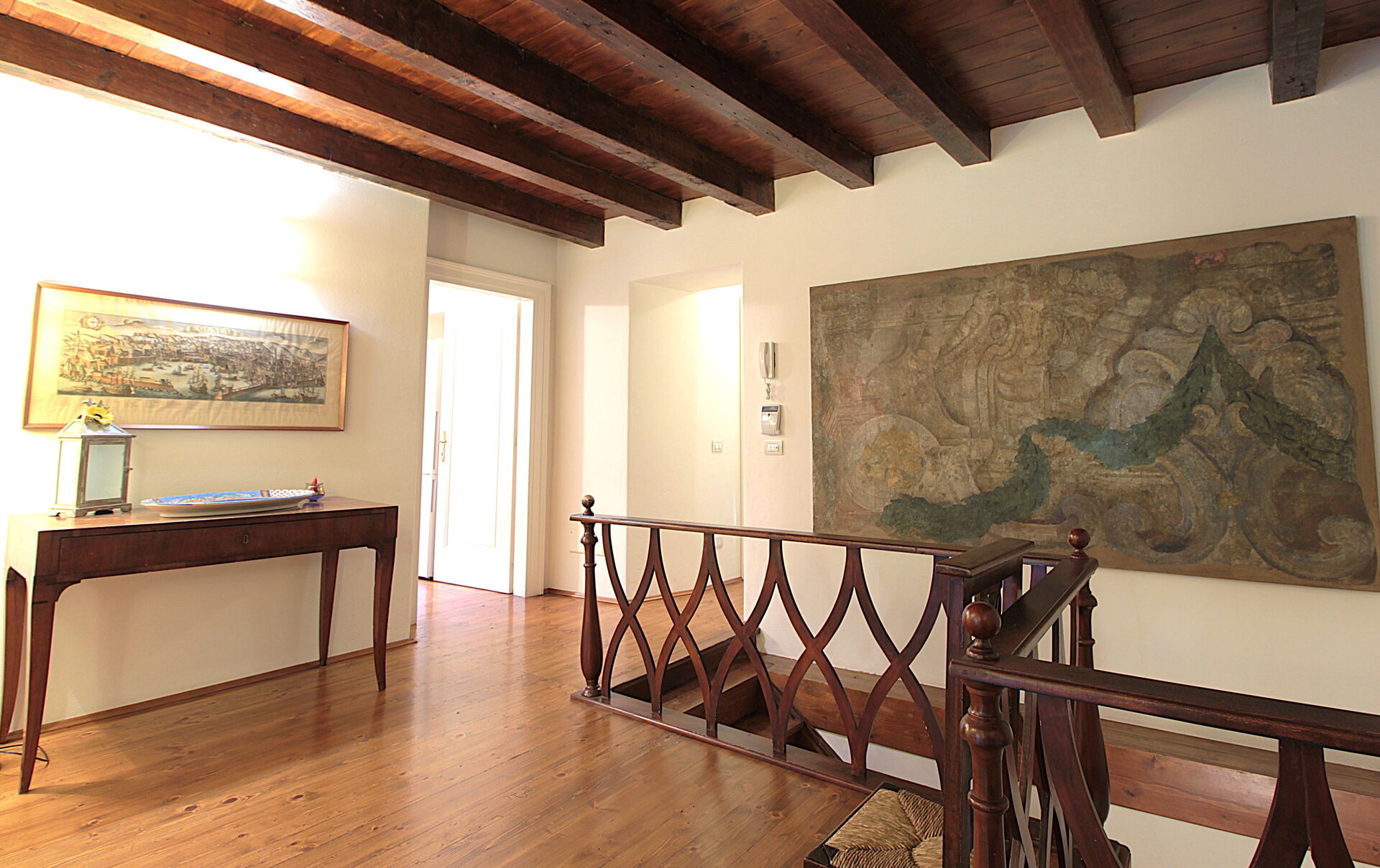 L'appartamento ha accesso dallo scalone della Villa, da cui si accede ad una scala interna ad esso che porta al secondo piano della Dimora Storica. Si sviluppa su un solo livello. Dall'ingresso si accede alla cucina, al salone, a 4 camere da letto e a 3 bagni. Dal salone si accede alla camera matrimoniale e al suo bagno.