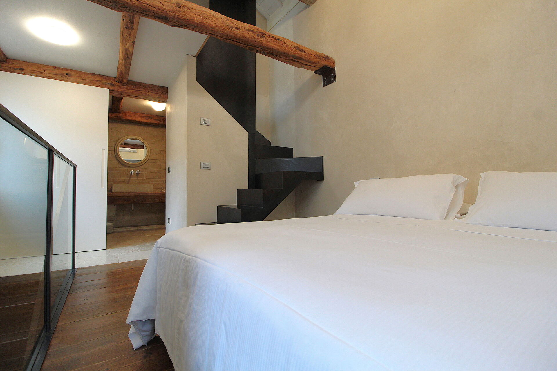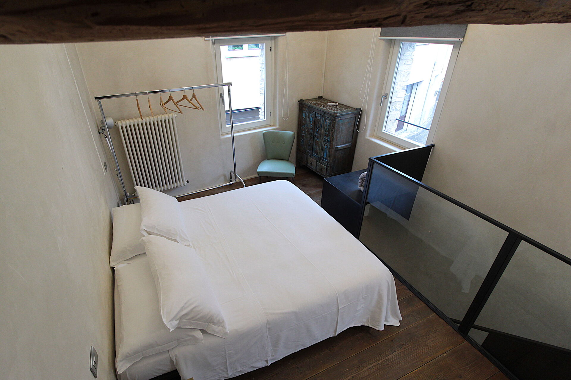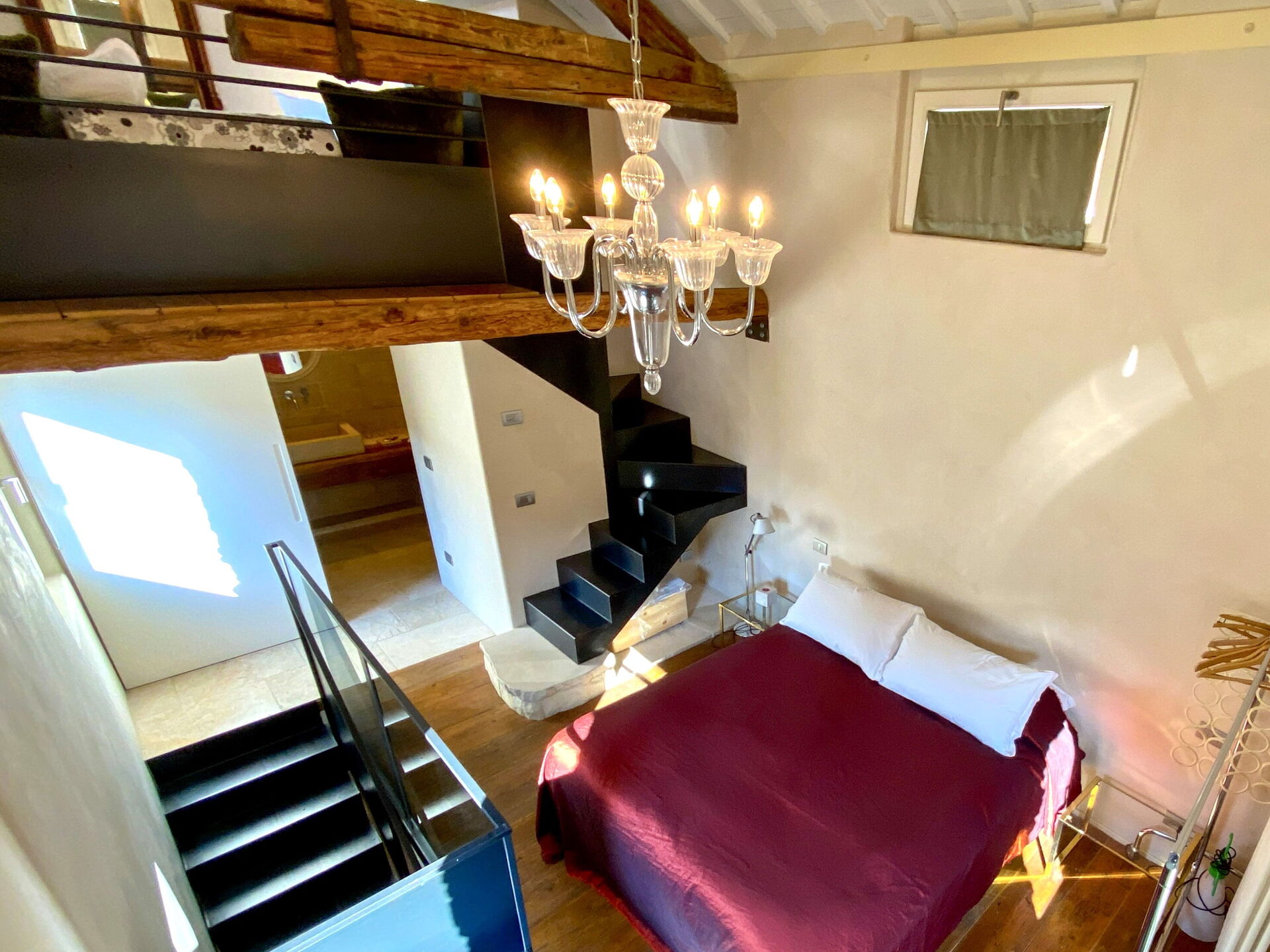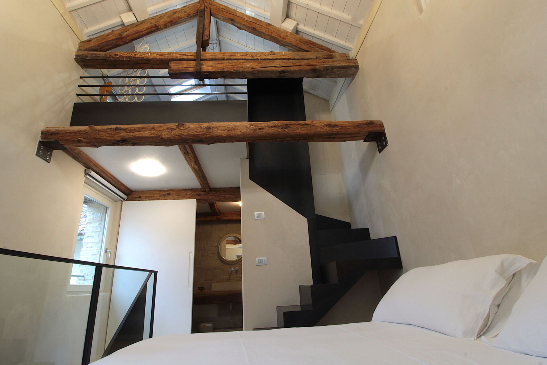 Affascinante abitazione su tre livelli. Al piano terra, l’ambiente open space accoglie soggiorno e cucina in un’unica luminosa area, dove protagonista assoluto è un camino dal design moderno, perfetto per creare un’atmosfera calda e accogliente in ogni stagione. Una scala in ferro e vetro conduce al primo piano, dove si trova la camera da letto matrimoniale con annesso bagno privato. Salendo ancora, si accede a un soppalco, realizzato sulle antiche travi in legno del 1800, dove in due letti singoli possono dormire 2 bambini, su richiesta. Questo spazio, in continuità visiva con la camera sottostante può essere adibita a studio.