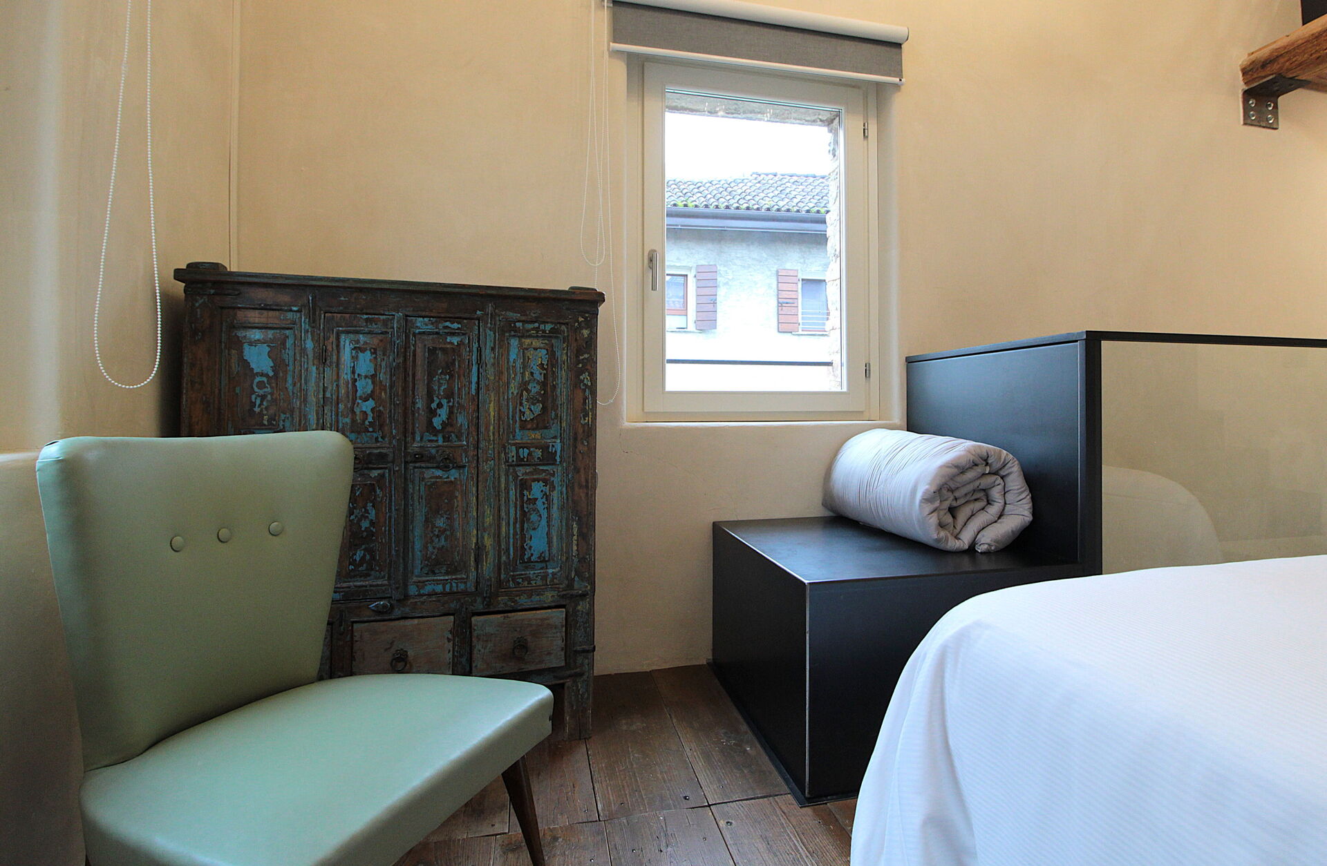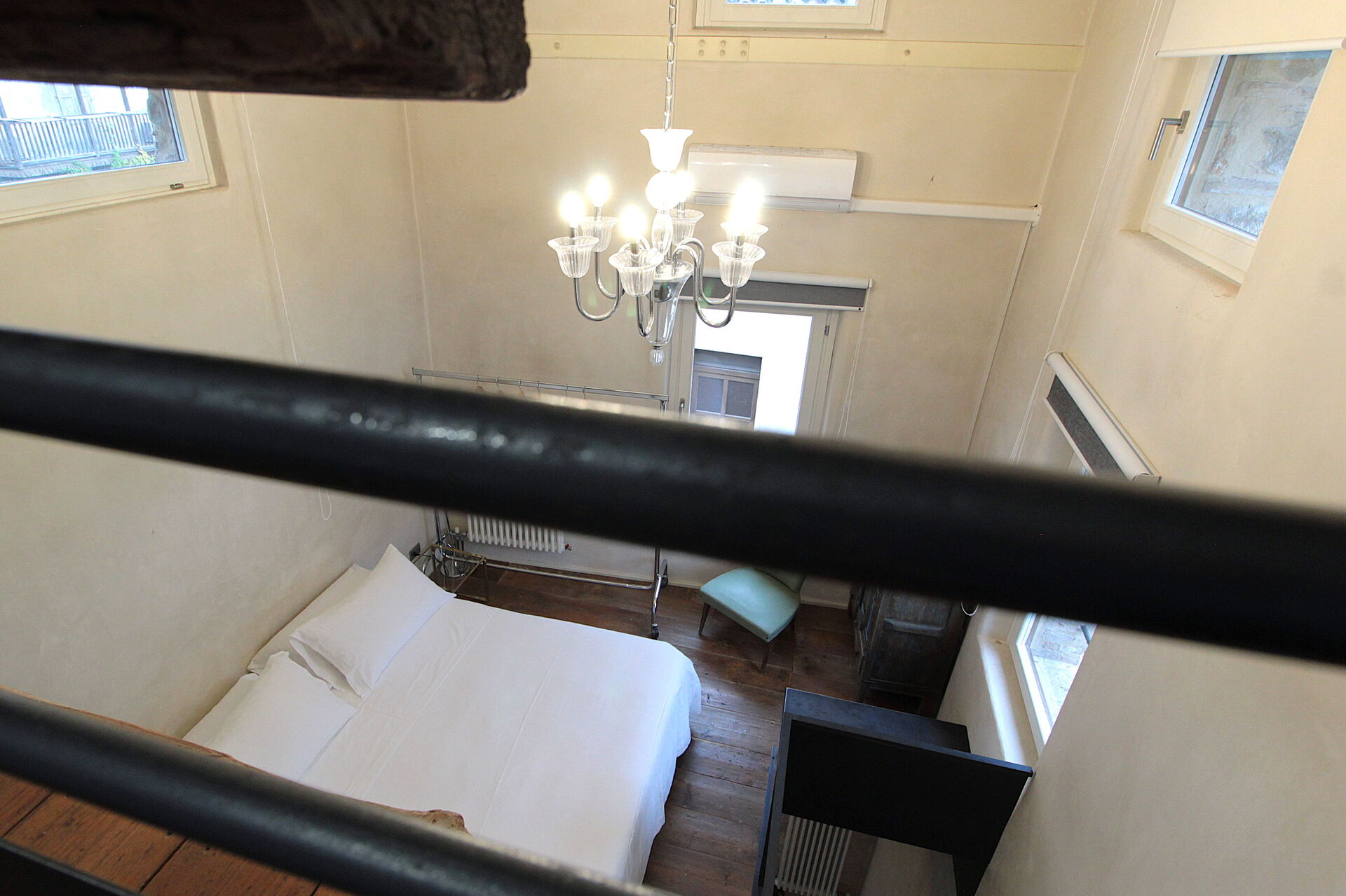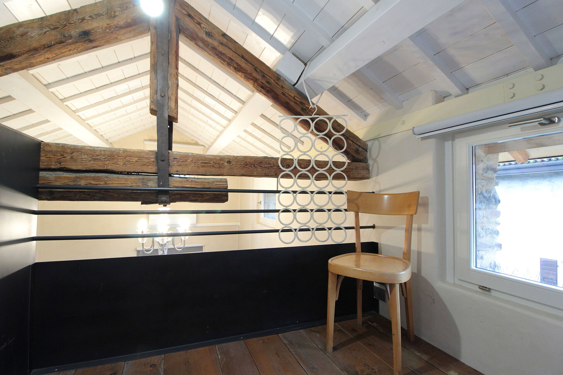 Affascinante abitazione su tre livelli. Al piano terra, l’ambiente open space accoglie soggiorno e cucina in un’unica luminosa area, dove protagonista assoluto è un camino dal design moderno, perfetto per creare un’atmosfera calda e accogliente in ogni stagione. Una scala in ferro e vetro conduce al primo piano, dove si trova la camera da letto matrimoniale con annesso bagno privato. Salendo ancora, si accede a un soppalco, realizzato sulle antiche travi in legno del 1800, dove in due letti singoli possono dormire 2 bambini, su richiesta. Questo spazio, in continuità visiva con la camera sottostante può essere adibita a studio.