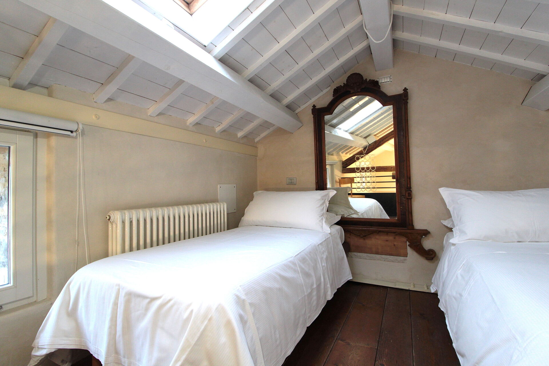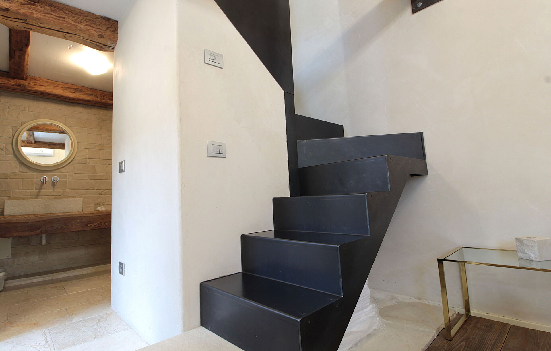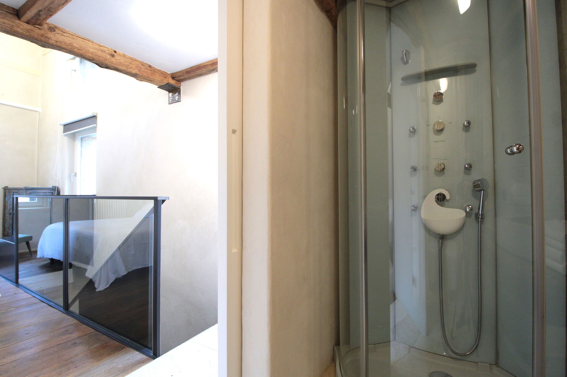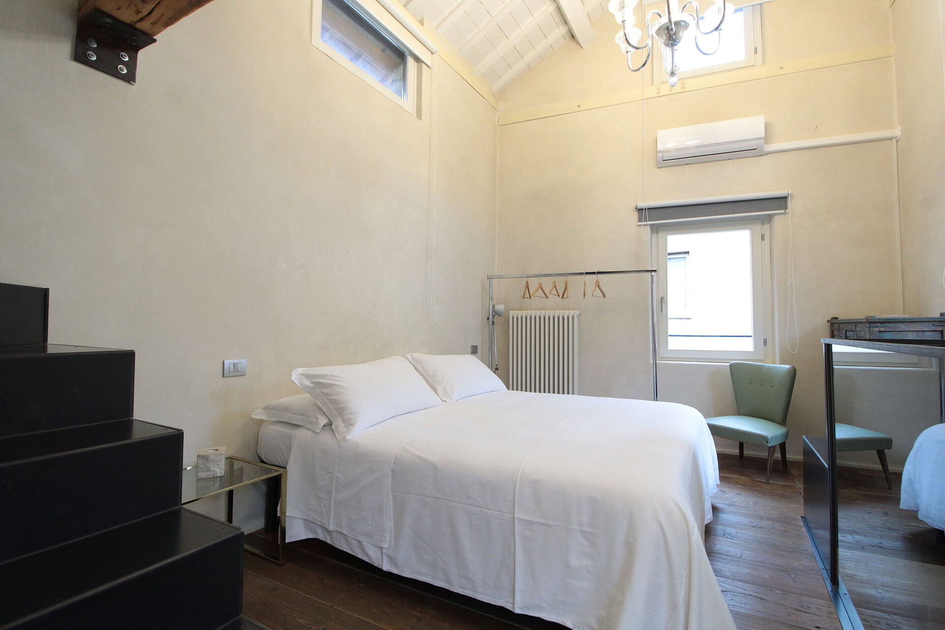 Affascinante abitazione su tre livelli. Al piano terra, l’ambiente open space accoglie soggiorno e cucina in un’unica luminosa area, dove protagonista assoluto è un camino dal design moderno, perfetto per creare un’atmosfera calda e accogliente in ogni stagione. Una scala in ferro e vetro conduce al primo piano, dove si trova la camera da letto matrimoniale con annesso bagno privato. Salendo ancora, si accede a un soppalco, realizzato sulle antiche travi in legno del 1800, dove in due letti singoli possono dormire 2 bambini, su richiesta. Questo spazio, in continuità visiva con la camera sottostante può essere adibita a studio.