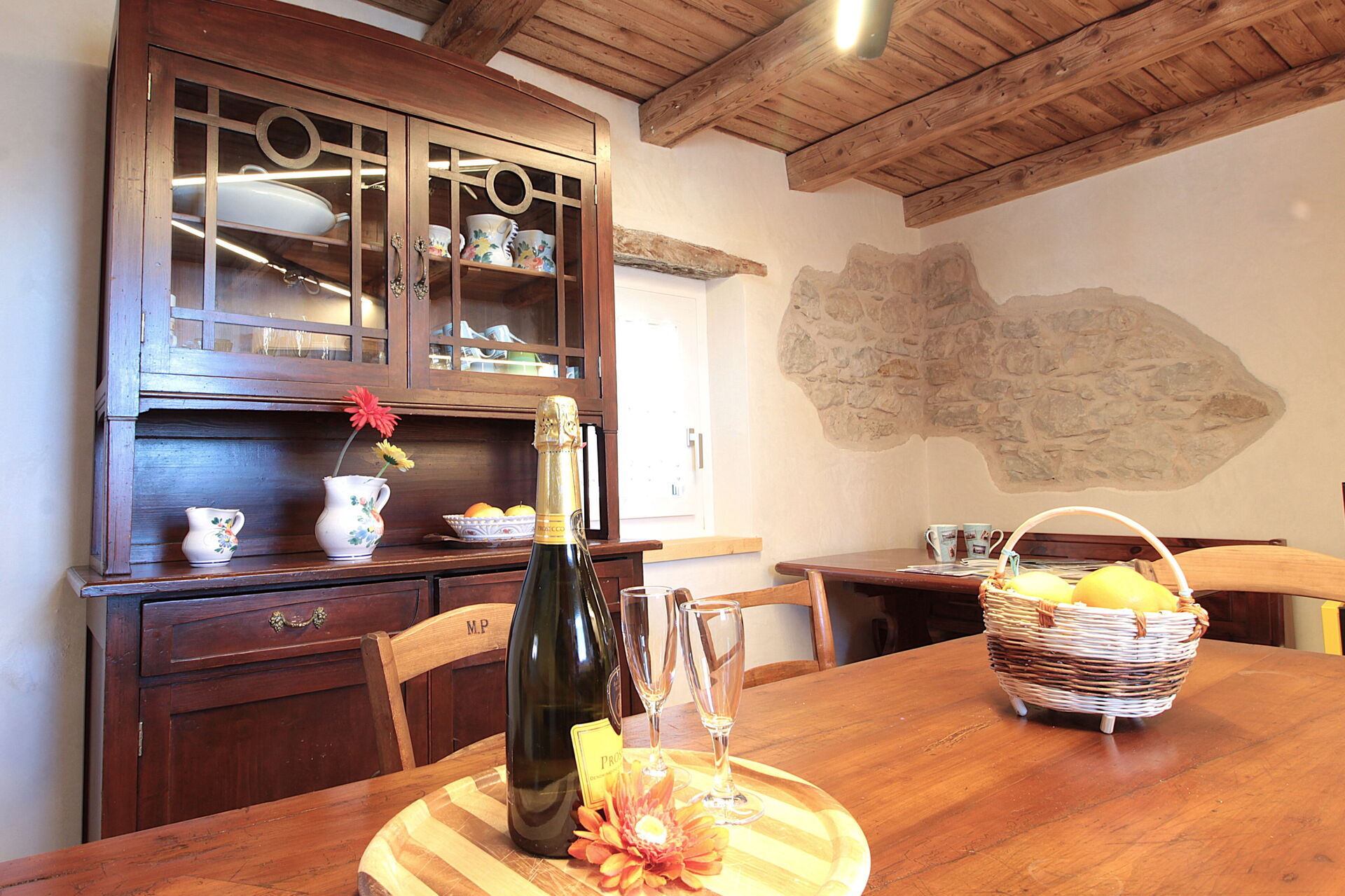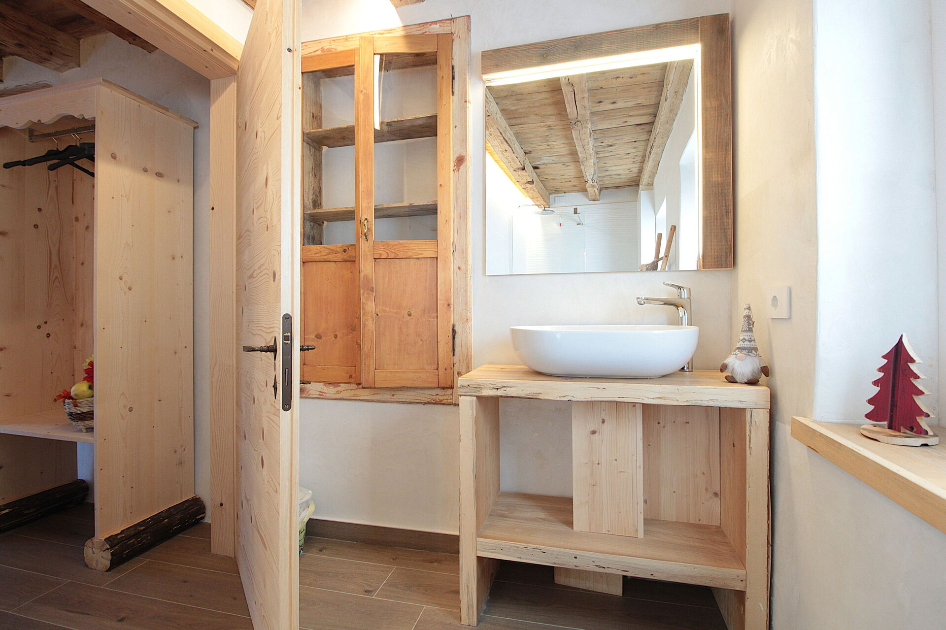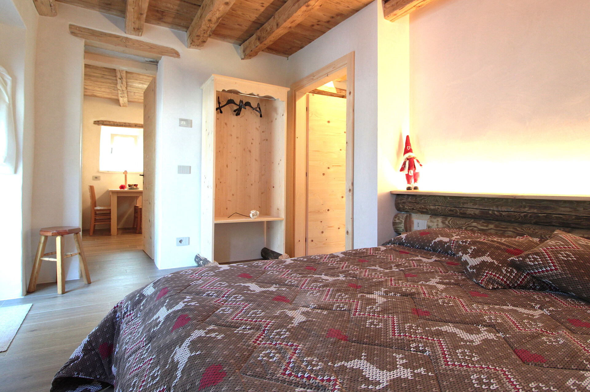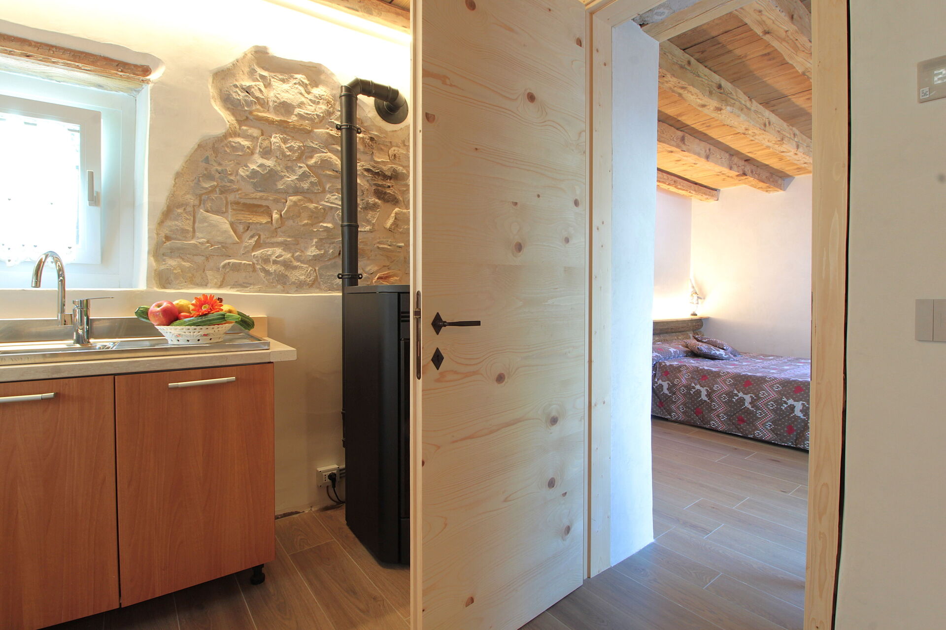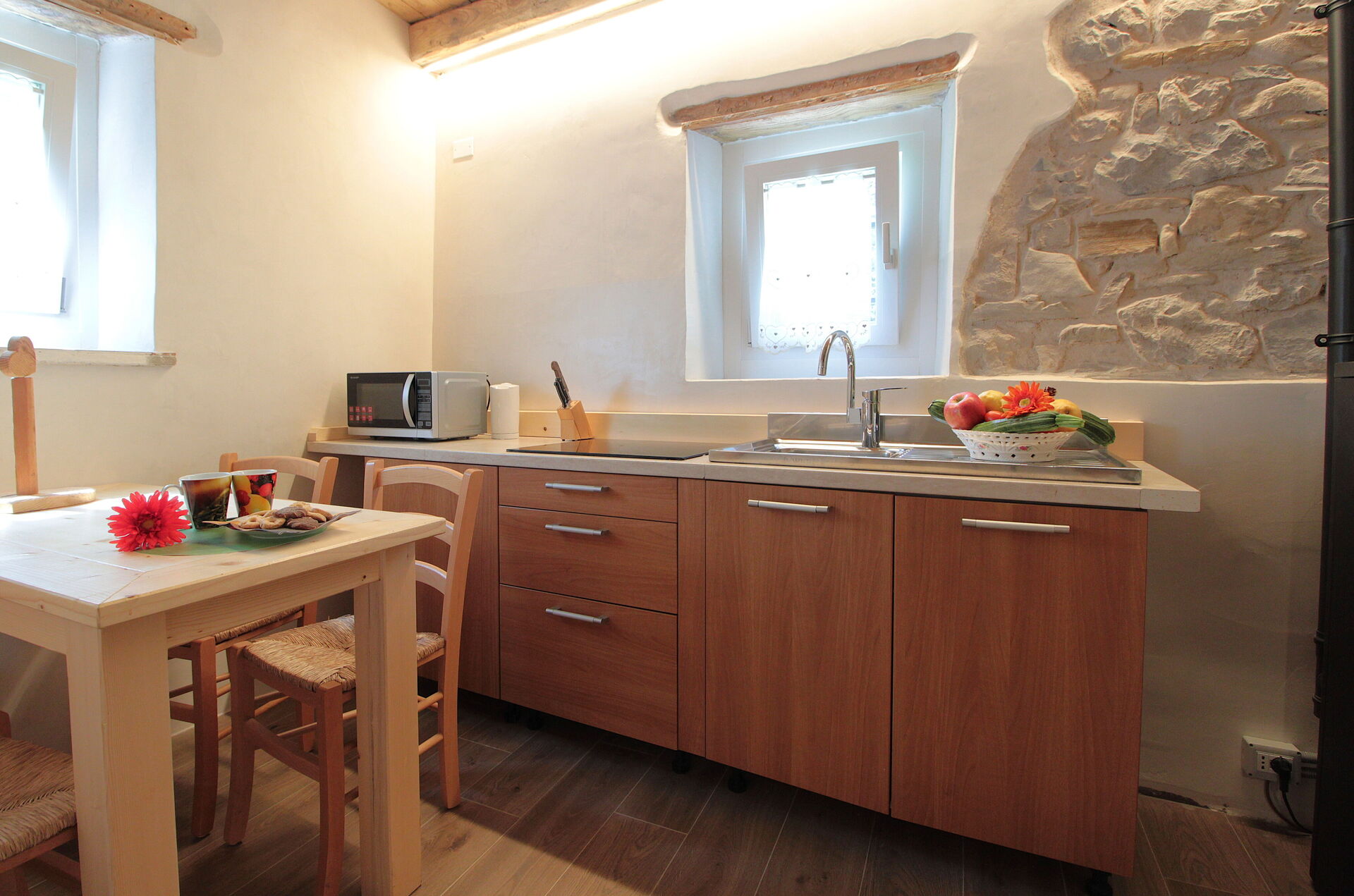 - la cucina , la sala da pranzo con una seconda cucina a il larin (un focolare attorno al quale sedersi e raccontarsi la giornata), un bagno con doccia e una camera da letto matrimoniale.