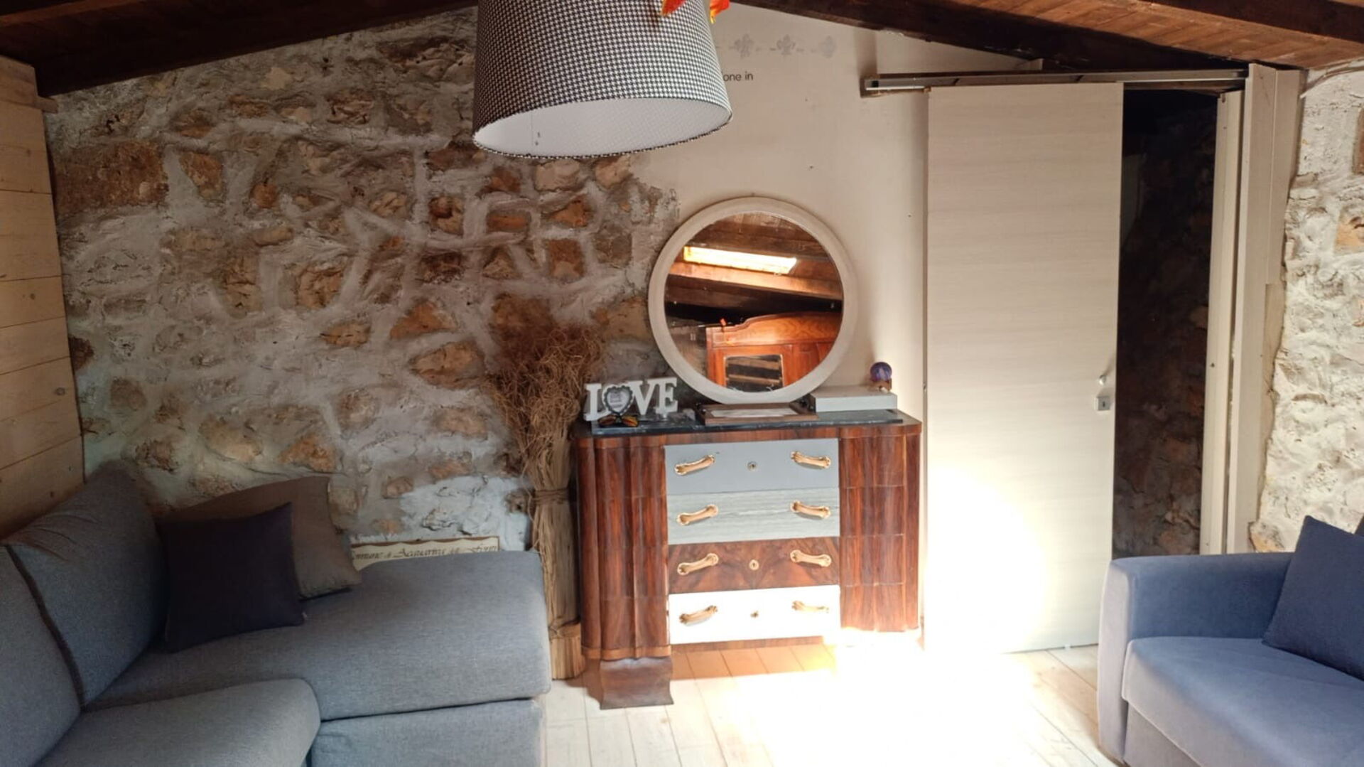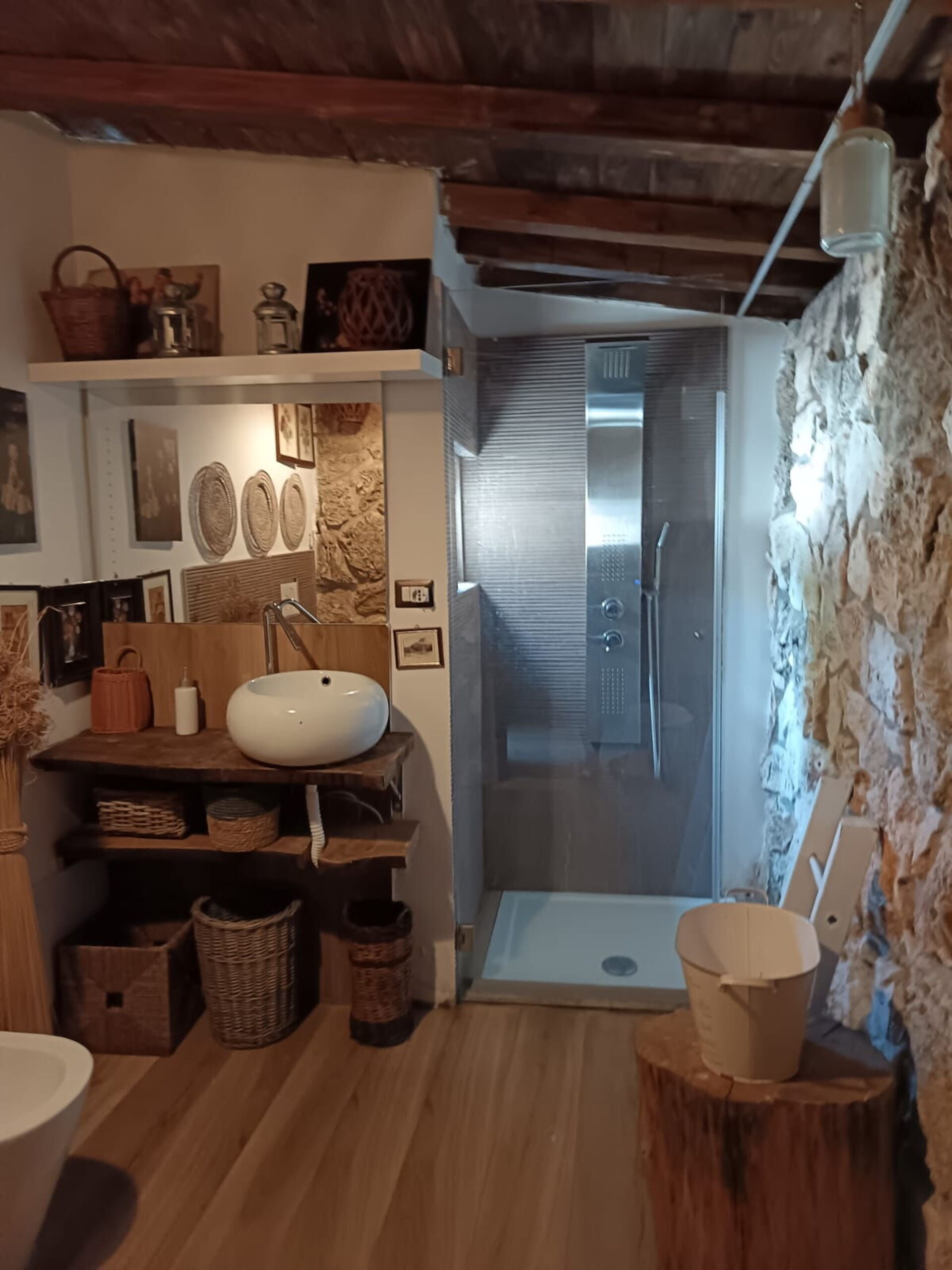 The interior is composed as follows: Industrial kitchen, living room with double sofa bed. The sleeping area consists of 4 bedrooms: 1 with 2 single beds and 3 double beds. One of the rooms is located in the tree house outside. One bathroom inside the house and two bathrooms outside. Washing machine available for guests.