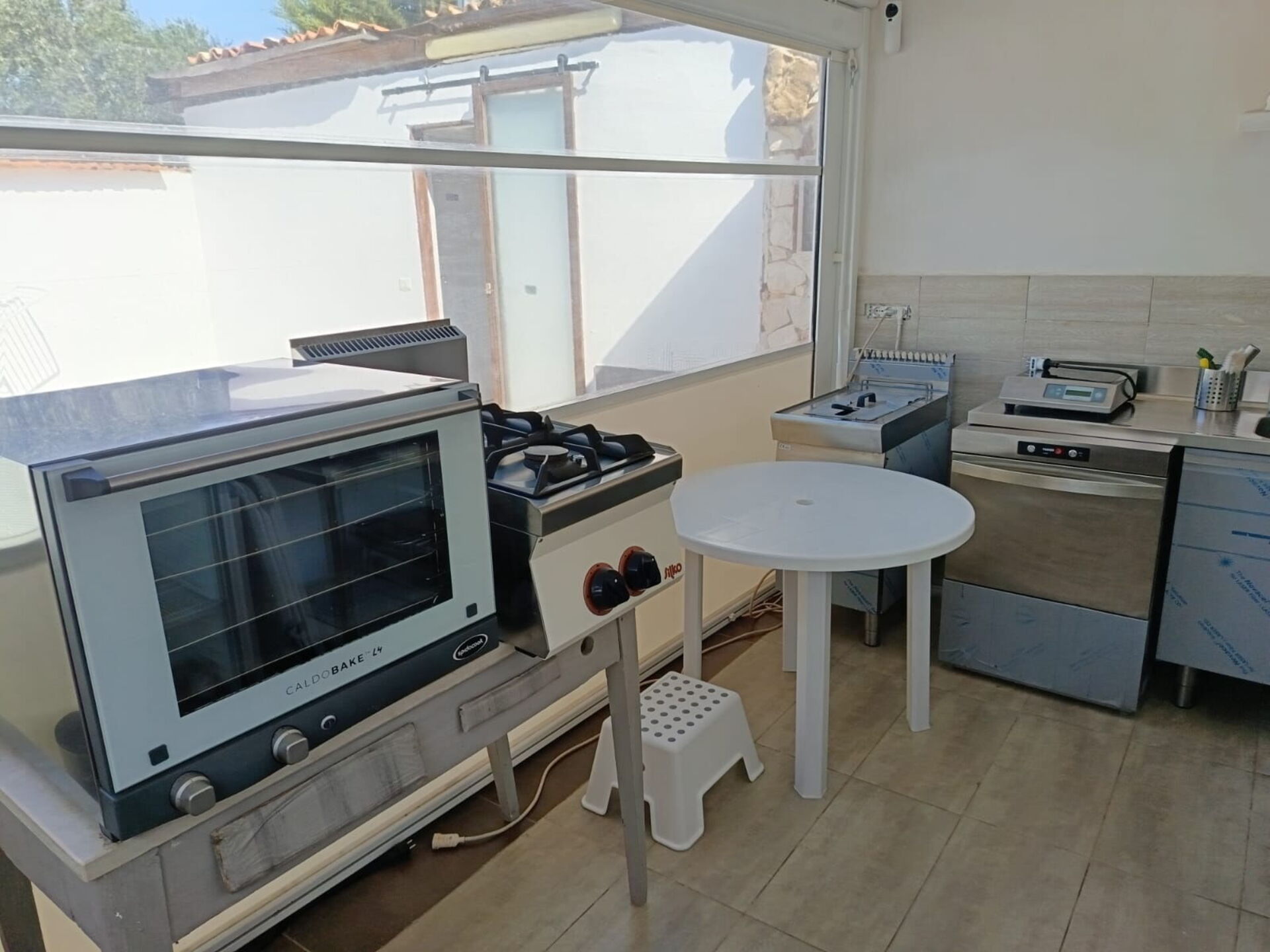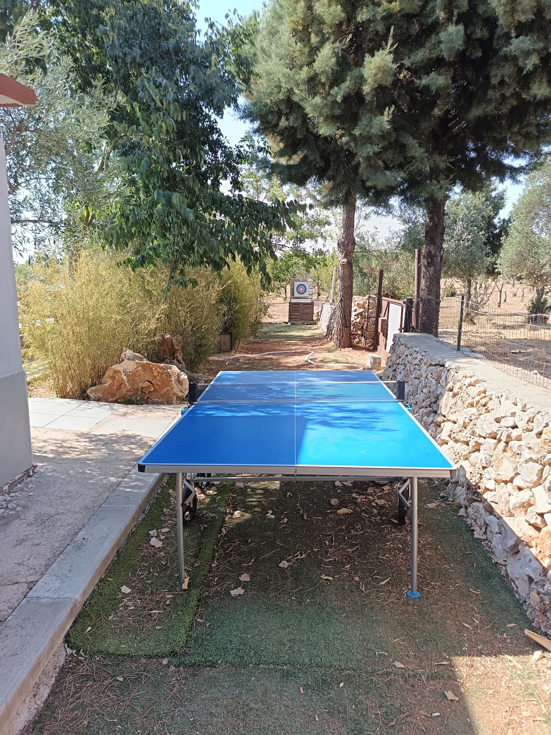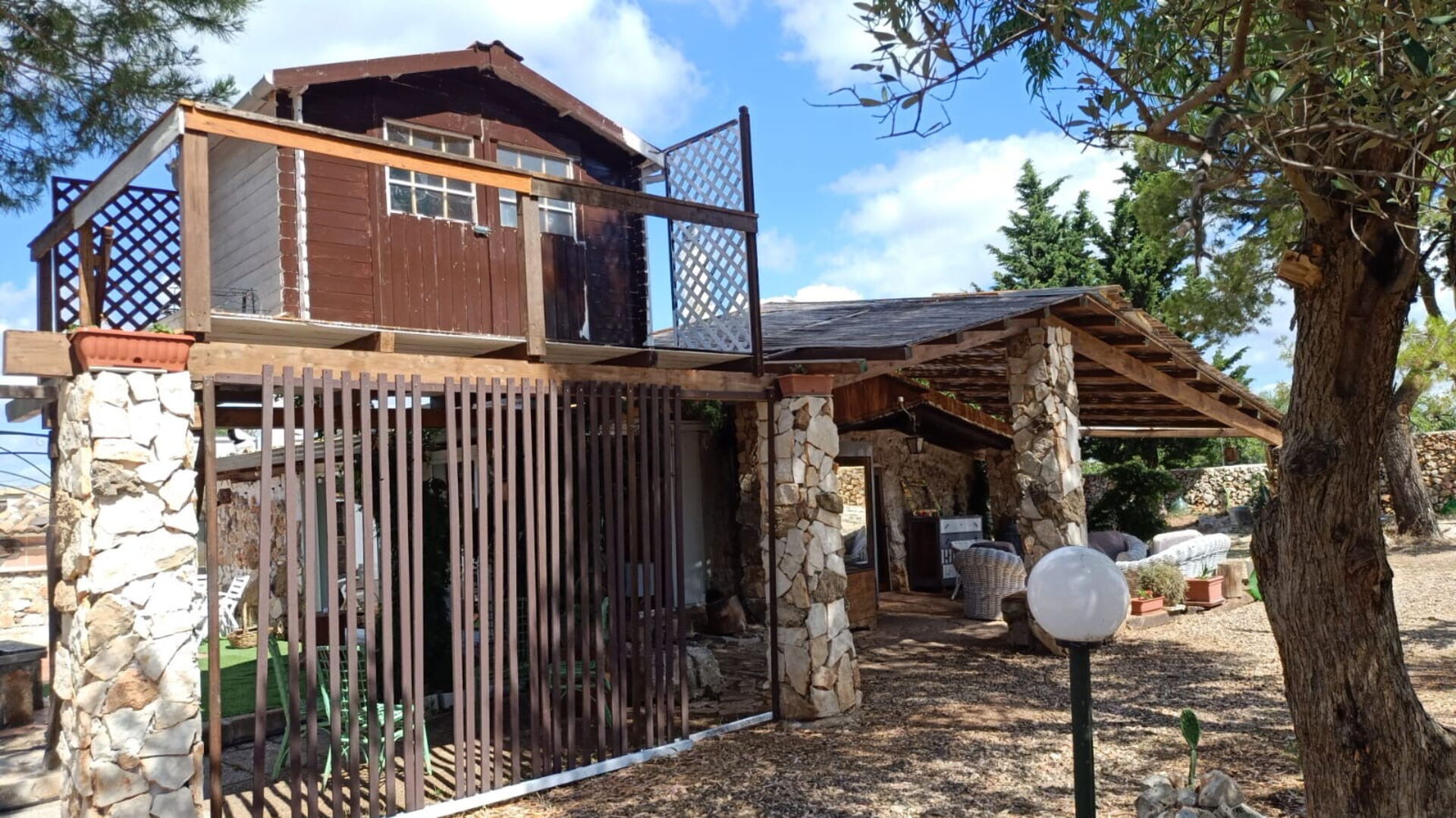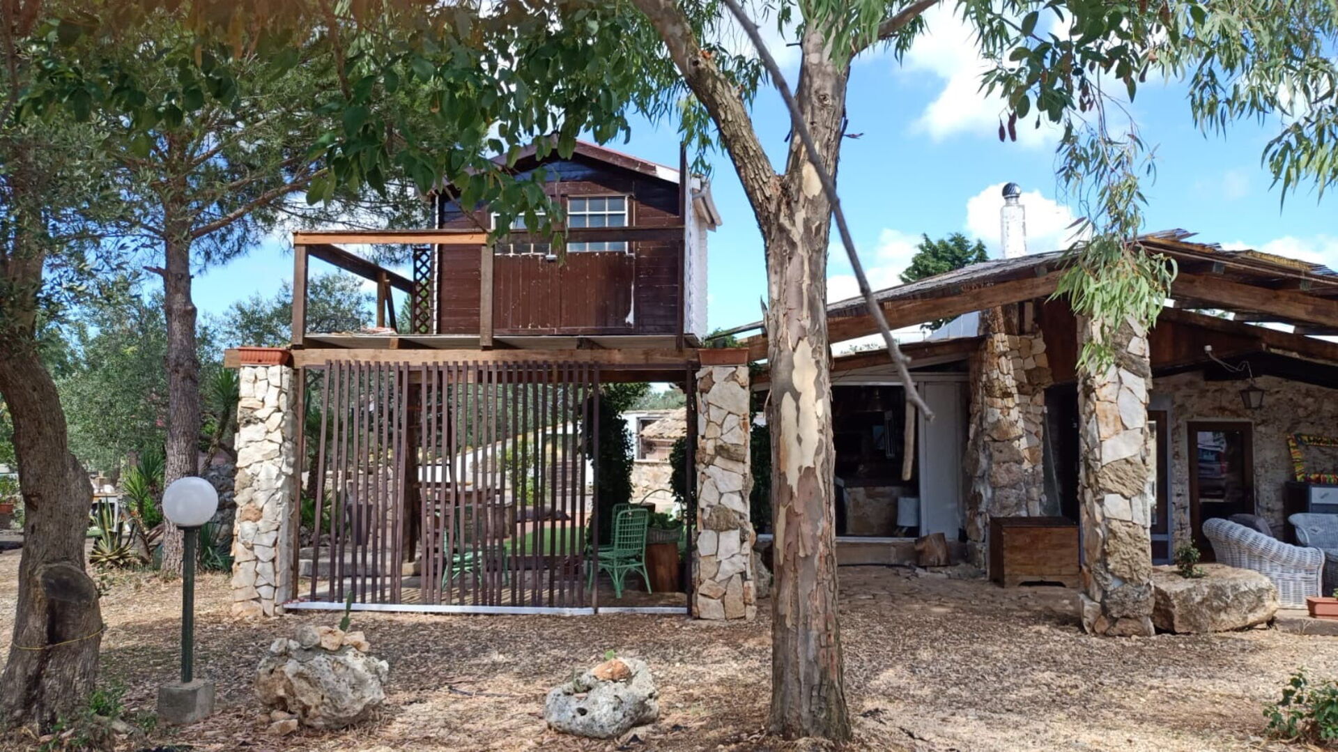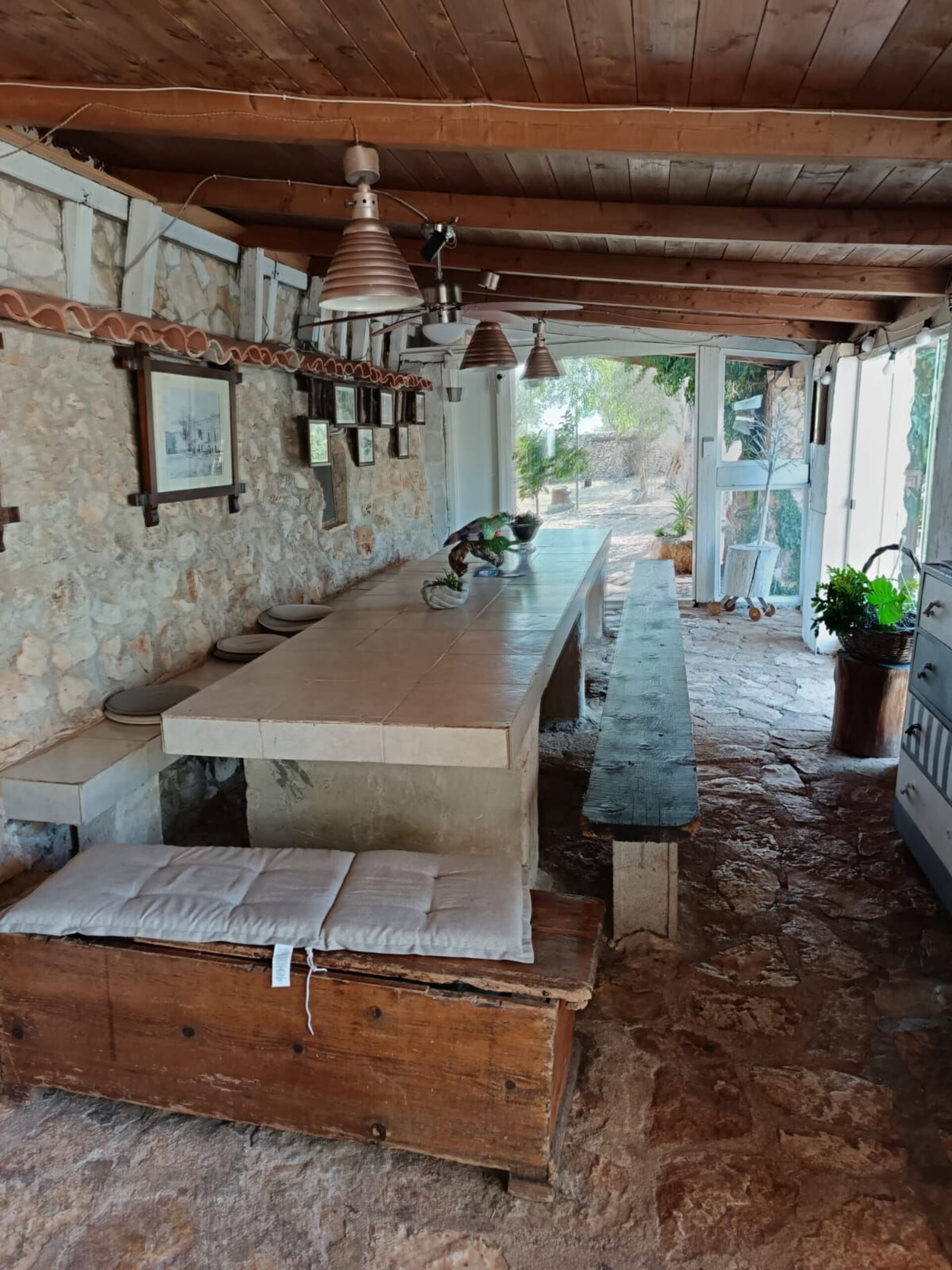 Outside, there is a kitchen with a wood-fired oven for pizza, as well as tools for grilling and barbecuing.