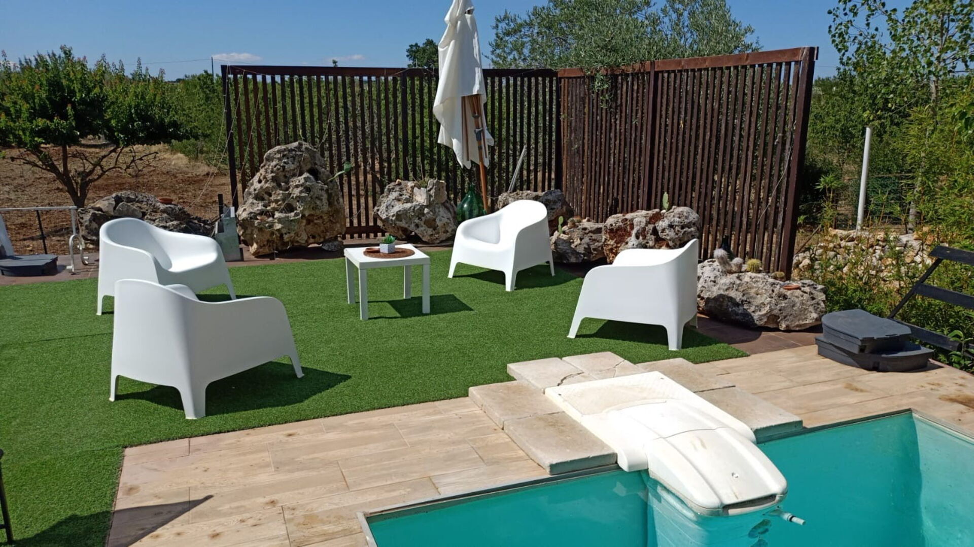 Borgo Incanto a beautiful independent house nestled in the peaceful countryside, featuring a private pool and a relaxing atmosphere. The pool area is equipped with sun loungers and a bar area with a fridge available for guests.