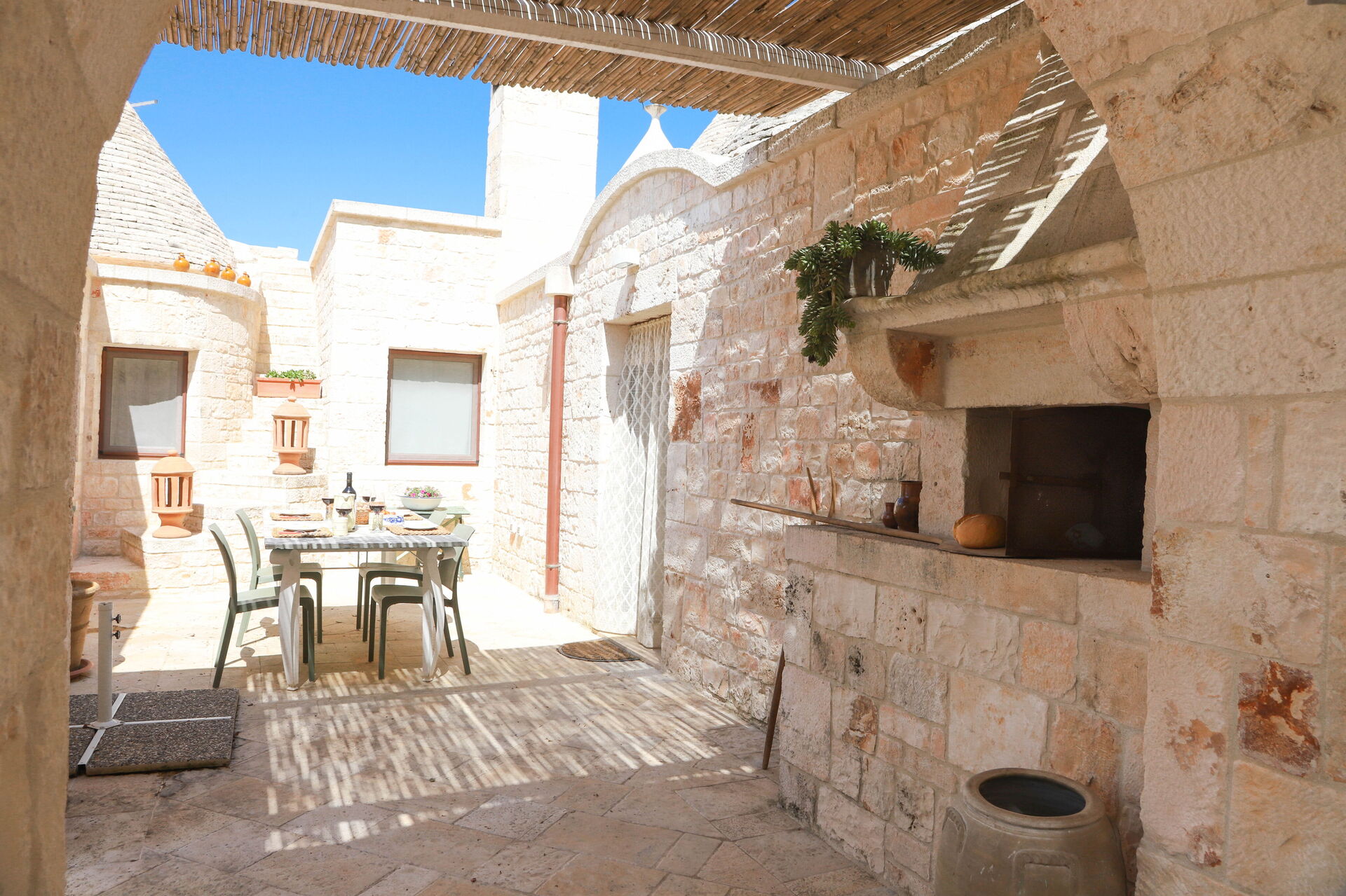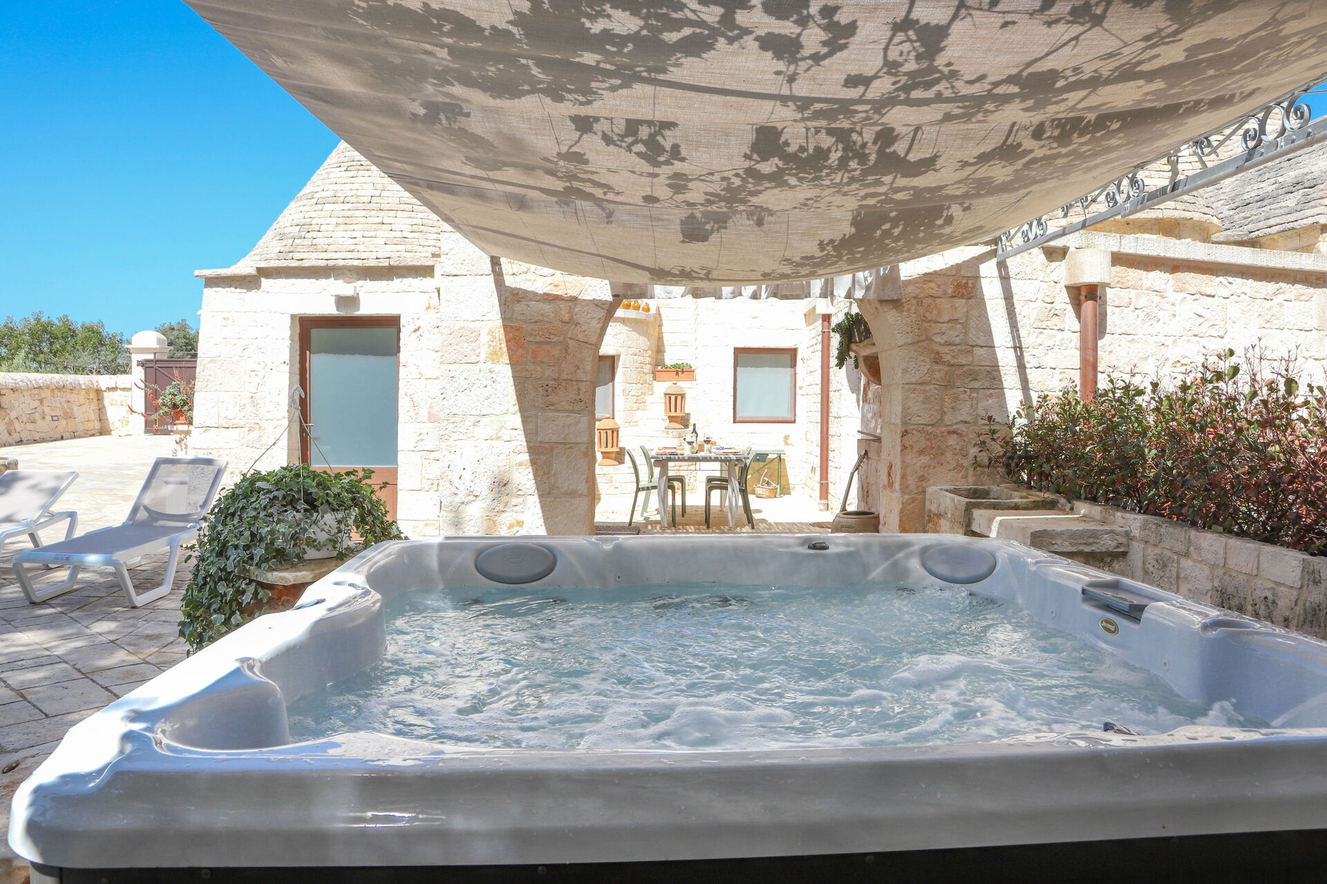 Outside, guests can relax in the splendid jacuzzi with hydromassage and enjoy a large stone-paved garden, furnished with tables and chairs ideal for outdoor lunches and dinners. Our structure will welcome you for an authentic and unforgettable stay immersed in the magic of the trulli.