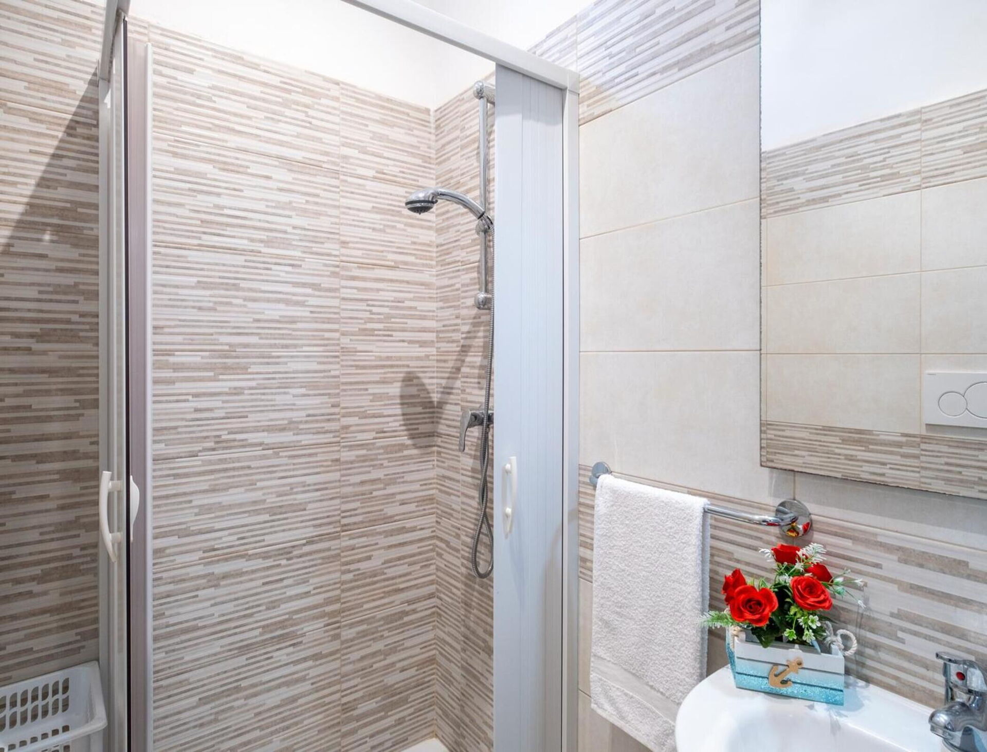 The flat's spaces are divided into two bedrooms: one triple and one double with the possibility of adding a single folding cot. Spacious living area with sofa bed, private outdoor area for dining, play area and communal double barbecue, fully equipped kitchen, fridge, oven, coffee machine with pods and TV, large bathroom with bidet; washing machine and double air-conditioning in the sleeping areas to completely cool the whole structure. Beautiful inside too, airy rooms in soft, relaxing tones. Elegant and simple, the holiday home is furnished with attention to detail and an easy choice of furniture that creates a soft atmosphere.