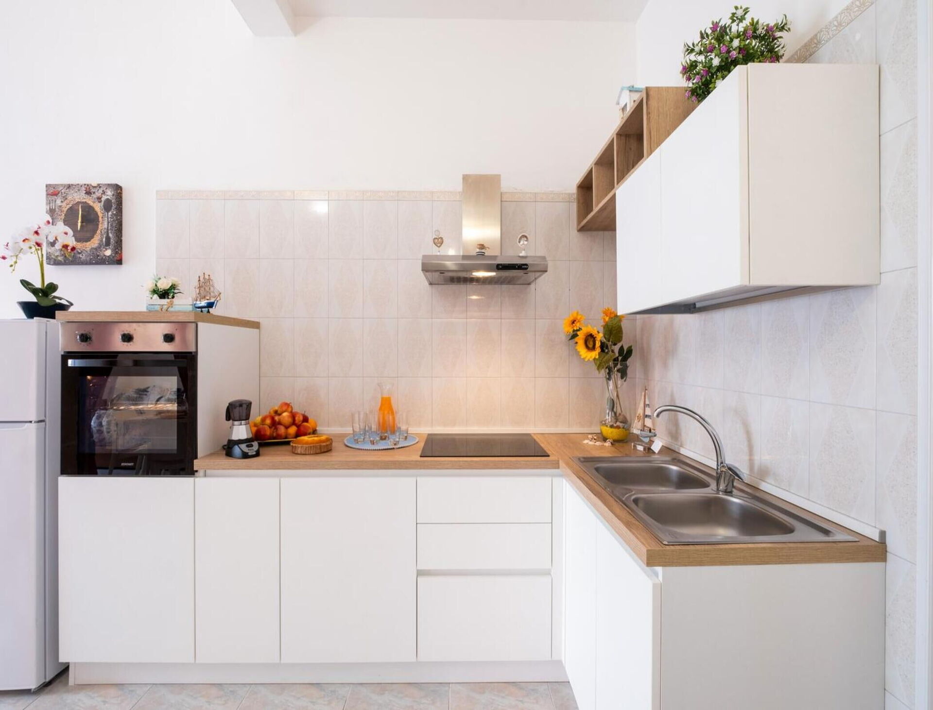 The flat's spaces are divided into a triple bedroom, a large living area with a sofa bed, a dining area with a double pull-out bed, a private outdoor area for dining in the back garden with a private barbecue area, a fully equipped kitchen, fridge, oven, induction hob, TV, large bathroom with bidet and shower; washing machine and three air-conditioning units to cool the whole building. Beautiful inside too, airy rooms in soft, relaxing tones.