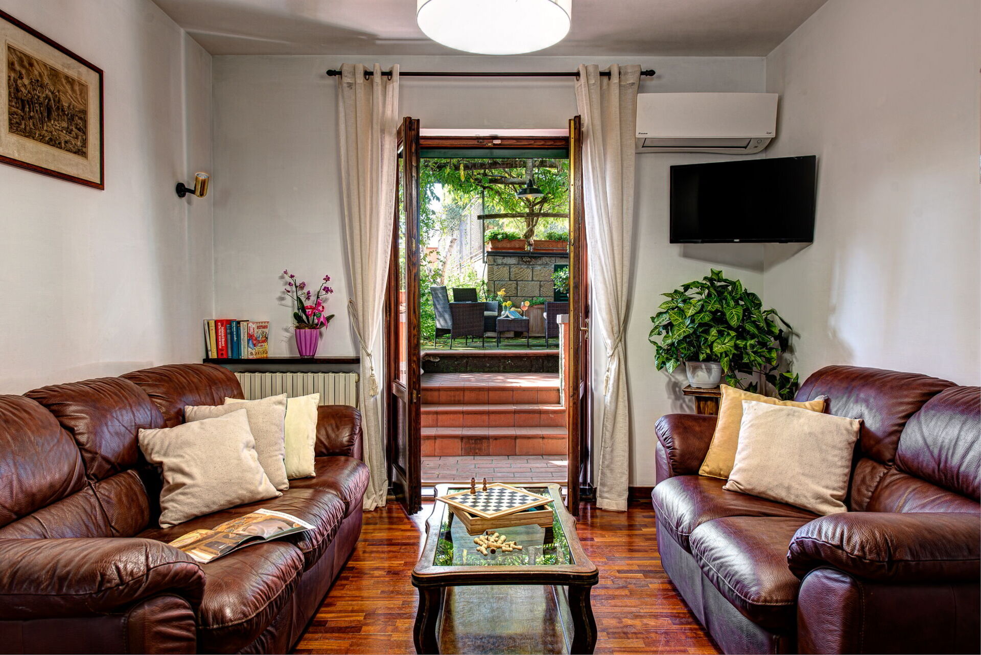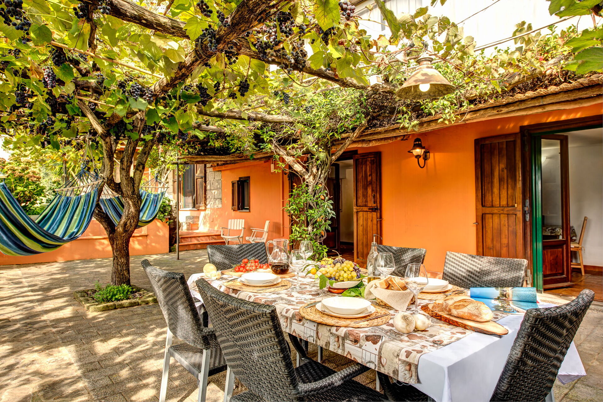 It houses 3 double bedrooms, 1 double sofa bed, and several communal areas: a large living and dining room, a well-equipped traditional kitchen, and a terrace with views of the countryside and Capri.