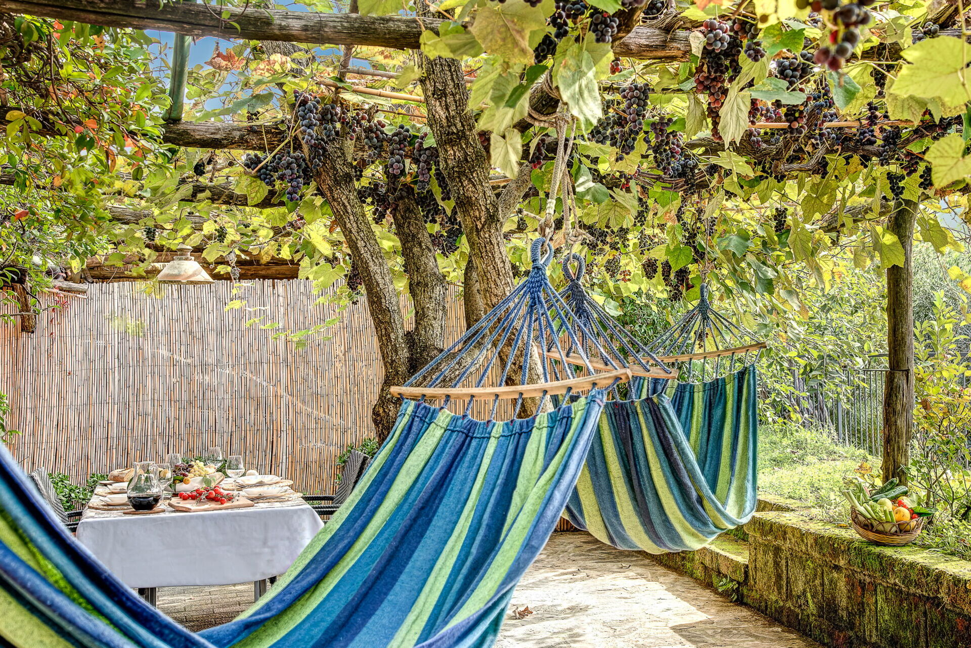 The property has two entrances: one in the basement, leading to a furnished patio under Mediterranean grape vines, and the other to the main entrance of the villa.