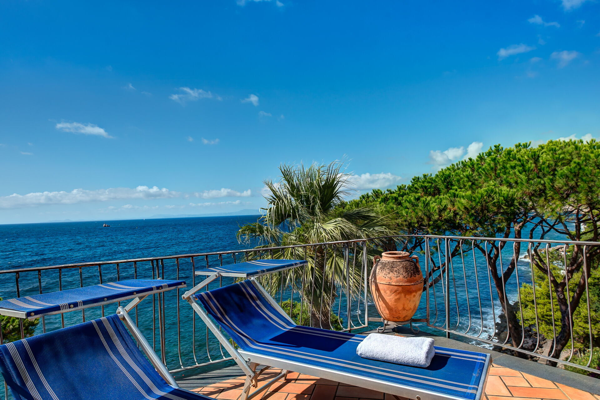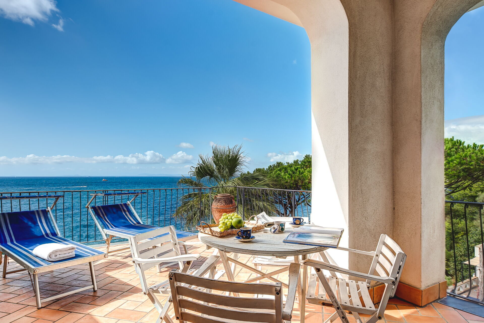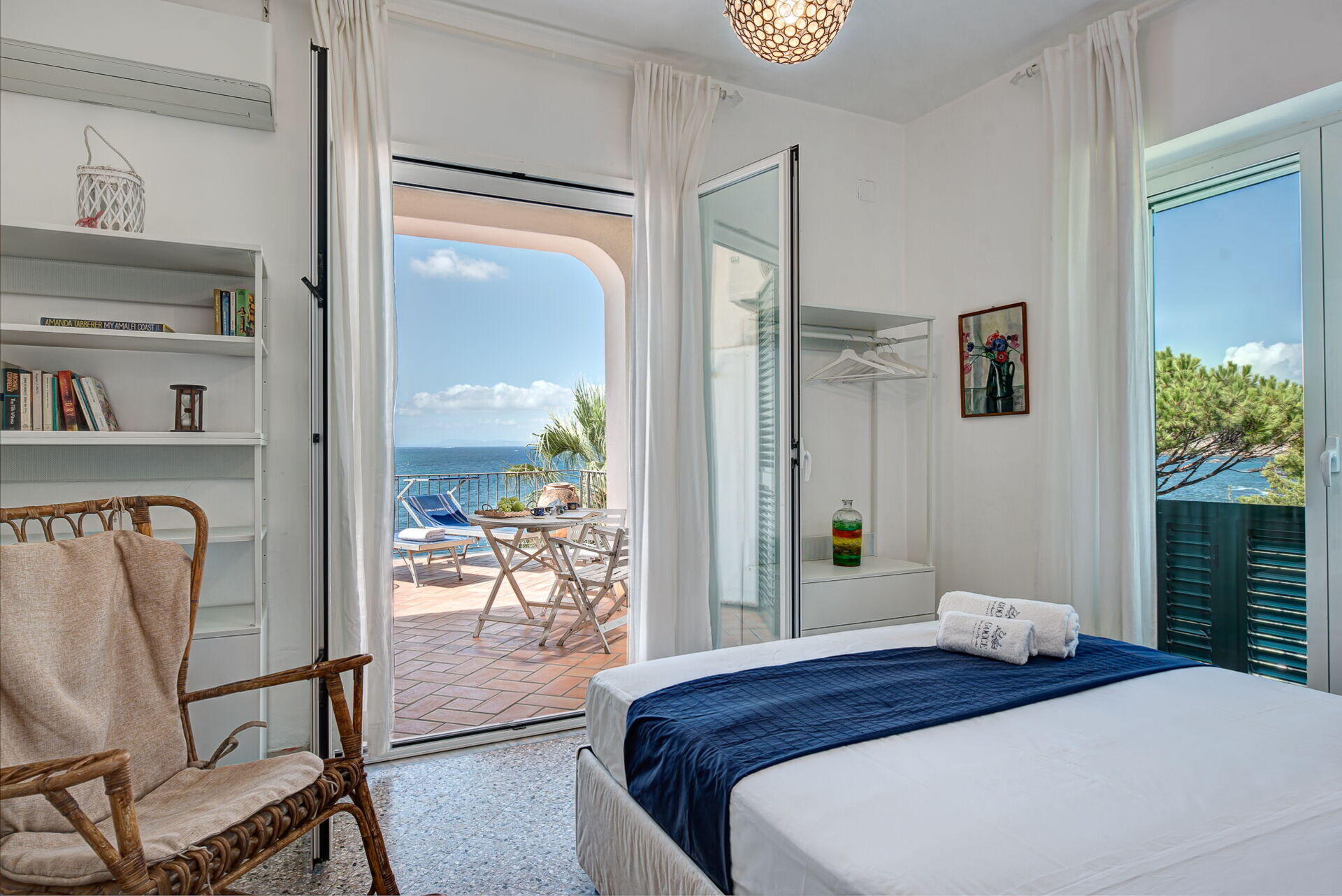 Located a short distance from the port of Marina della Lobra, this elegant flat offers an elevated position with breathtaking views of the Mediterranean Sea, perfect for those seeking a peaceful and authentic escape. Ideal for exploring the Sorrento and Amalfi Coast, it combines spaciousness with modern comforts. Its panoramic terrace overlooking the crystal-clear waters is perfect for relaxing, dining al fresco and enjoying the evocative sunsets. The bright and carefully furnished interior offers a cosy atmosphere. On the ground floor, you'll find a large open-plan living room, a dining room with sea views and a fully equipped kitchen with modern appliances, ideal for preparing home-cooked meals after a day at the beach. A single bedroom with en-suite bathroom is located on this level, while a staircase leads to the main sleeping area on the upper floor, where you will find two double bedrooms, both with en-suite bathrooms. The highlight of this flat is the private terrace of the master bedroom, furnished with sun loungers and outdoor furniture, from which you can enjoy endless sea views. The flat is equipped with air conditioning and Wi-Fi for maximum comfort.