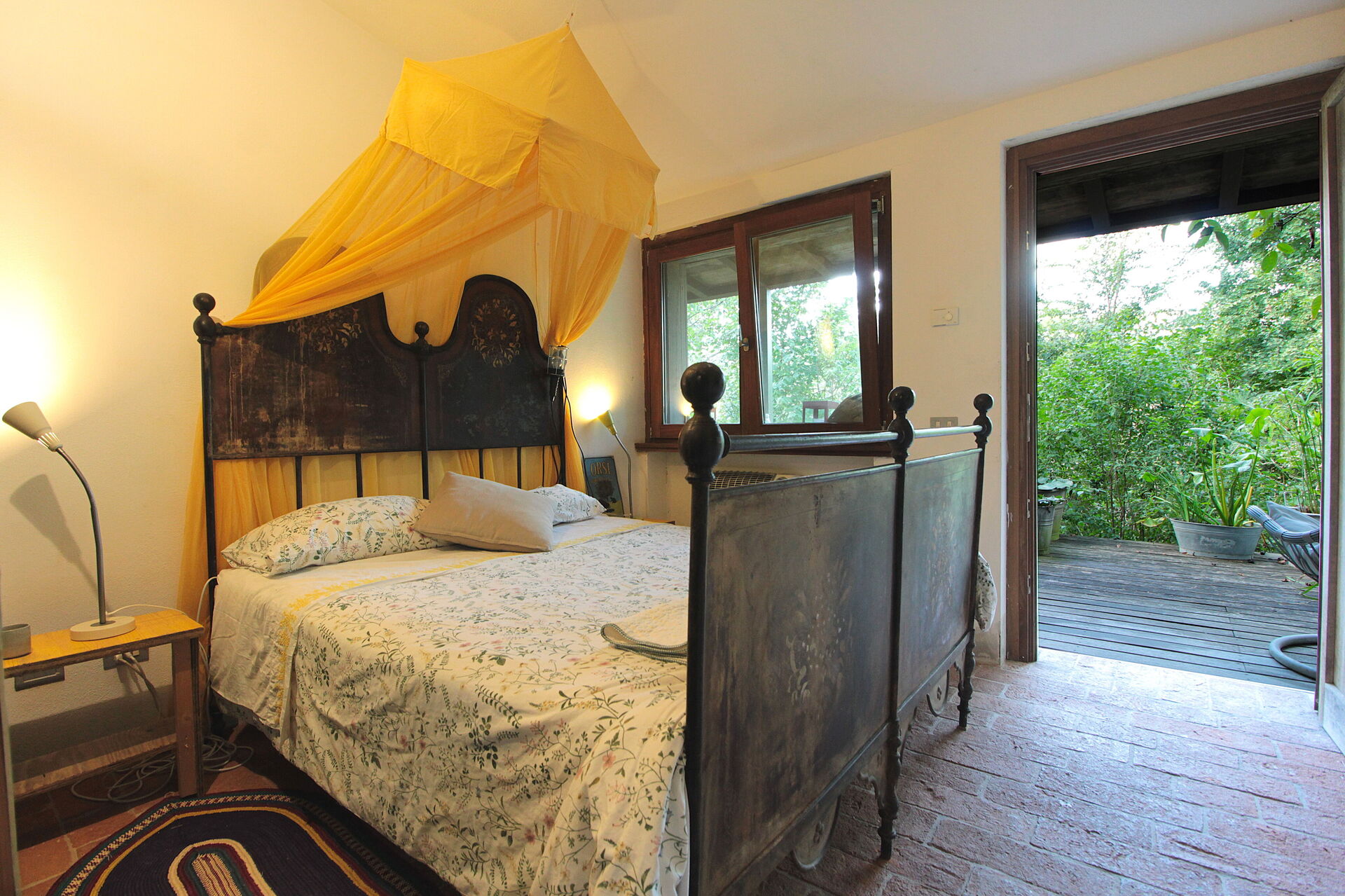 Large panoramic windows offer a charming view of the surrounding landscape. The ground floor, arranged in two wings, features a fully equipped kitchen and dining area with direct access to the outdoors, a furnished porch, a barbecue for outdoor lunches and dinners, and a double bedroom with en-suite bathroom. On the first floor, connected by internal stairs, there is a bright living room and three bedrooms with private bathrooms, arranged on split levels. In the garden, next to a natural stream, there is an independent guesthouse with a bedroom and bathroom. One internal staircase has no handrail.