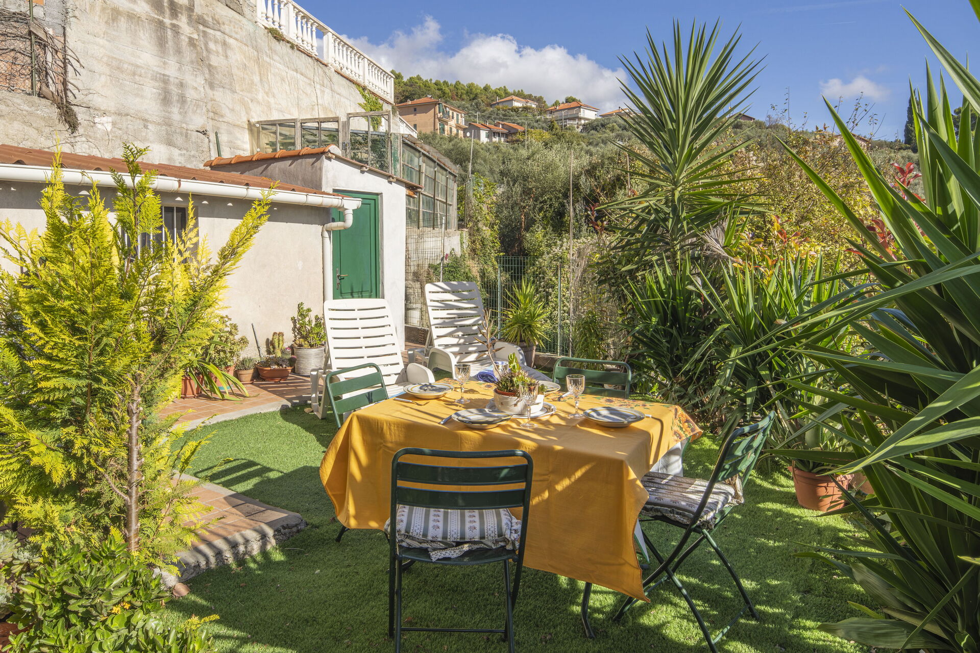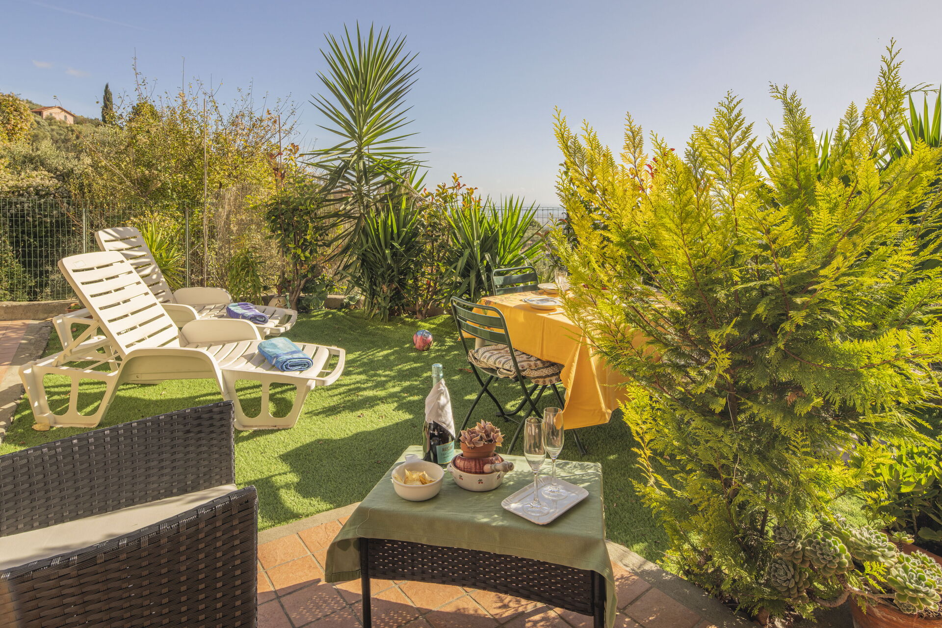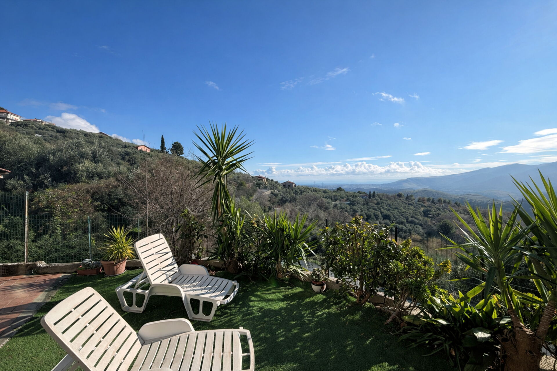 Raised ground floor apartment with private 30-square-meter terrace/garden and sea view, surrounded by the greenery and peace of the Ligurian countryside, just 15 minutes by car from the beaches and the centres of Alassio and Albenga.