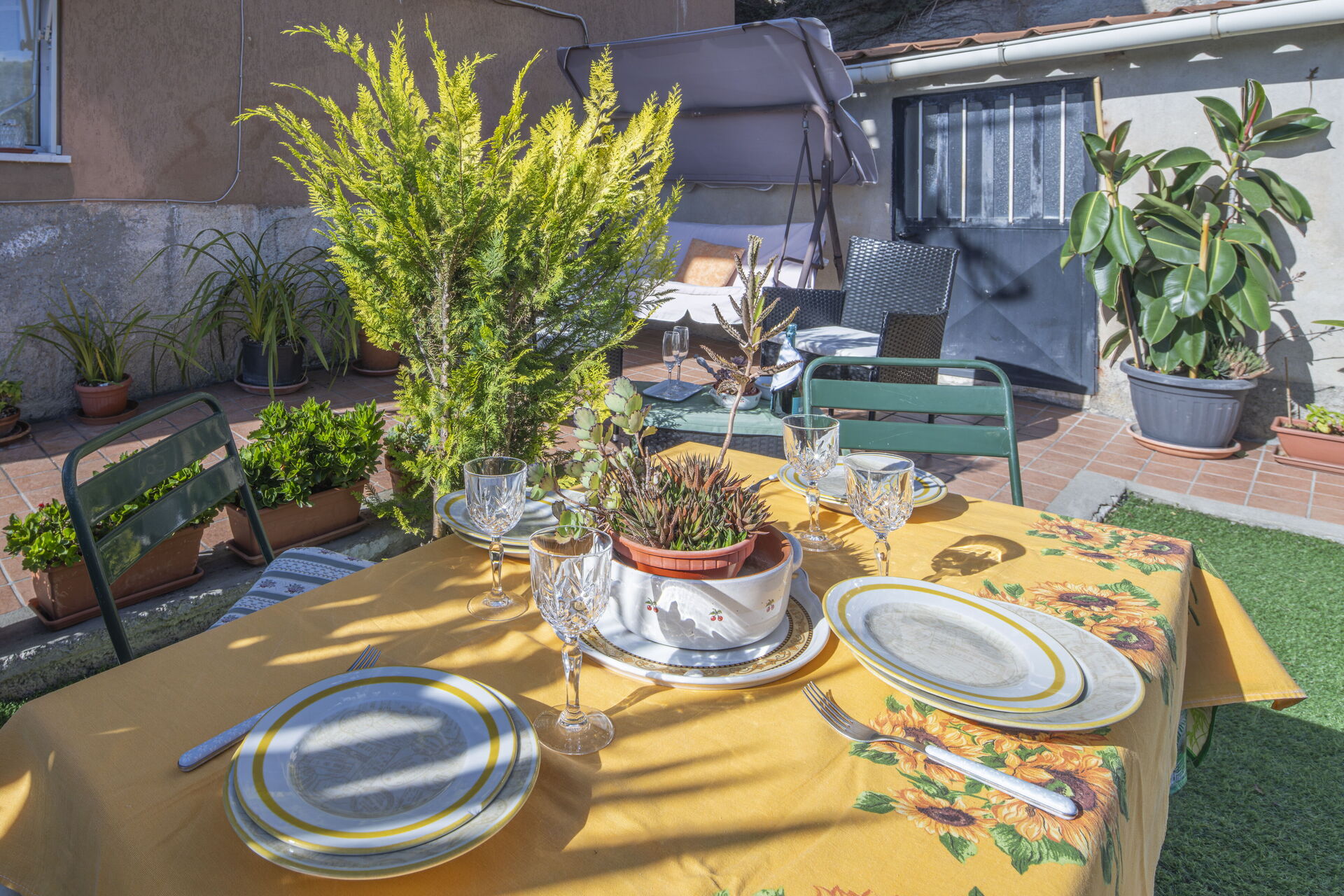 Outdoor area equipped with a dining table, parasol, deck chairs, lounge area with swing, barbecue, and table football.