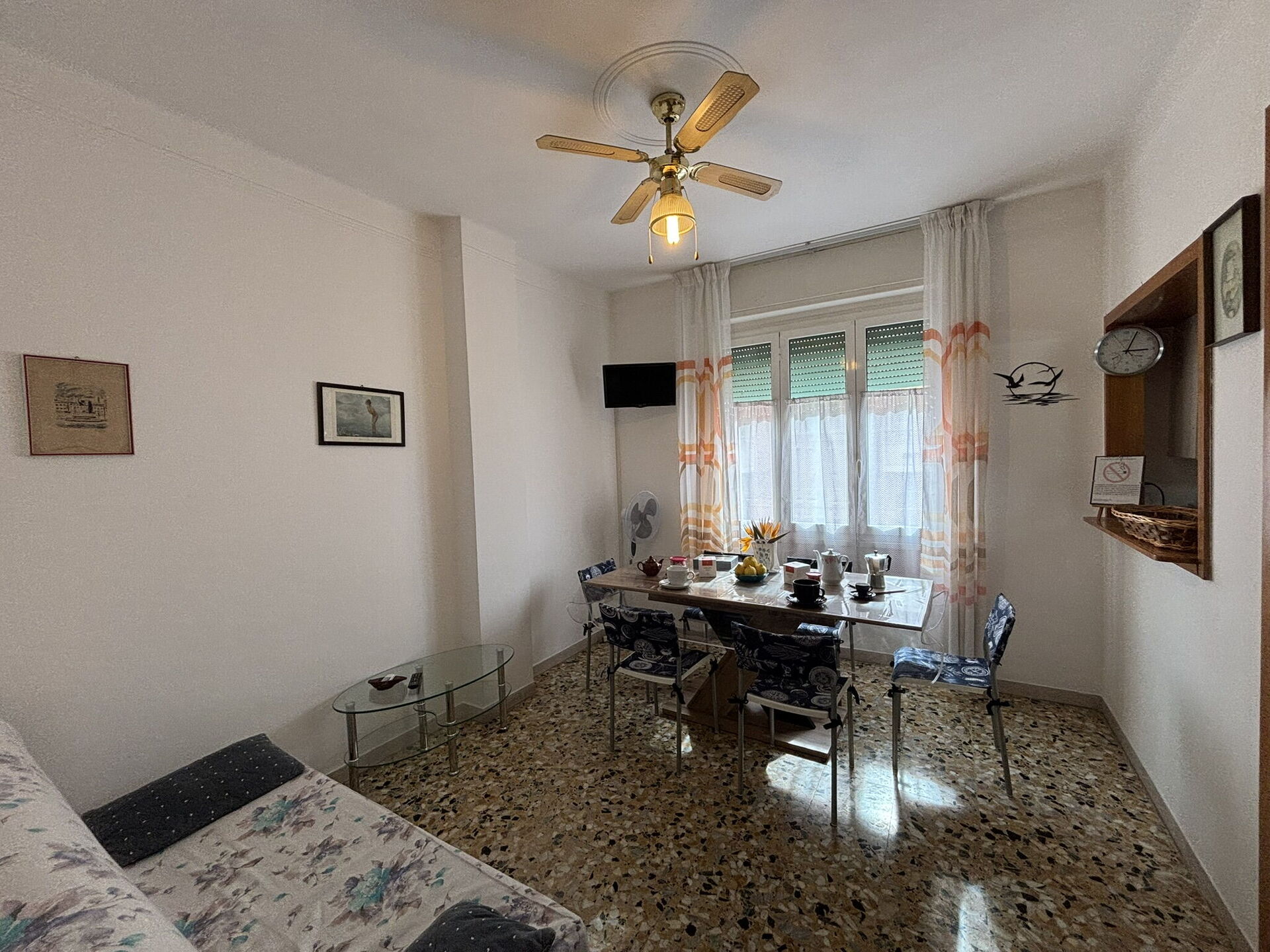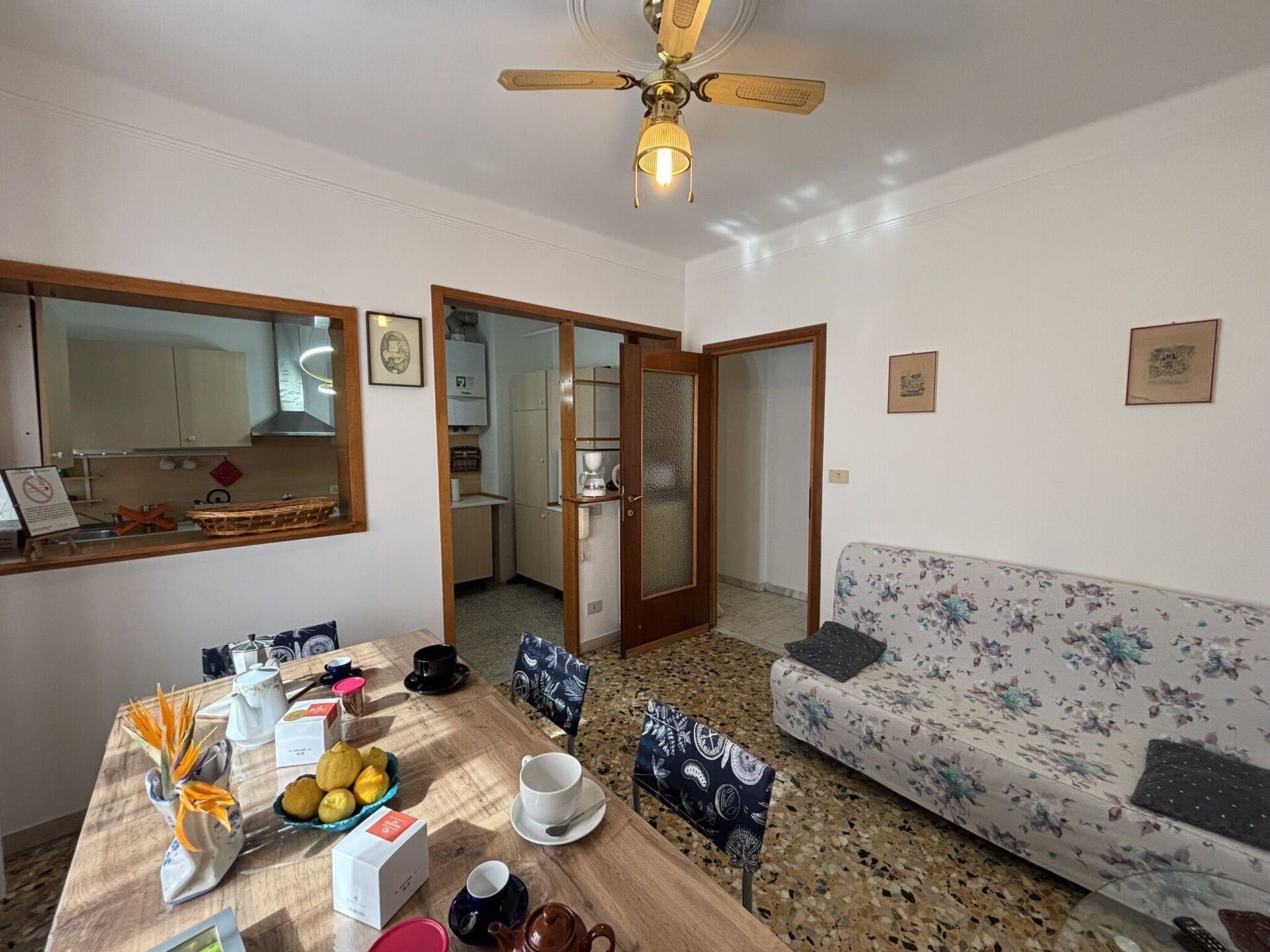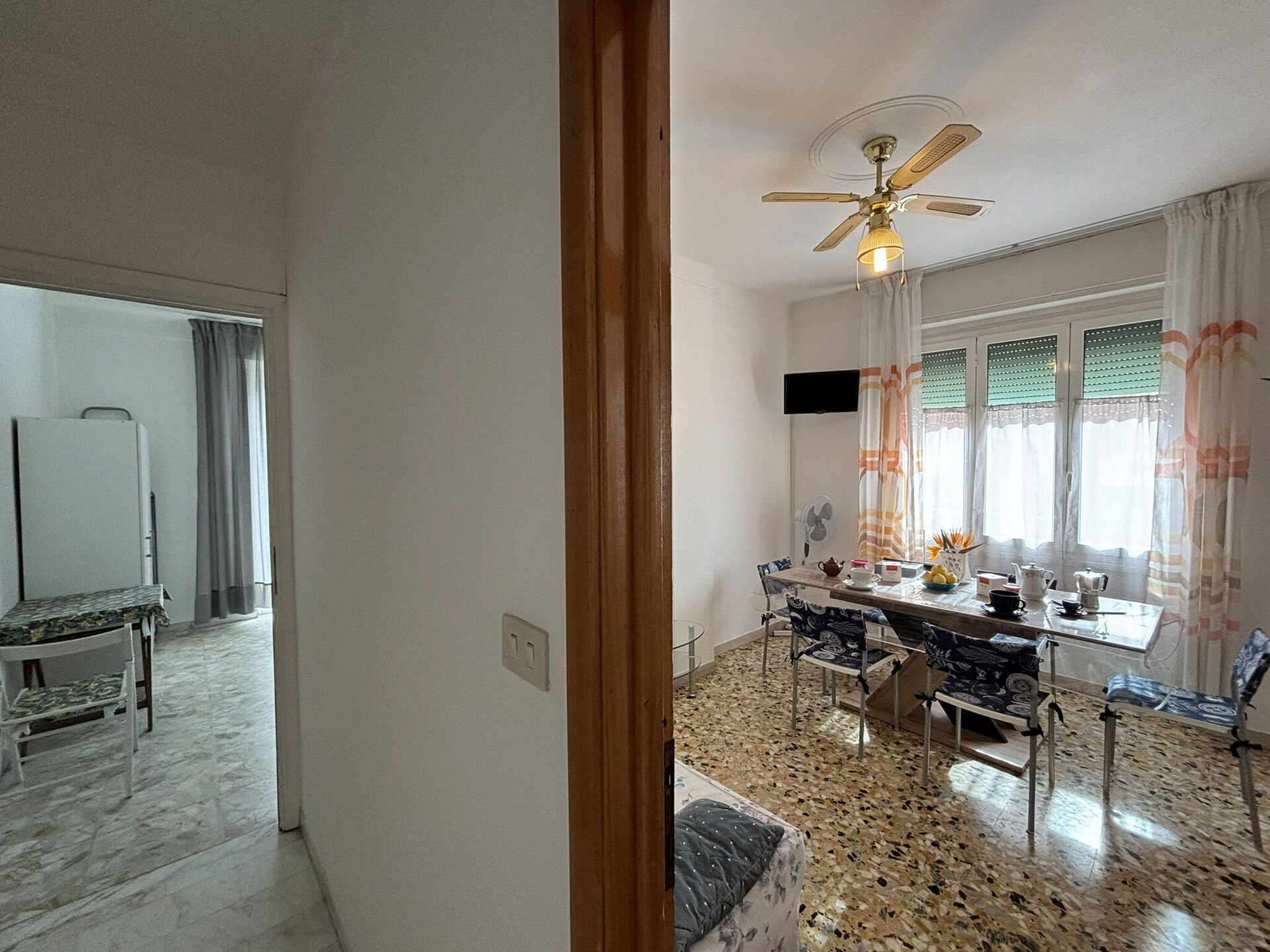 Spacious renovated apartment in the heart of Sanremo with sea-view terrace, just a few steps from the Sanremo Casino. Central and sunny location, ideal for a seaside holiday without a car. Within minutes on foot you can reach Piazza Eroi Sanremesi, the city market, restaurants, cafés, shops, cycle paths, beaches, and cultural attractions. The apartment is located on the third floor with elevator access. It features two large terraces with outdoor lounge seating and a dining table.