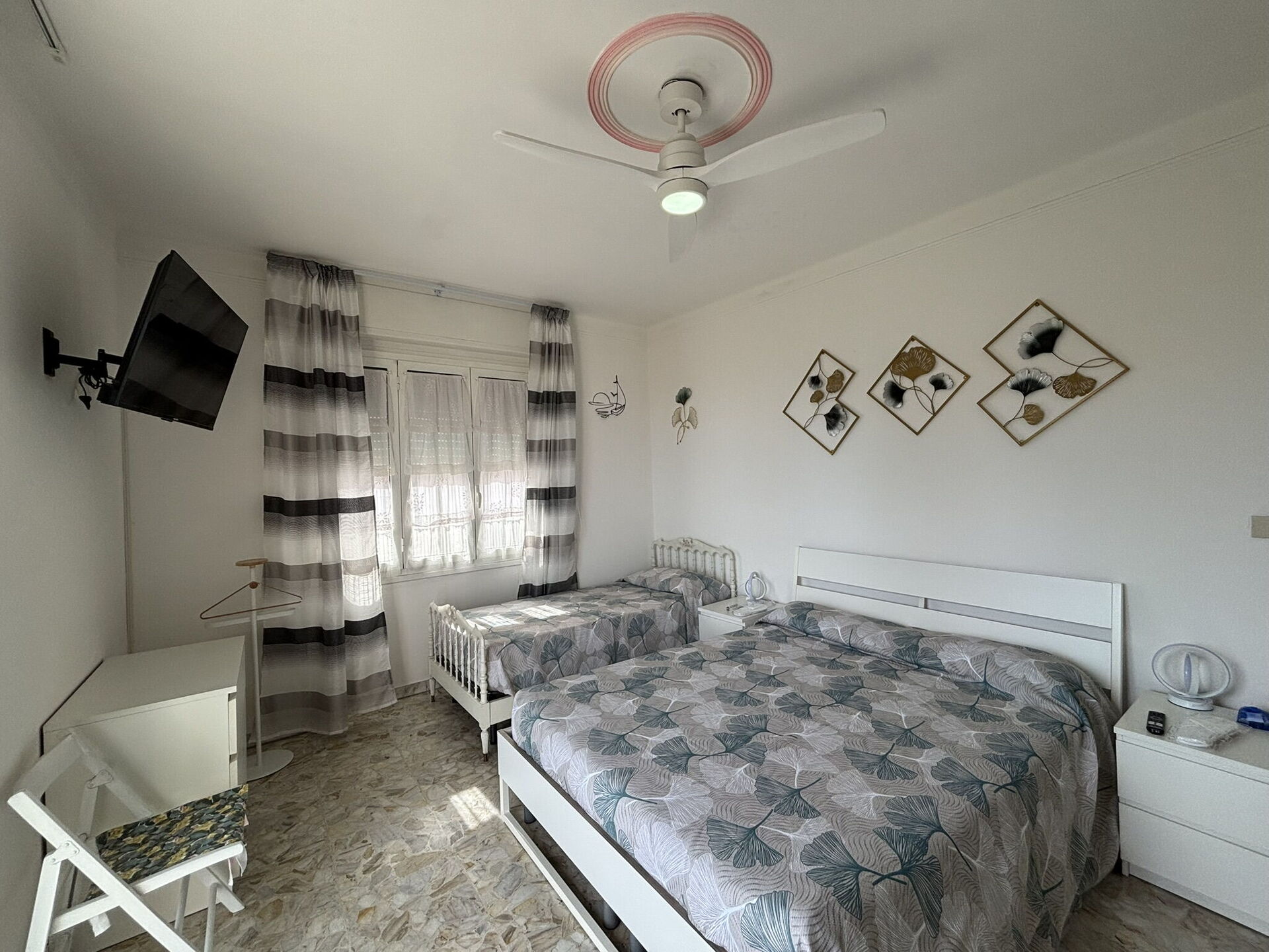 Inside, a fully equipped kitchen with microwave, toaster, kettle, and washing machine. Dining area with table, sofa, and television. Two bedrooms: one double bedroom with TV and sea view, and one bedroom with two single beds (can be joined together) and TV. Bathroom with bathtub and shower. The apartment is equipped with ceiling fans, portable fans, iron, Wi-Fi, 3 TVs, and double-glazed windows. Pets are welcome.