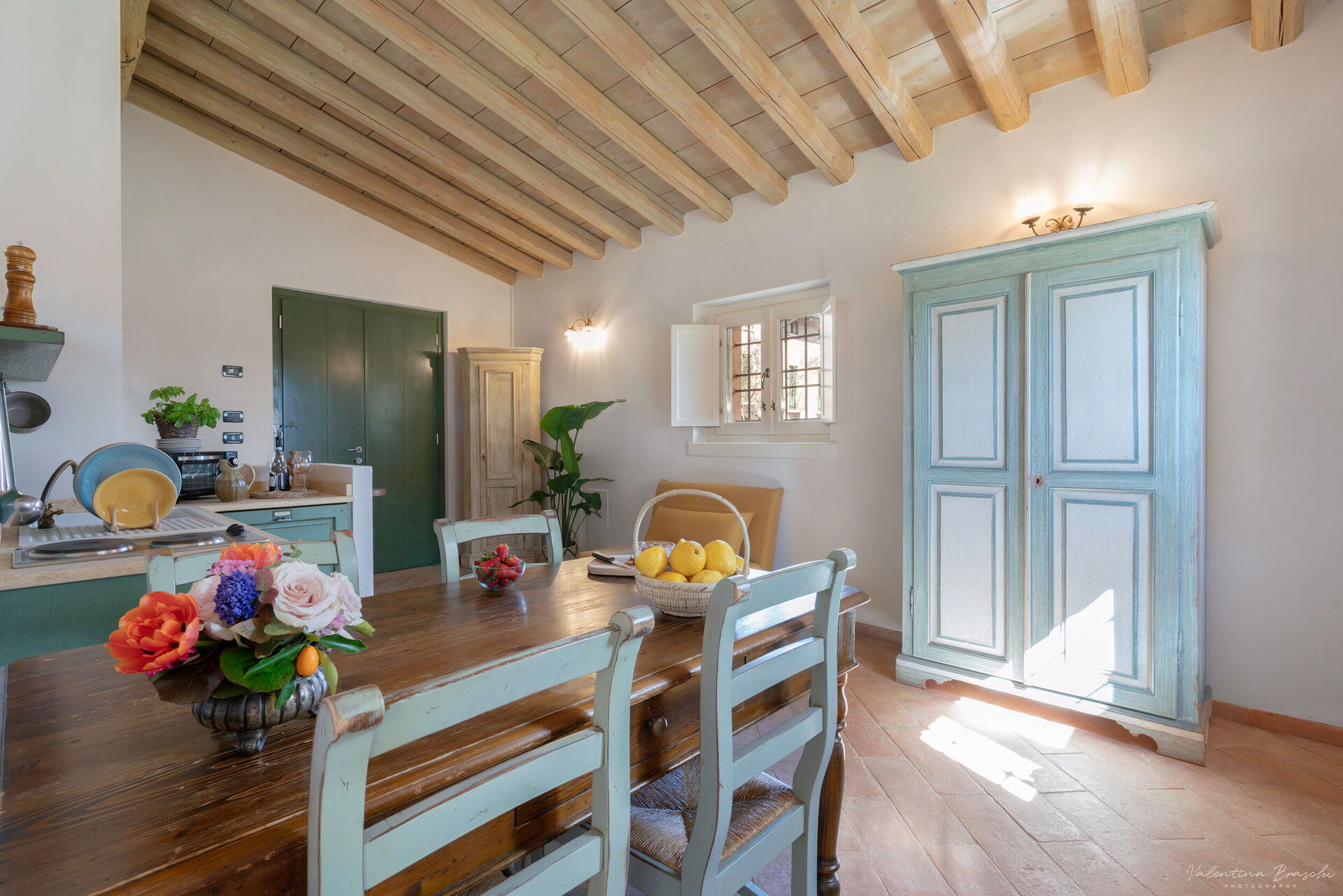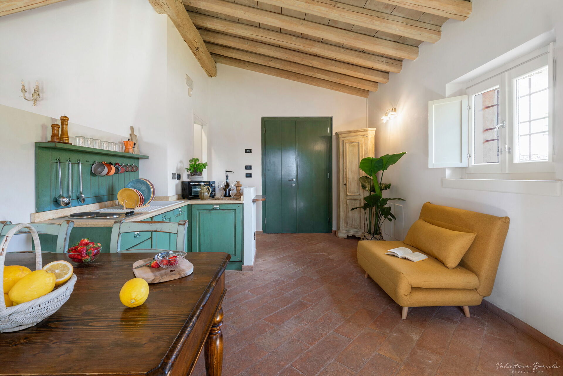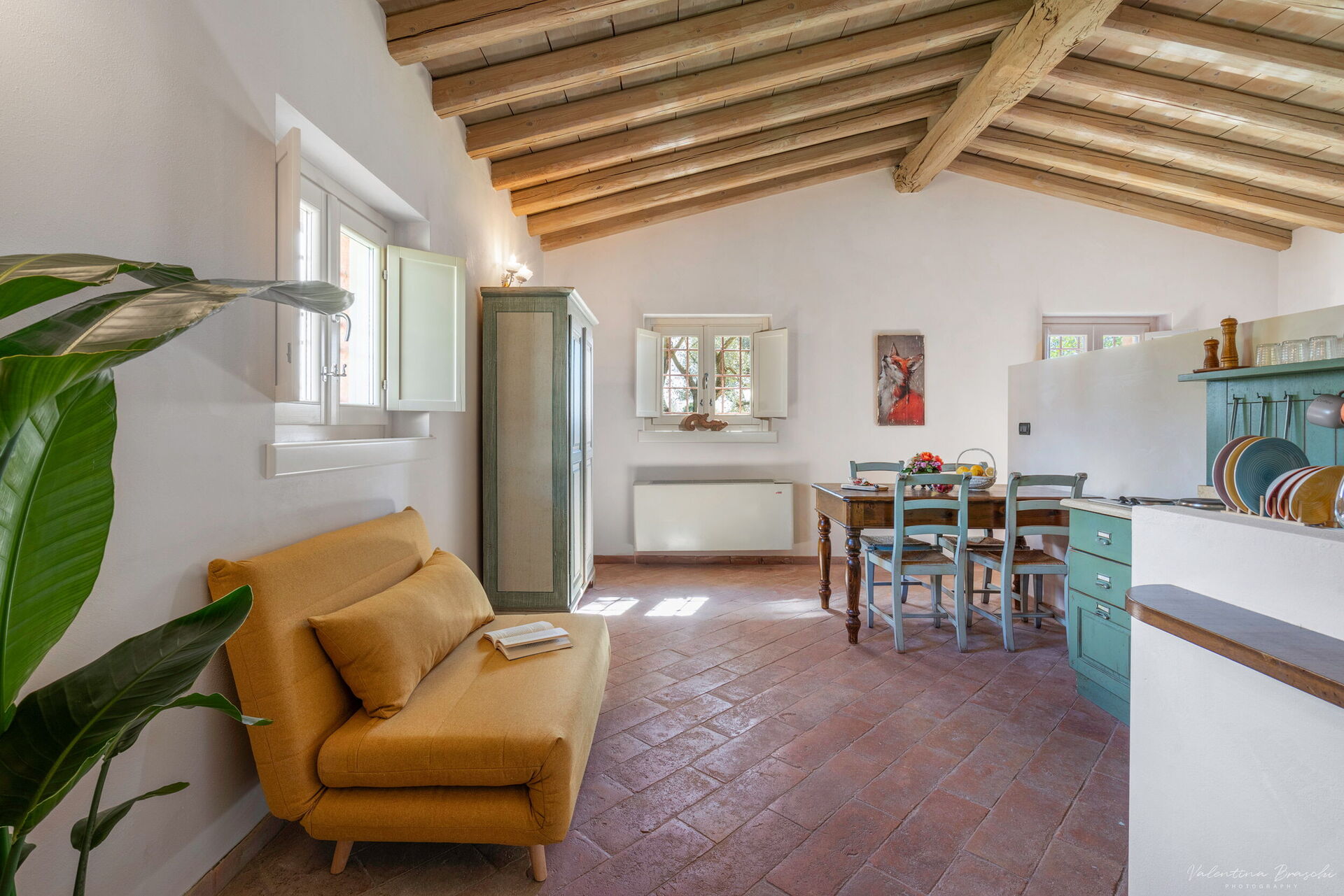 Studio cottage equipped with a fully fitted kitchen, including a dishwasher, dining table, and a comfortable single sofa bed. The space, functionally organized, is divided by a wall separating the living area from the sleeping area. Double bed. Bathroom with shower. Private outdoor space furnished with garden furniture.