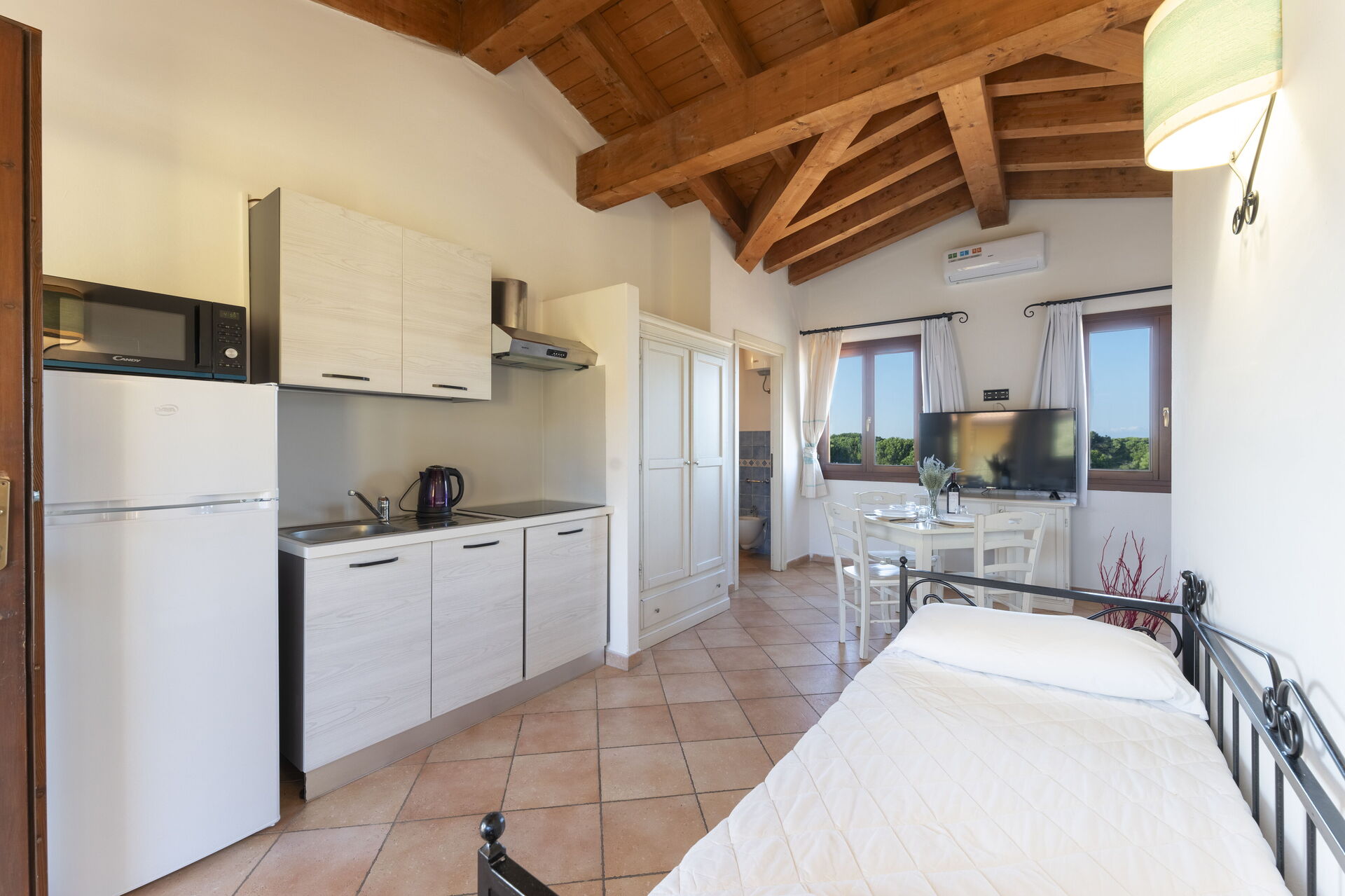 The flats consist of a living room with a kitchenette equipped with an induction hob, 2 single beds (which can be joined), a single sofa bed and a bathroom with shower. Although the flats are of the same type, they may differ in terms of furnishings and equipment.