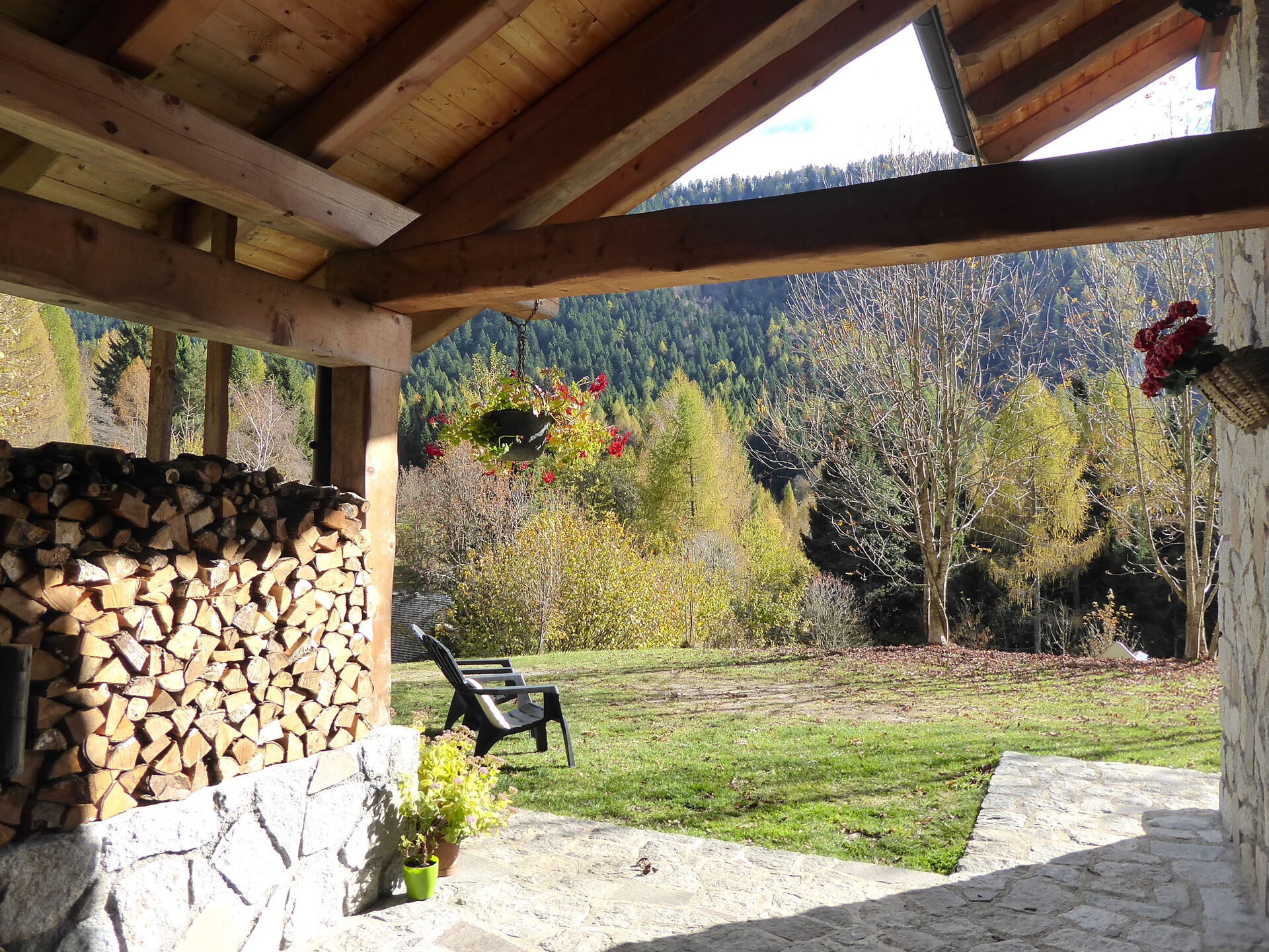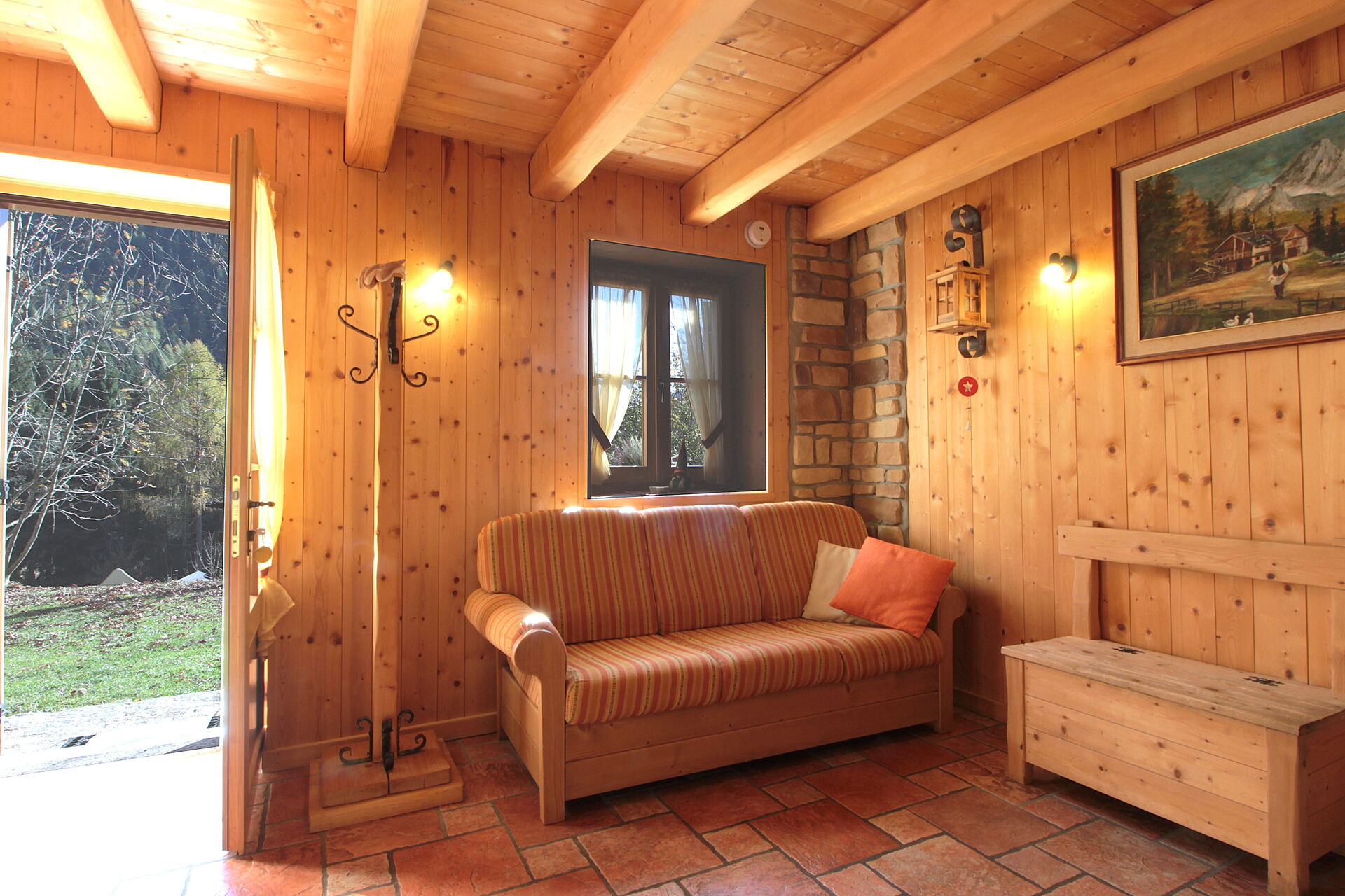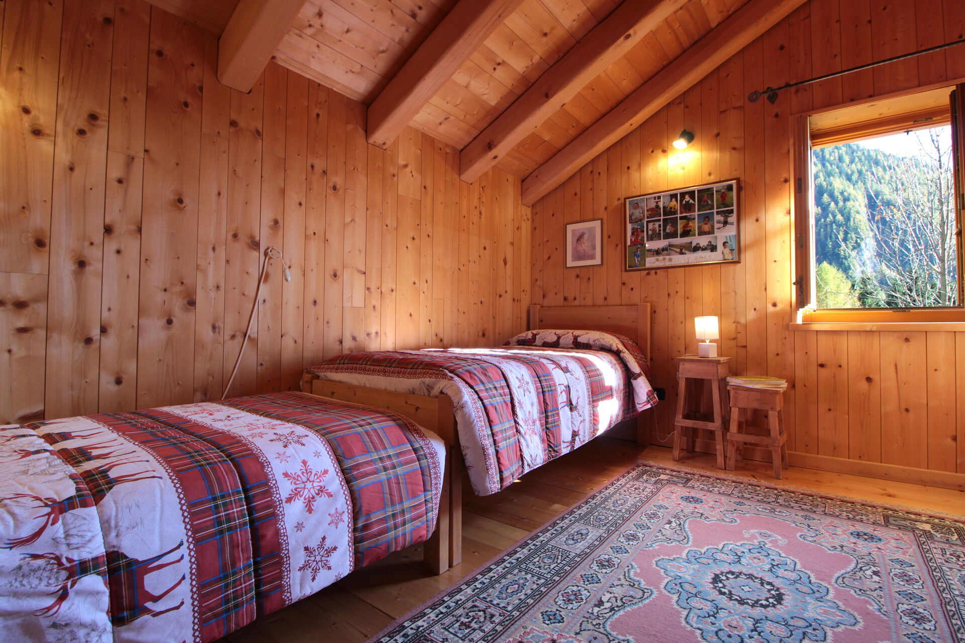 The chalet is built in wood and stone: on the ground floor there are the kitchen with an electric oven/dining room, the living room, the cellar, and a small service bathroom. A wooden staircase leads to the upper floor, where there are two bedrooms (one double and one with three beds one of which is foldable) and the bathroom with shower and washing machine.There is a ventilated wood-burning fireplace with fans that distribute the warm air.