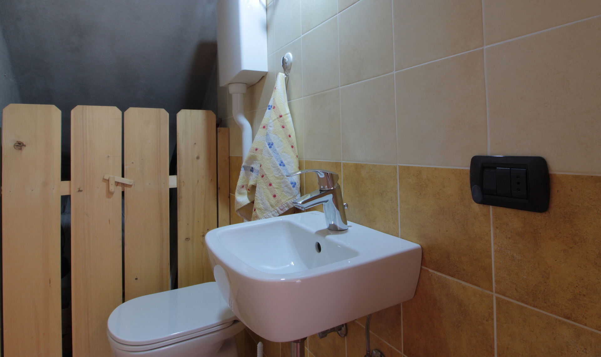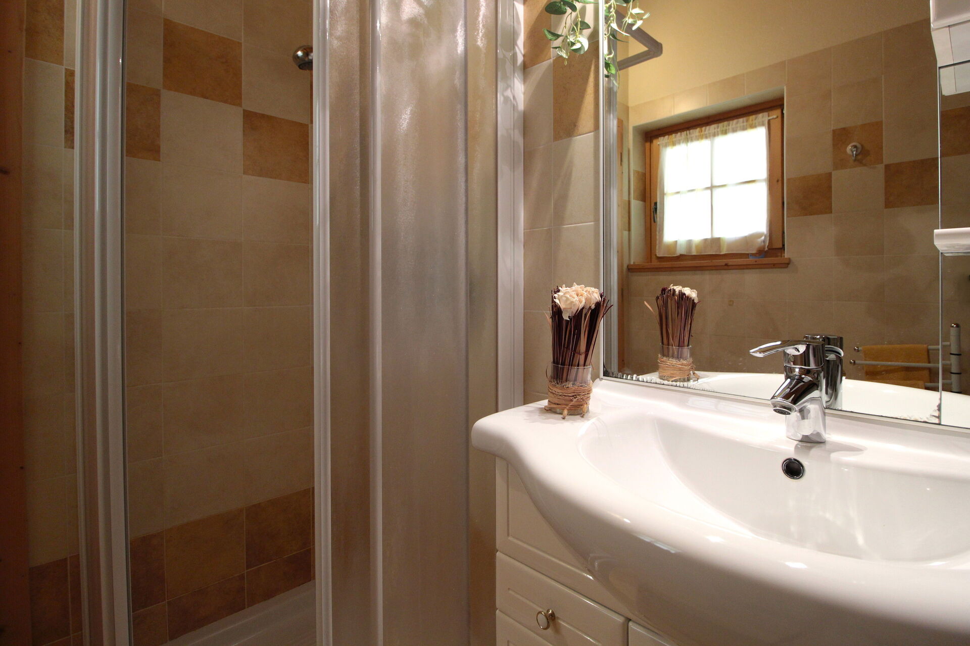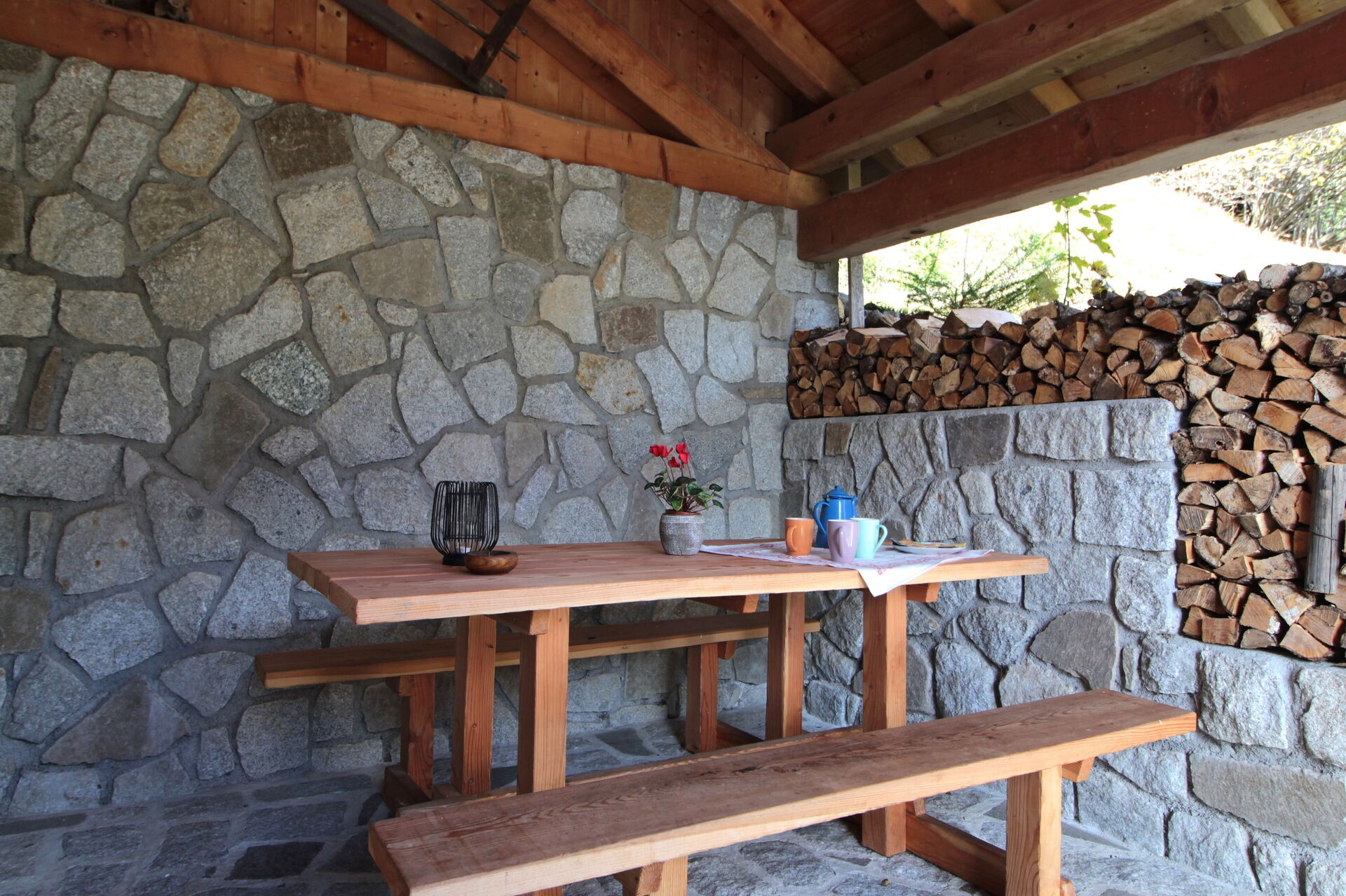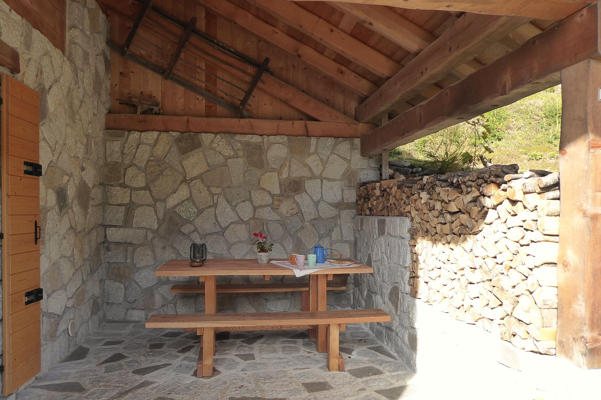 The chalet is built in wood and stone: on the ground floor there are the kitchen with an electric oven/dining room, the living room, the cellar, and a small service bathroom. A wooden staircase leads to the upper floor, where there are two bedrooms (one double and one with three beds one of which is foldable) and the bathroom with shower and washing machine.There is a ventilated wood-burning fireplace with fans that distribute the warm air.