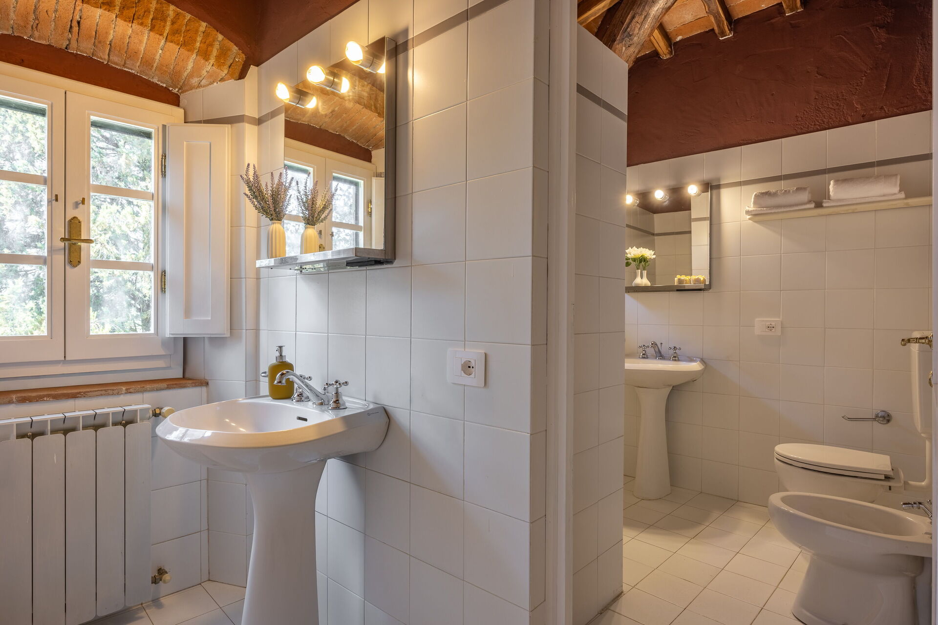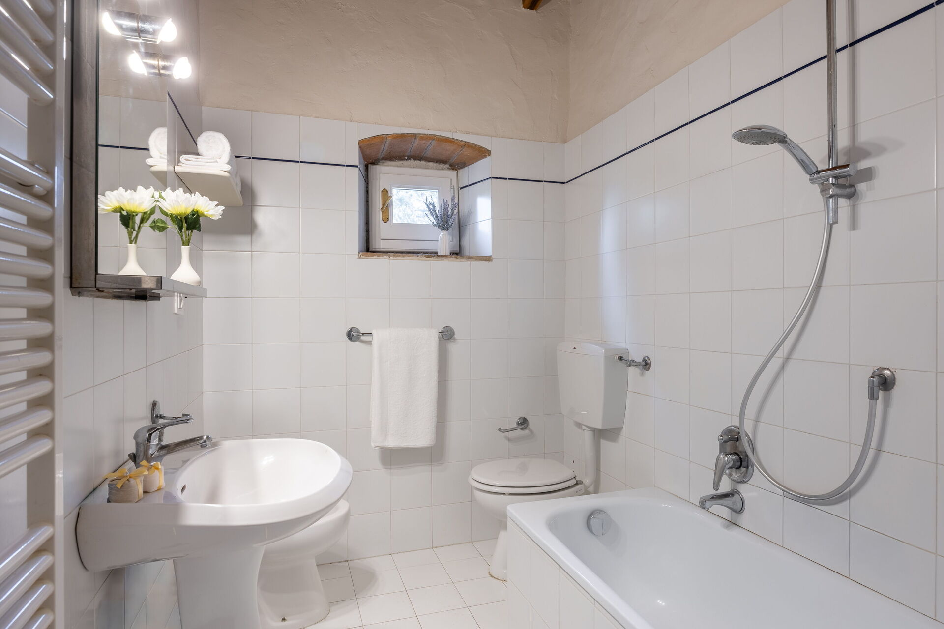 First floor (15 steps): small furnished terrace; kitchen/living room with single sofa bed, 1 single bedroom, 2 double bedrooms, 1 bathroom with dressing room and shower, 1 bathroom with tub.