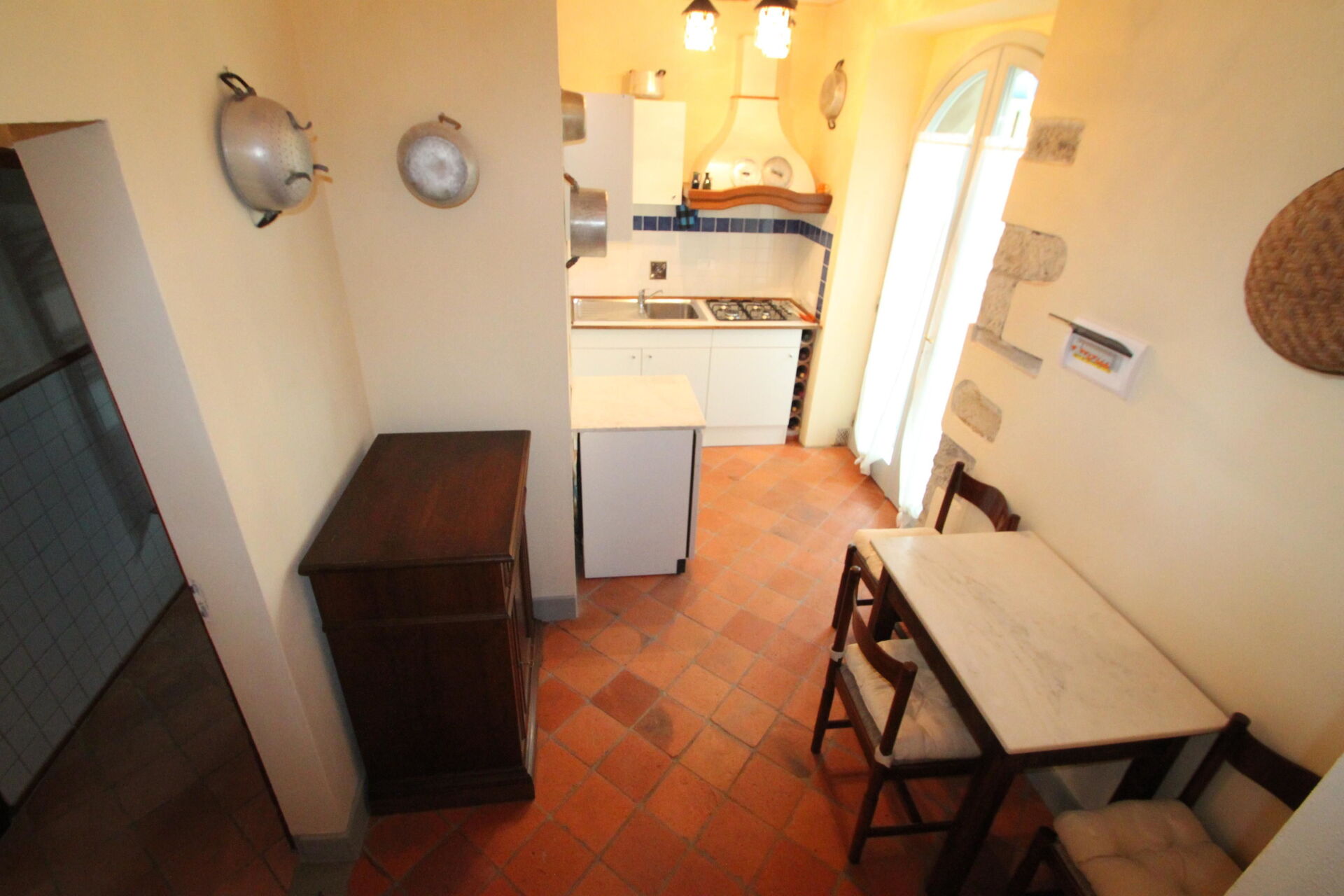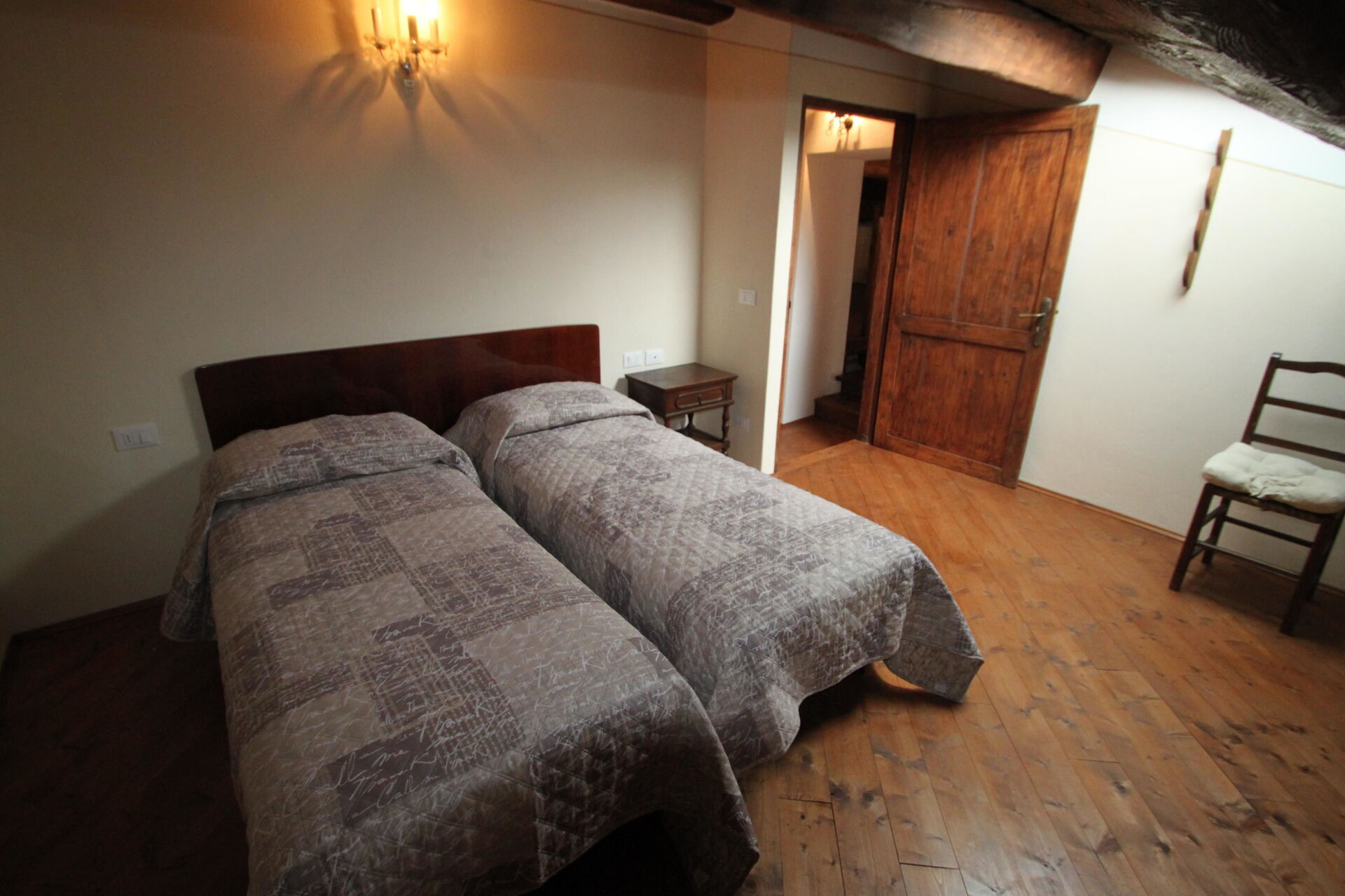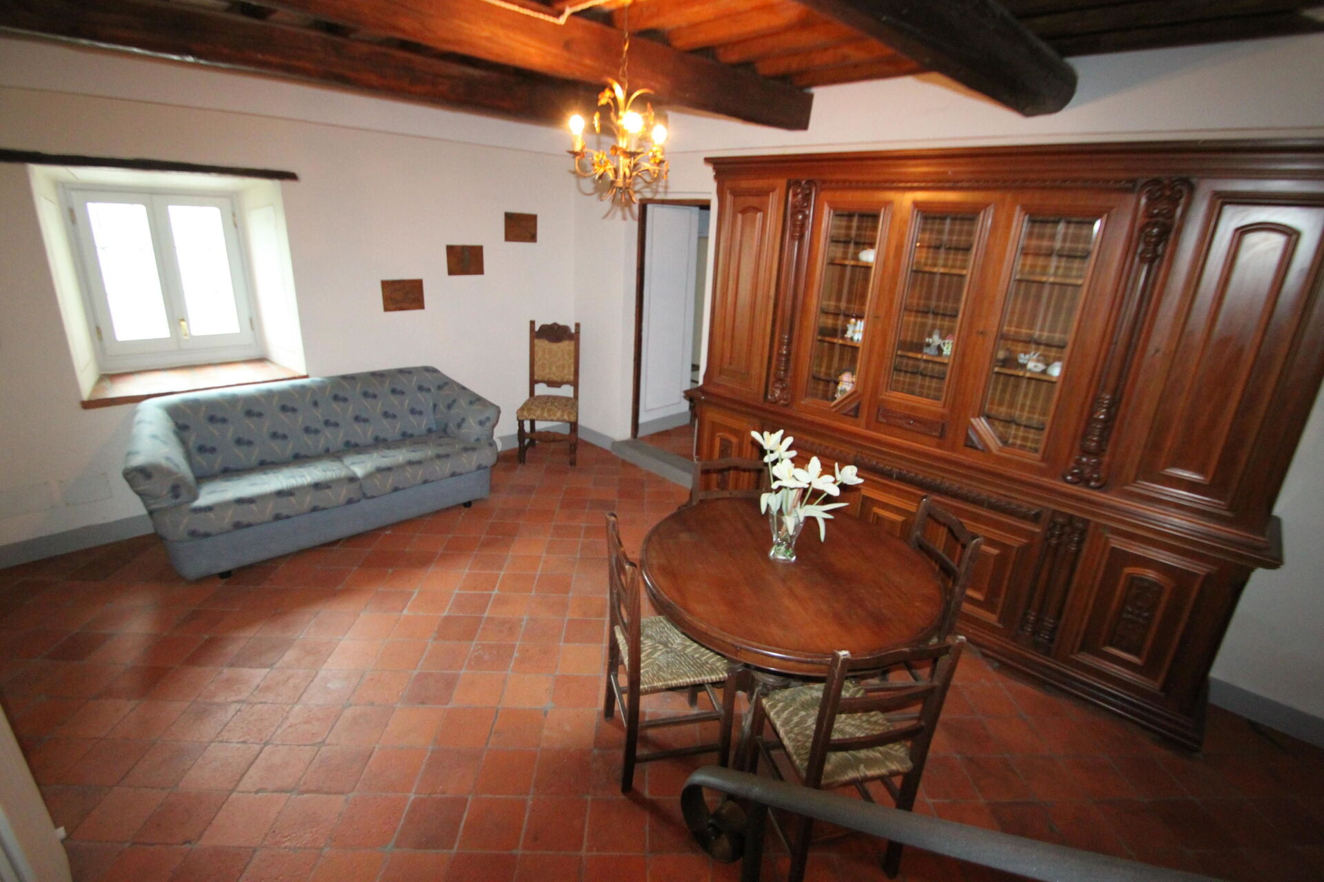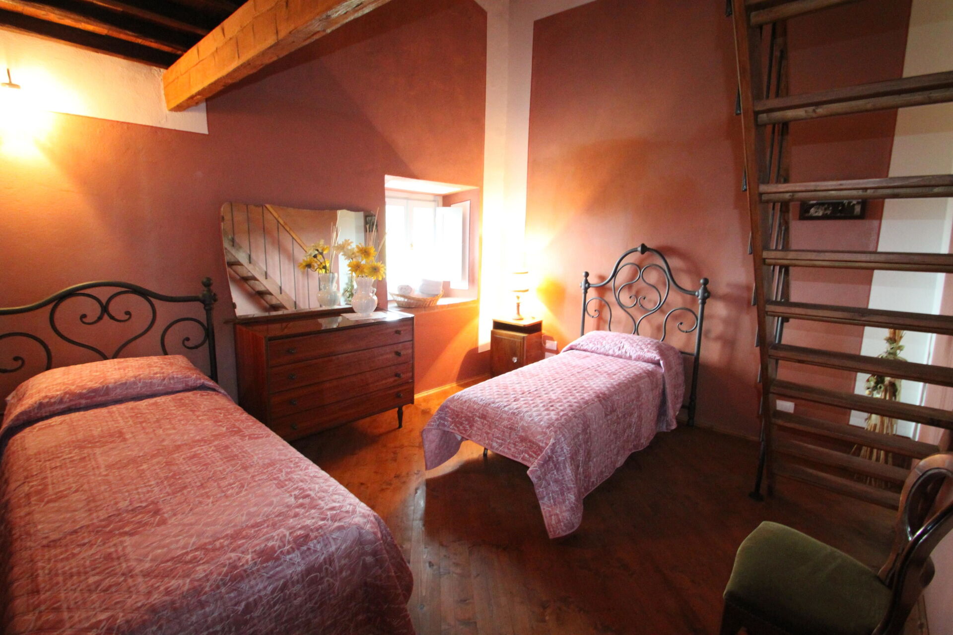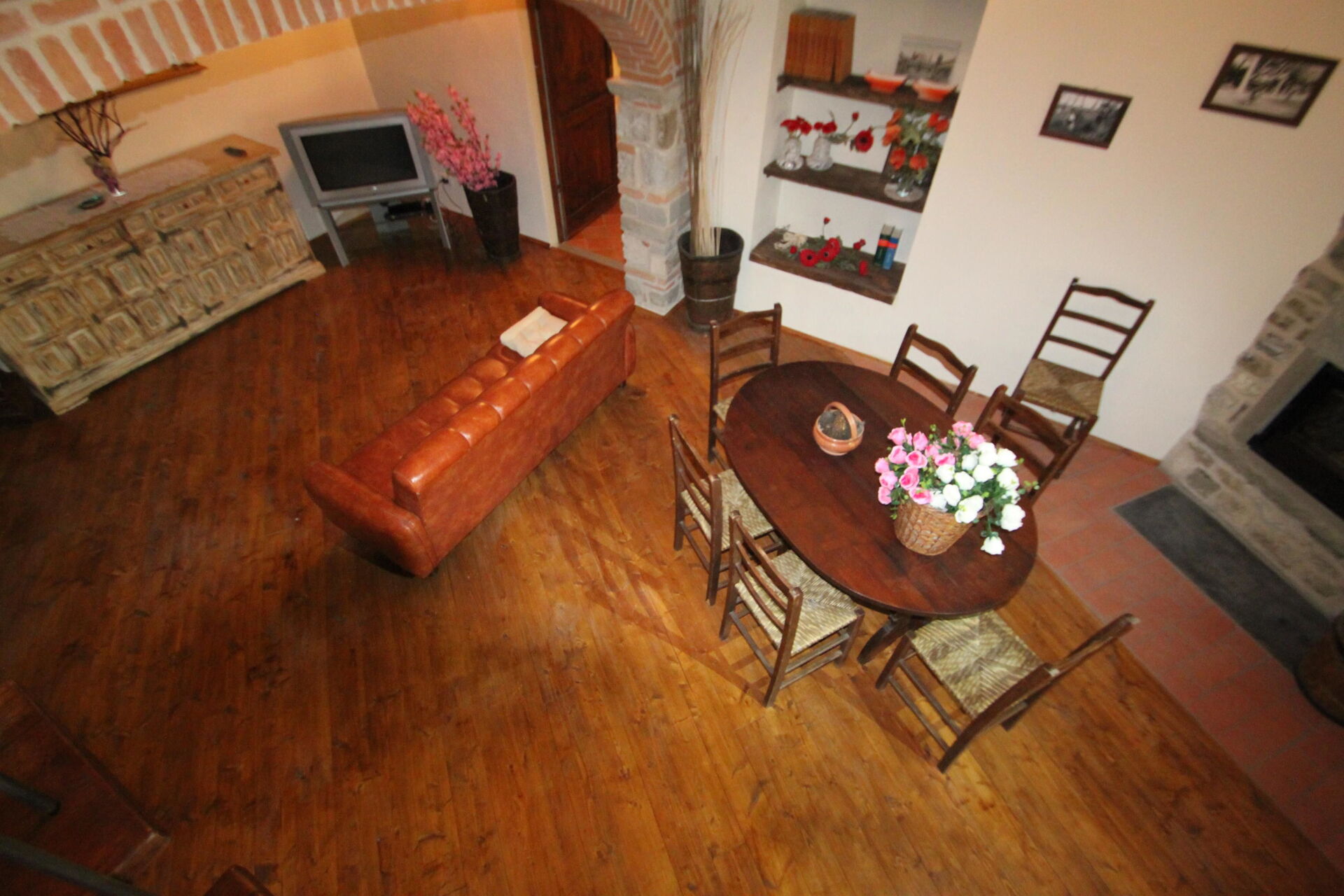 At the ground floor: access with stone staircase to the first floor; dining room with fireplace and satellite TV; kitchen with four burner stove, oven, refrigerator, freezer, dishwasher; 1 double bedroom; 1 bedroom with two single beds room opening onto a covered loggia; living room.