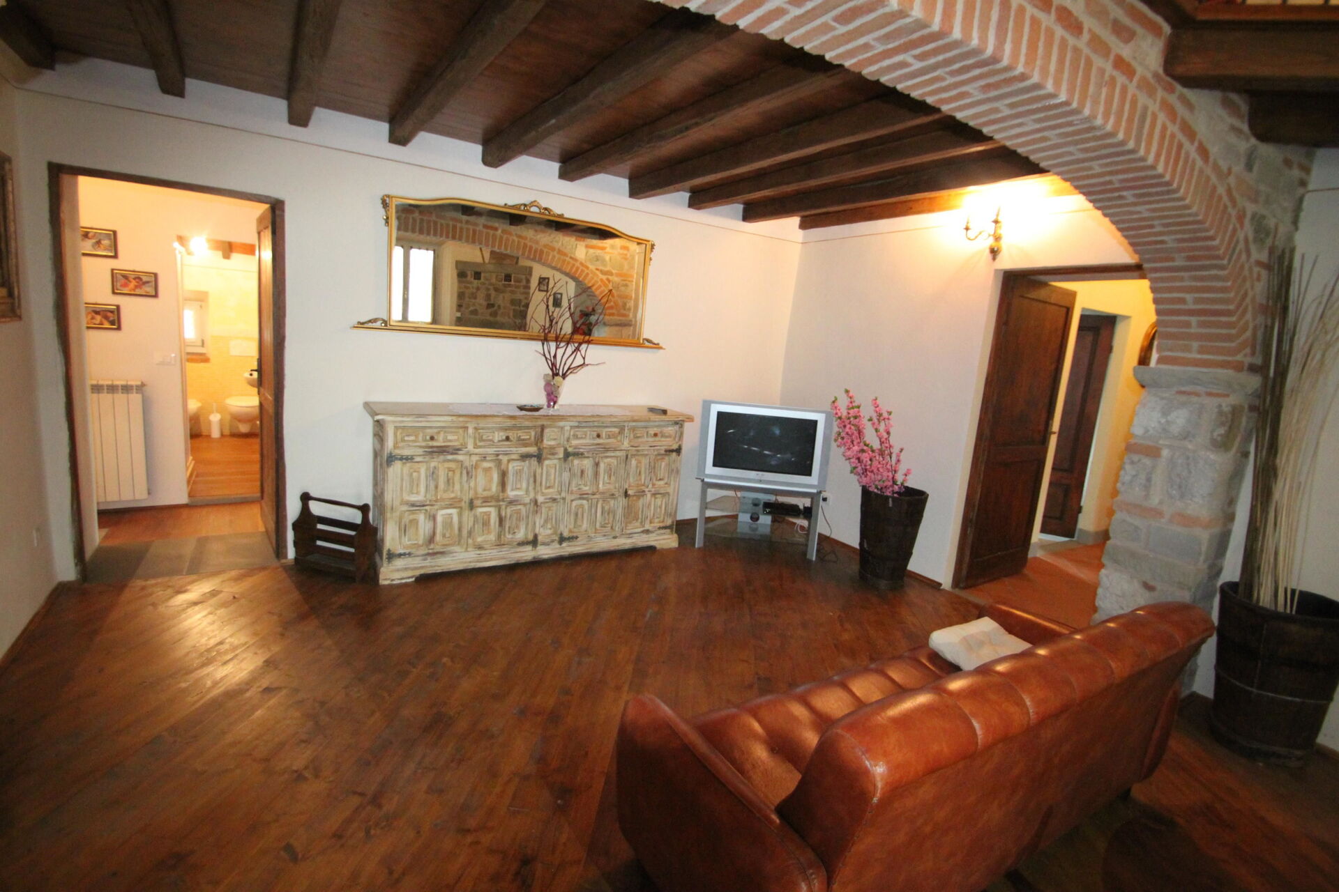 On the first floor: service kitchen with four burner stove and refrigerator; 2 double bedrooms; 1 bedroom with two single beds; 1 bedroom with two single beds and a loft where we find another single bed; large living room with fireplace and satellite TV, which is opened on the covered loggia; 2 bathrooms with shower (toilet / bidet); 1 bathroom with bath (toilet / bidet).