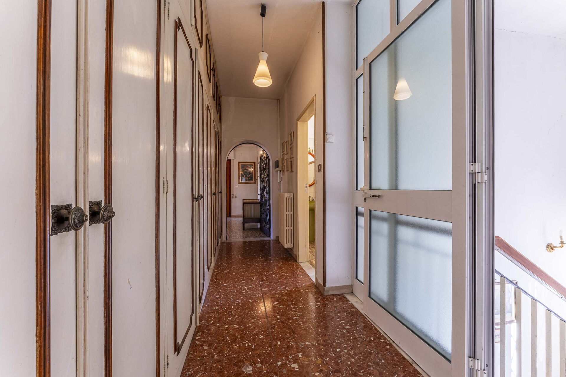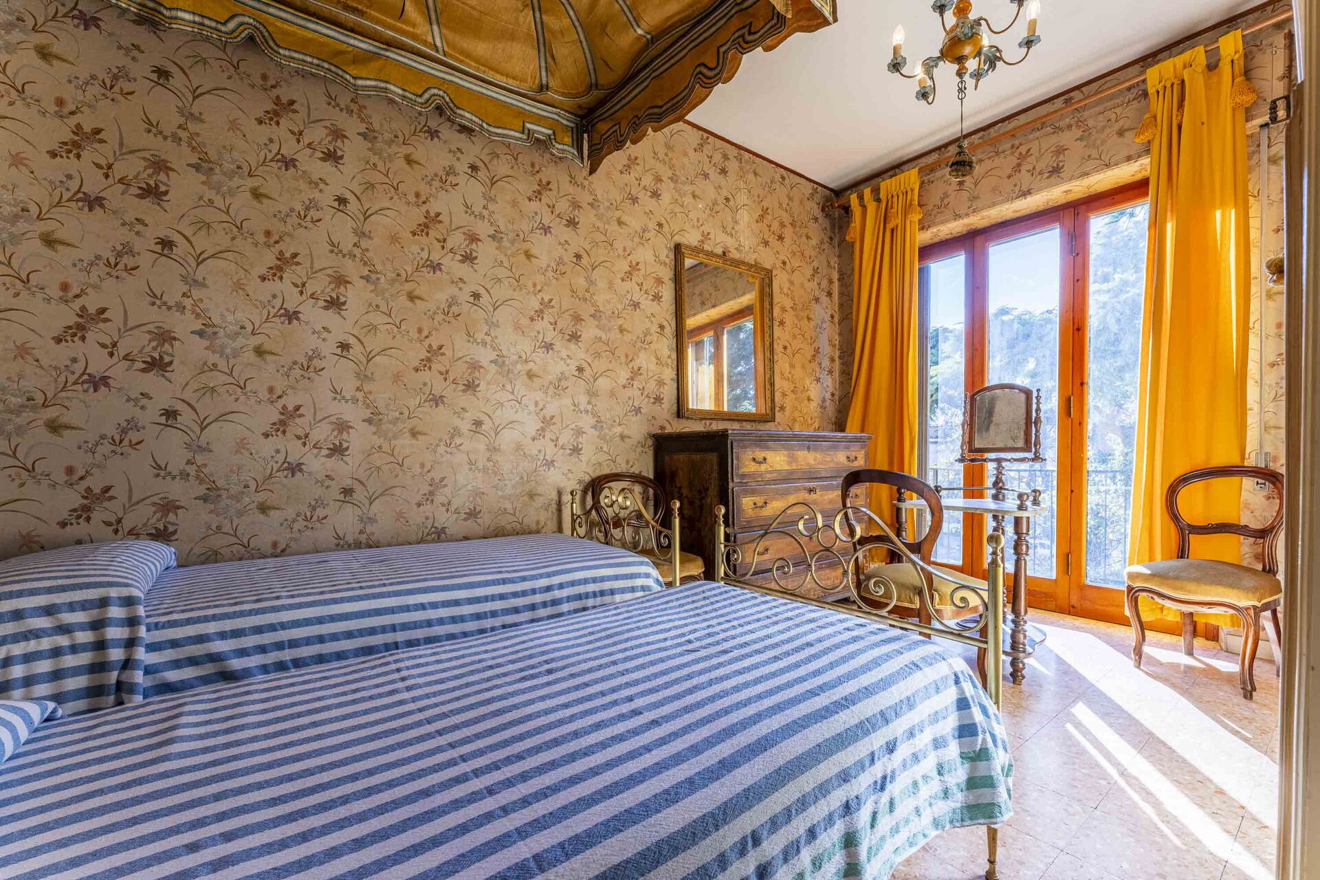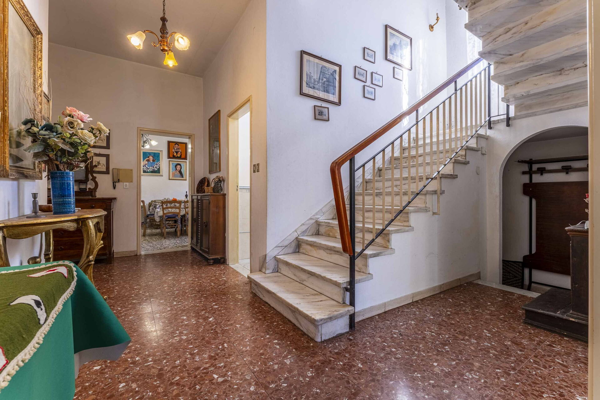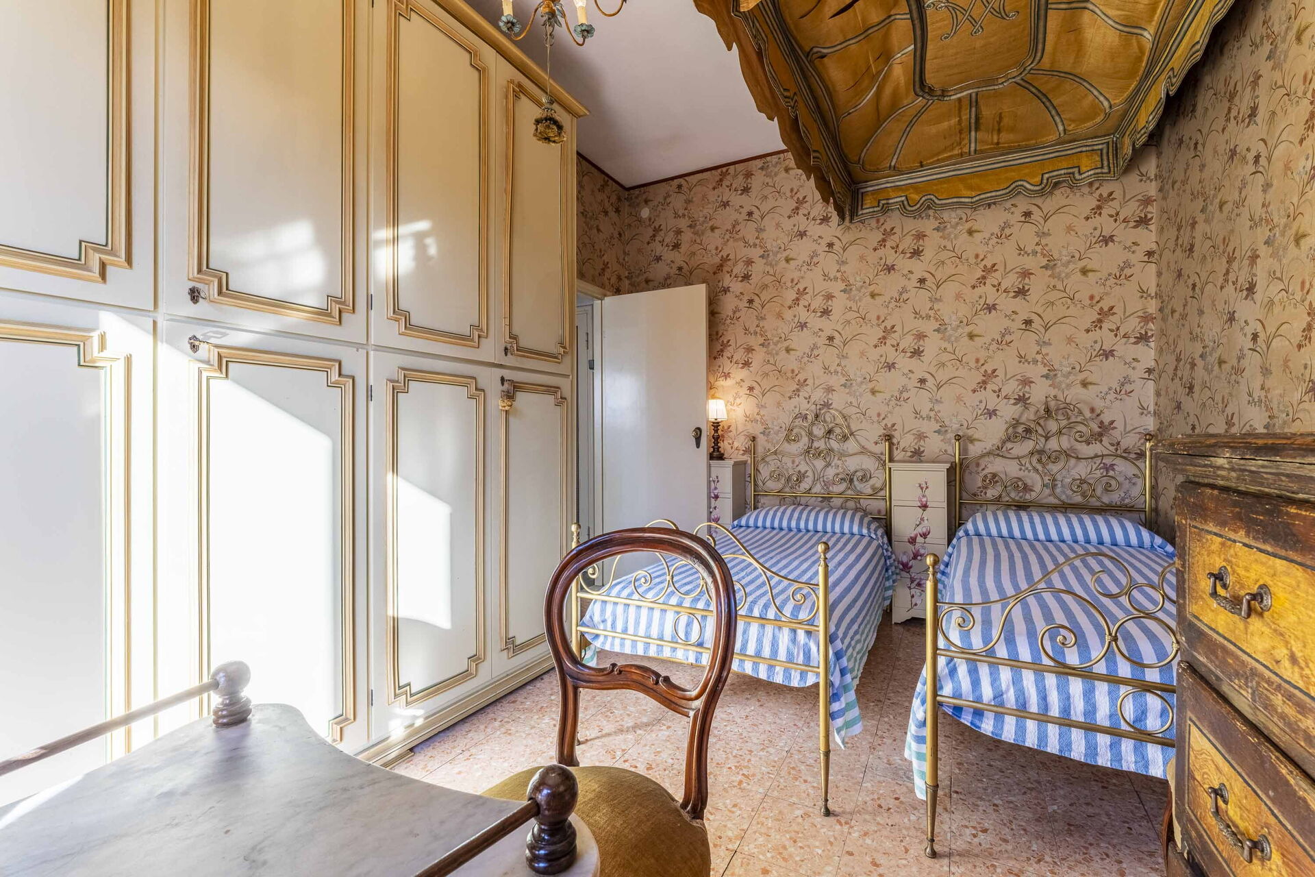 On the second level, reached by a marble staircase, you will find the kitchen with dining room and TV room with access to the balcony. The sleeping area features two double bedrooms and one twin bedroom with 2 single beds. Present are two bathrooms with bathtubs.