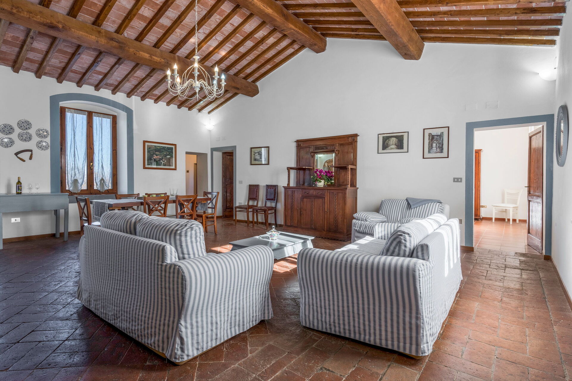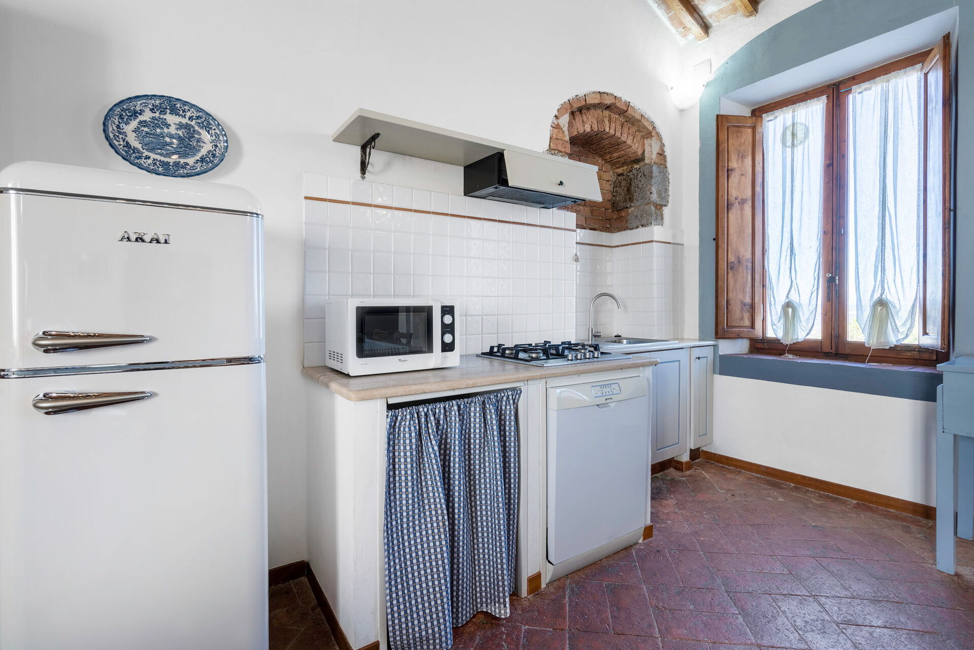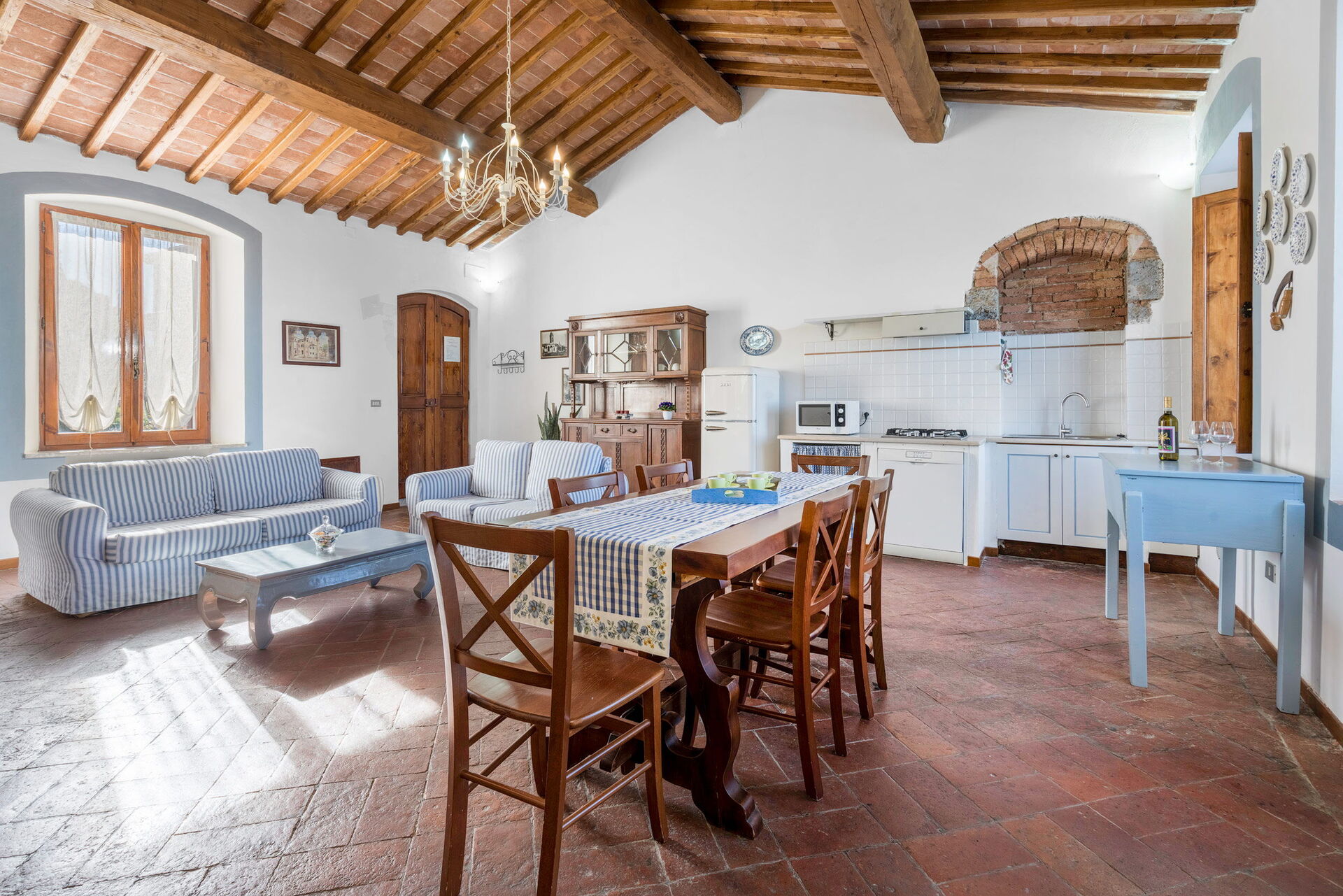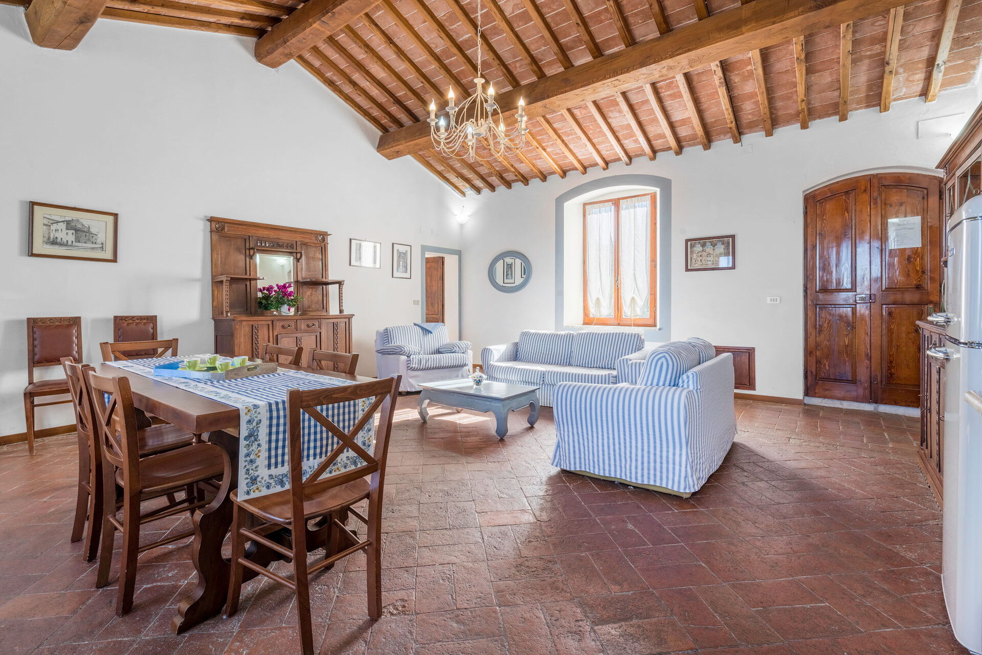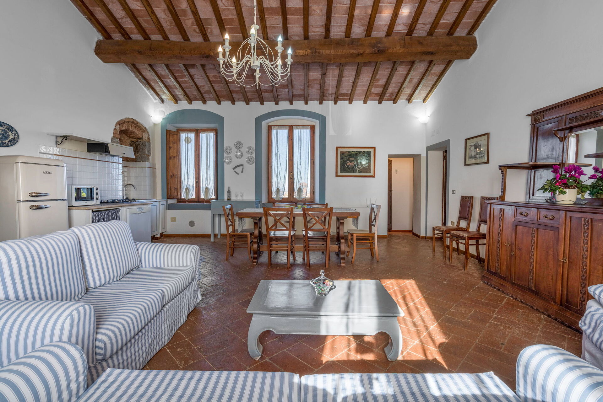 The flat is tastefully furnished in the Tuscan style and is located on the first floor of the main house. It consists of: a large living room with a fully equipped kitchen with all appliances (dishwasher, 4-ring hob, microwave oven, fridge and freezer). A double bedroom with the possibility of a third bed, a second double bedroom and a complete bathroom with shower. Wi-Fi line present throughout the accommodation.