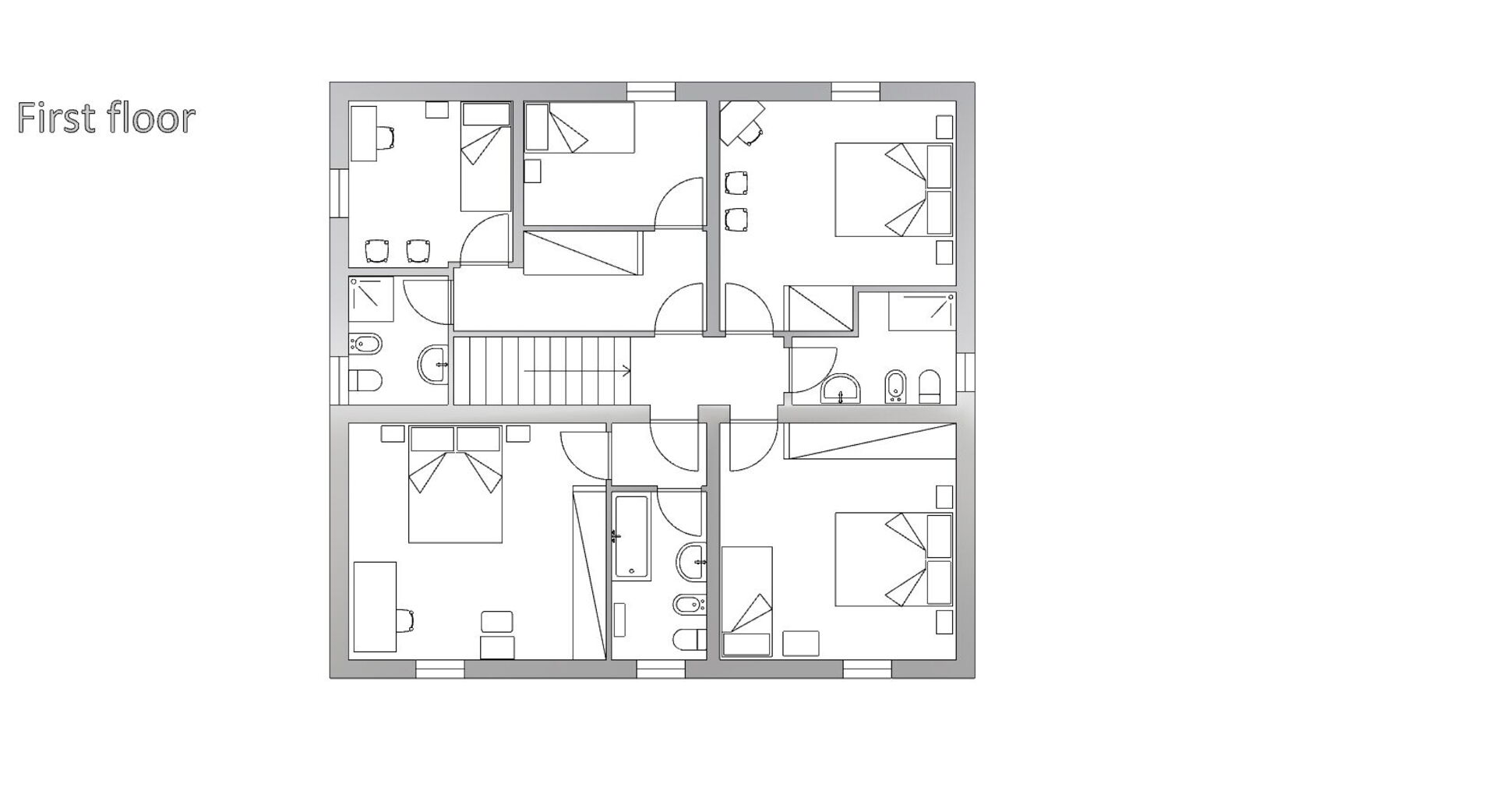 Also on the first floor a double bedroom with bathroom with tub. Two rooms with 1 single bed and bathroom with shower.