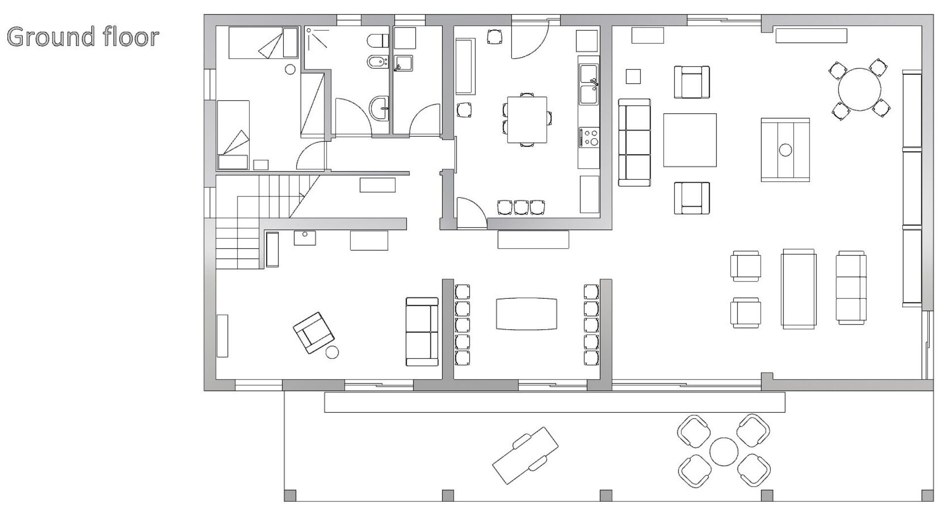 Ground floor: well-equipped kitchen with induction hobs, fridge, oven, dishwasher. Dining room with table and chairs. Large living room furnished with sofas and armchairs.