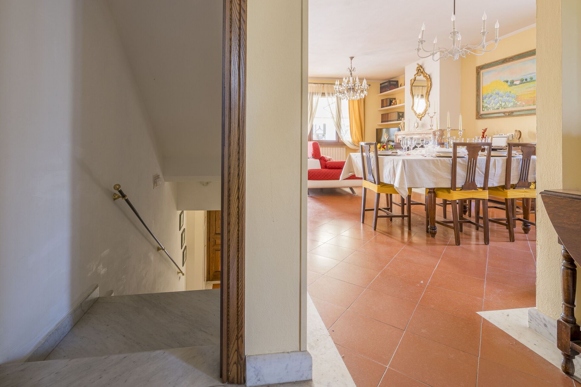On the first floor there is the well-equipped kitchen with oven, dishwasher, microwave, kettle, toaster and air fryer, with access to the garden. The living room with sofas and fireplace, table and chairs and access to the balcony. There is a bathroom with shower.