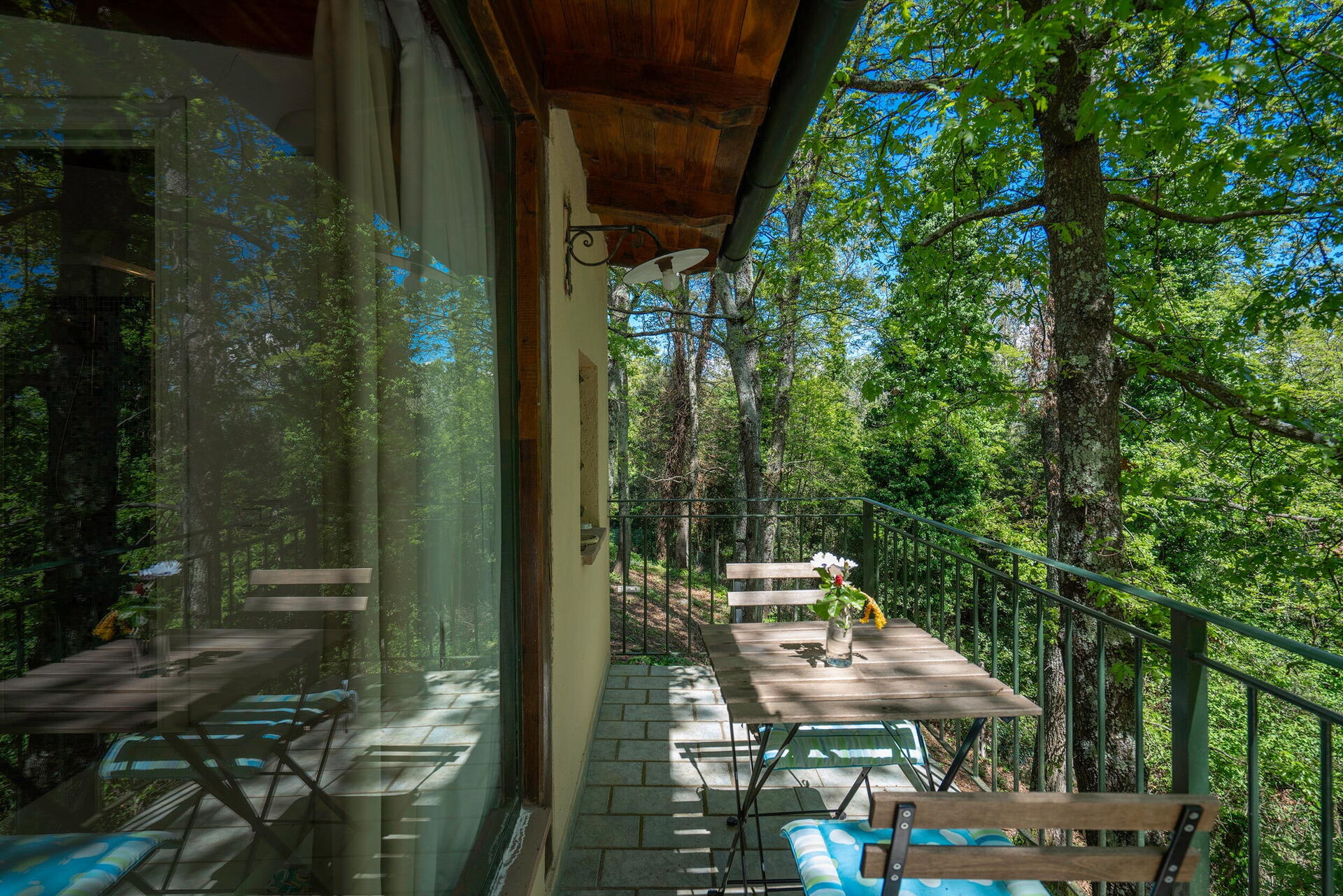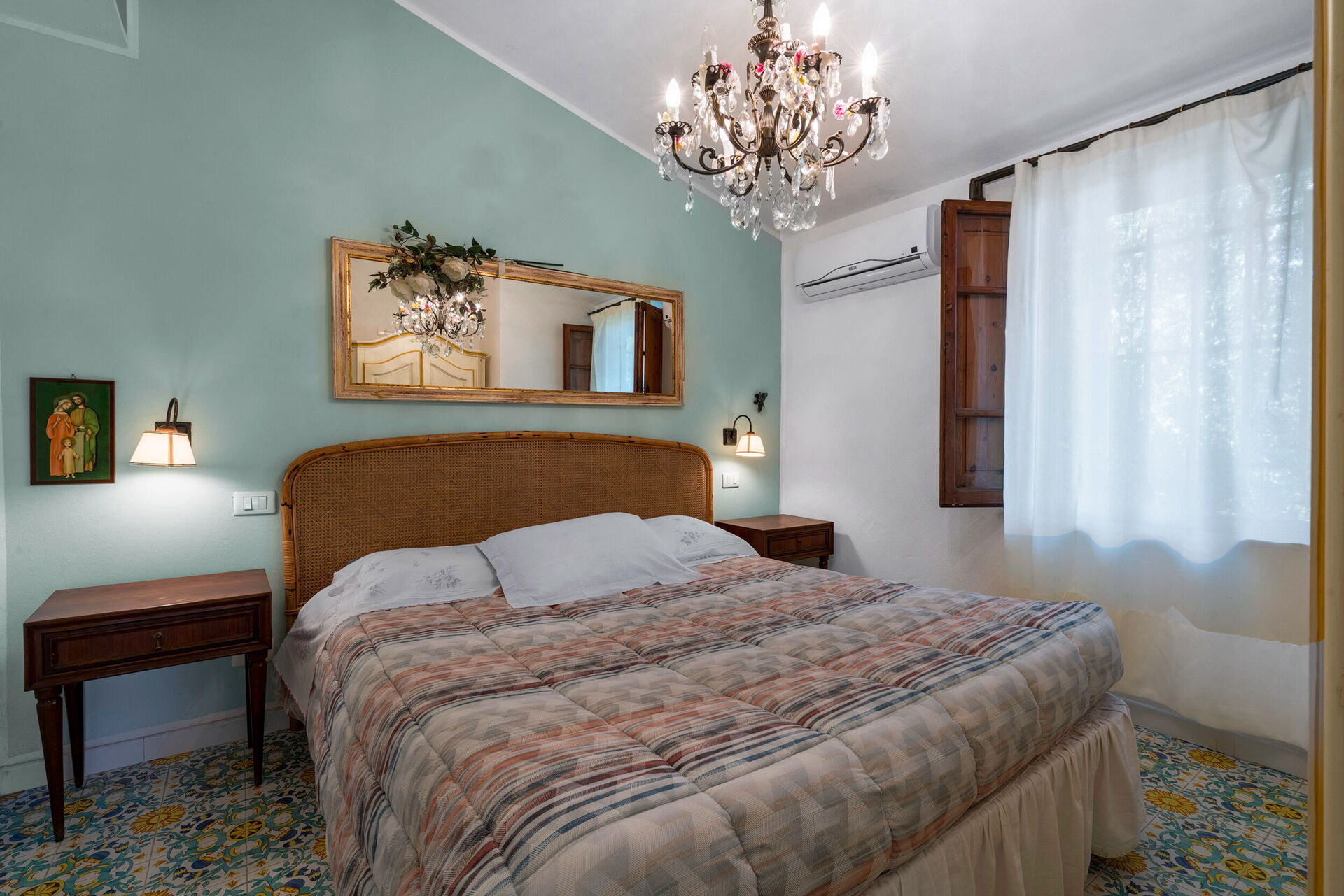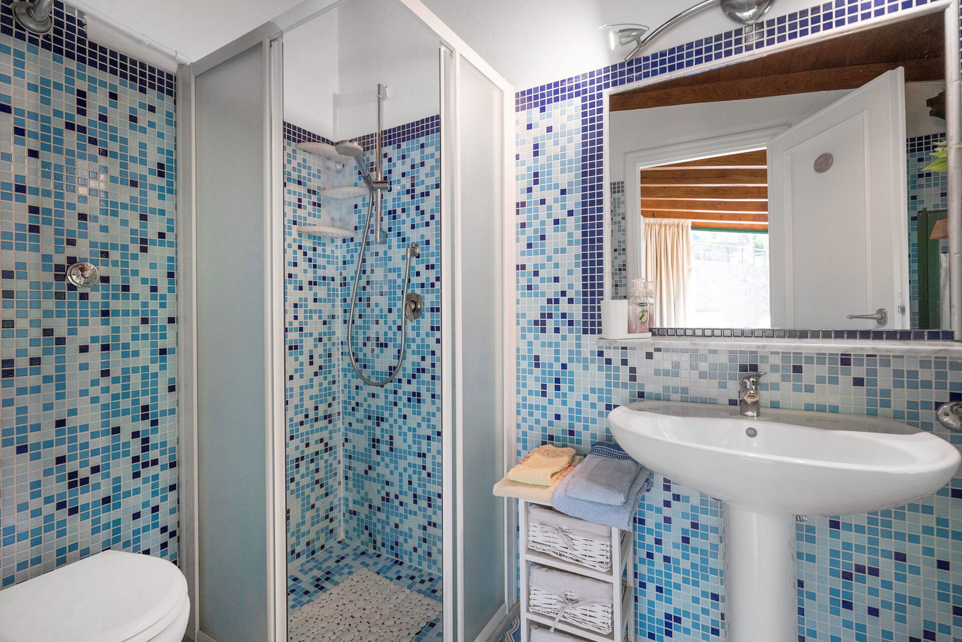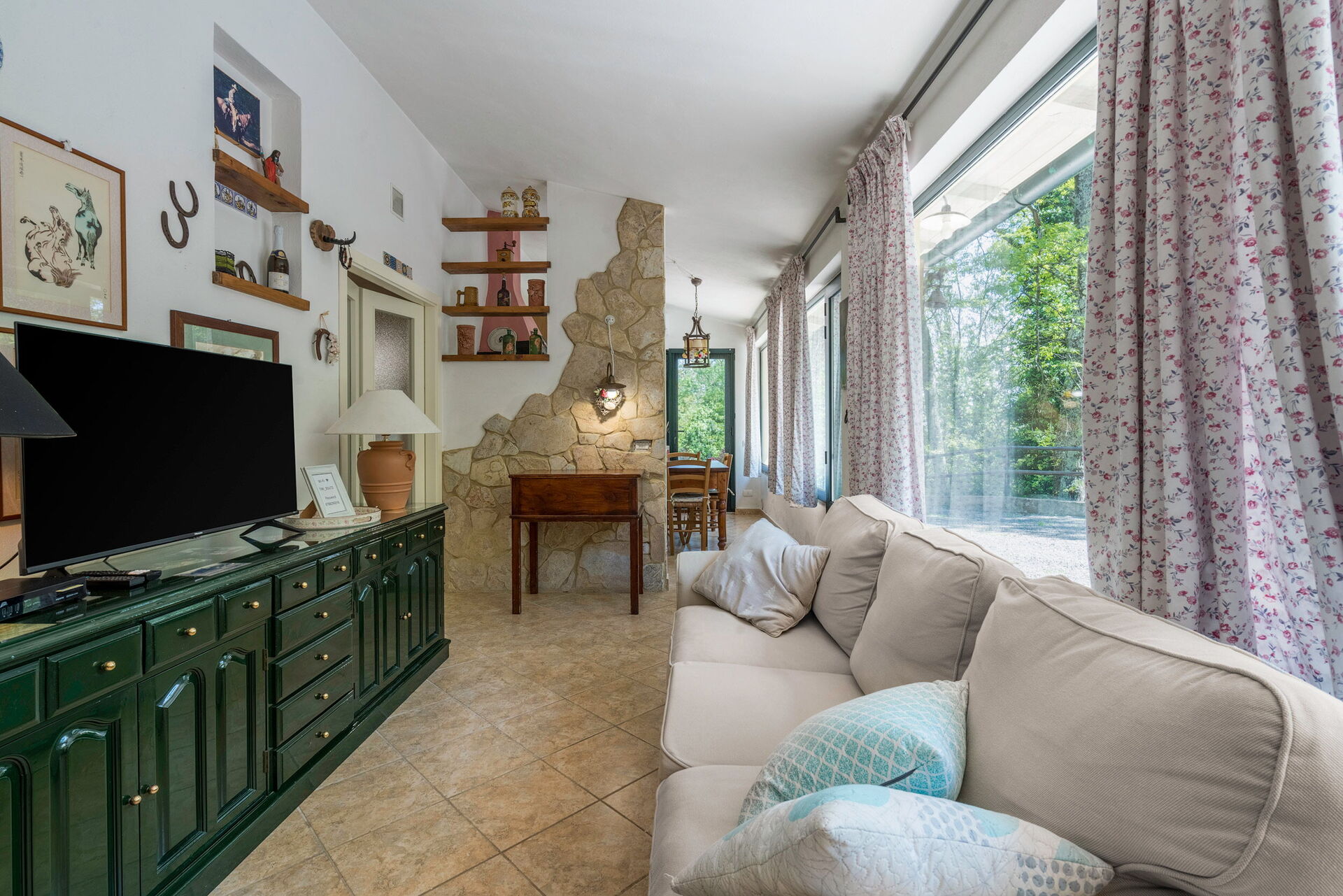 Main house (115sqm) with well-equipped kitchen complete with oven, dishwasher, microwave, kettle, coffee machine. Living room with dining room. Two double bedrooms with two bathrooms with shower and loft with two single beds. Pertaining veranda with barbecue.