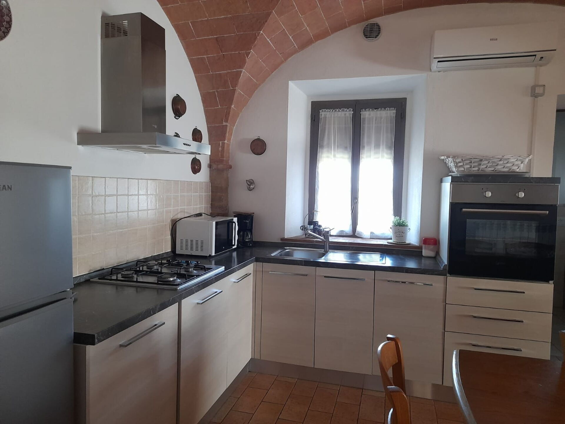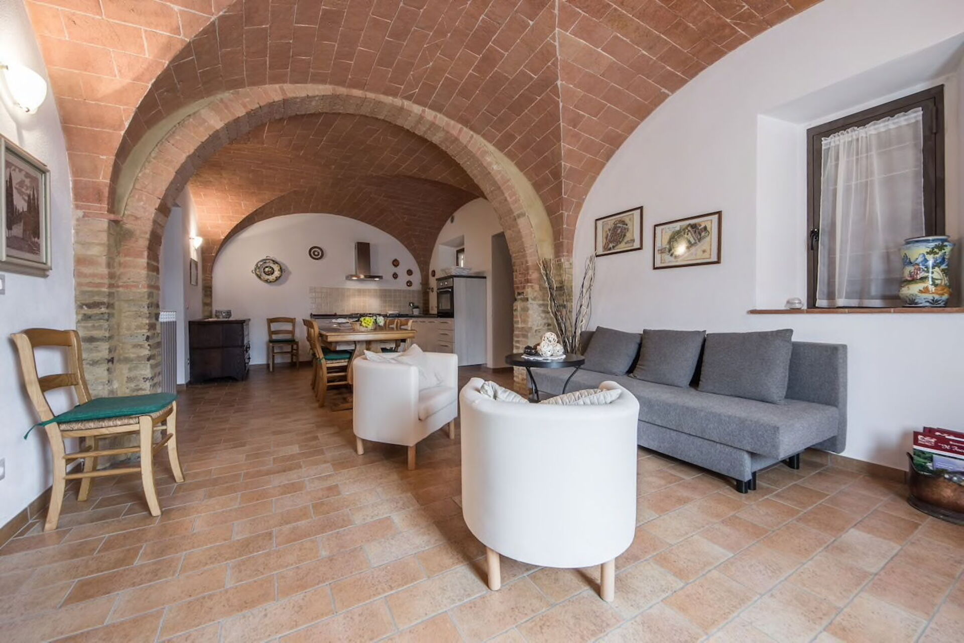Le Volte, with front access, long living room enriched by these beautiful vaults and kitchenette at the back,a double sofa bed, two double bedrooms on the left side and the complete bathroom on the right.