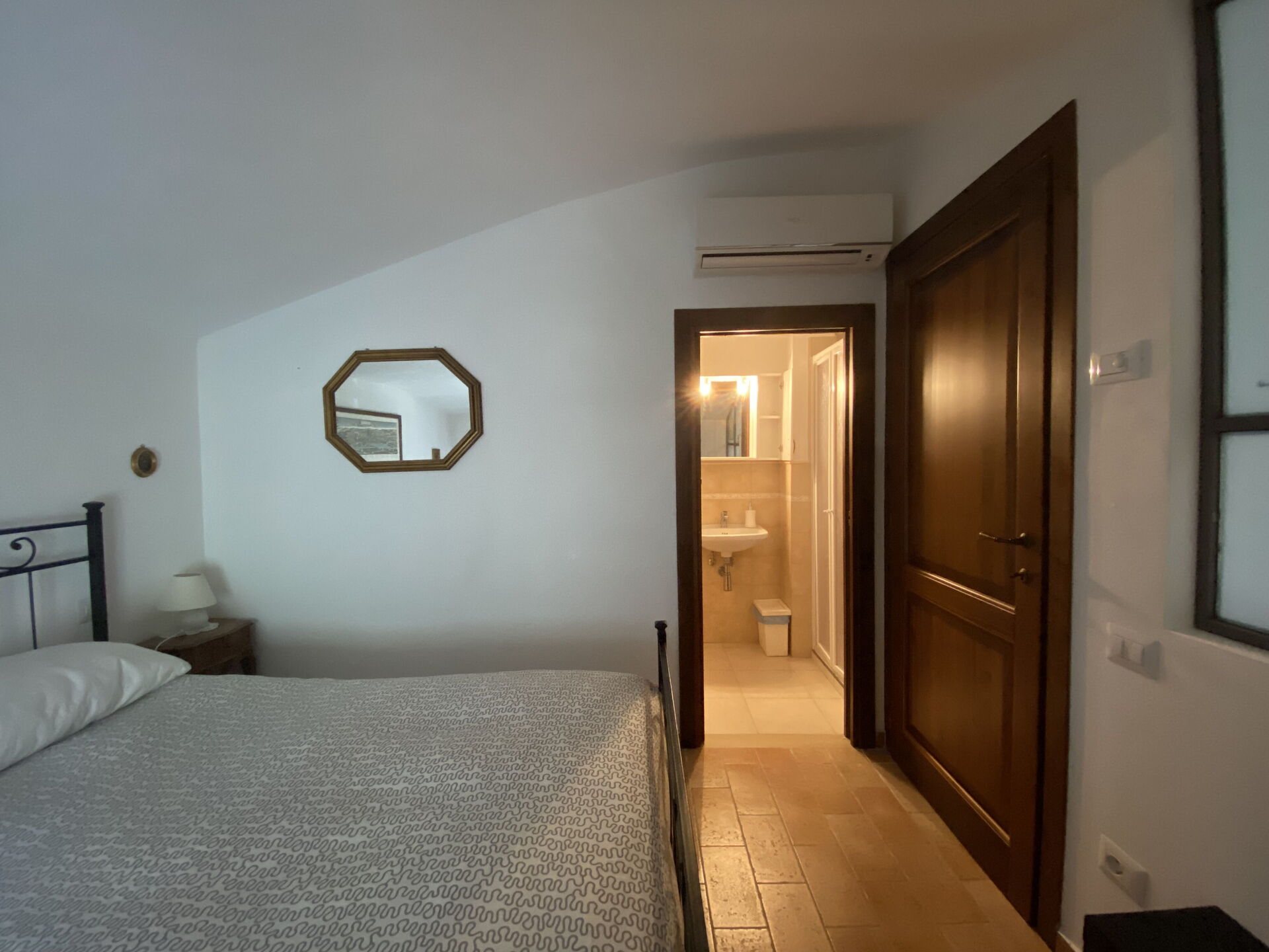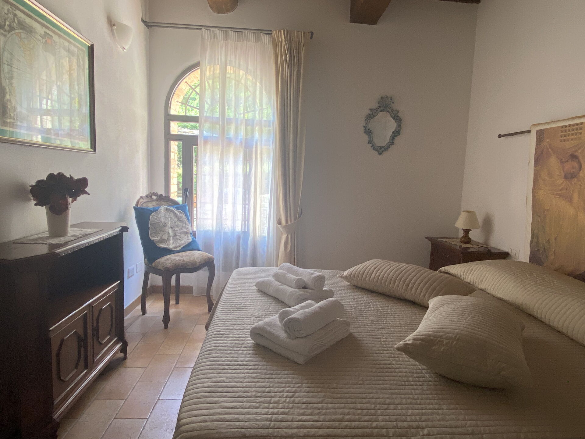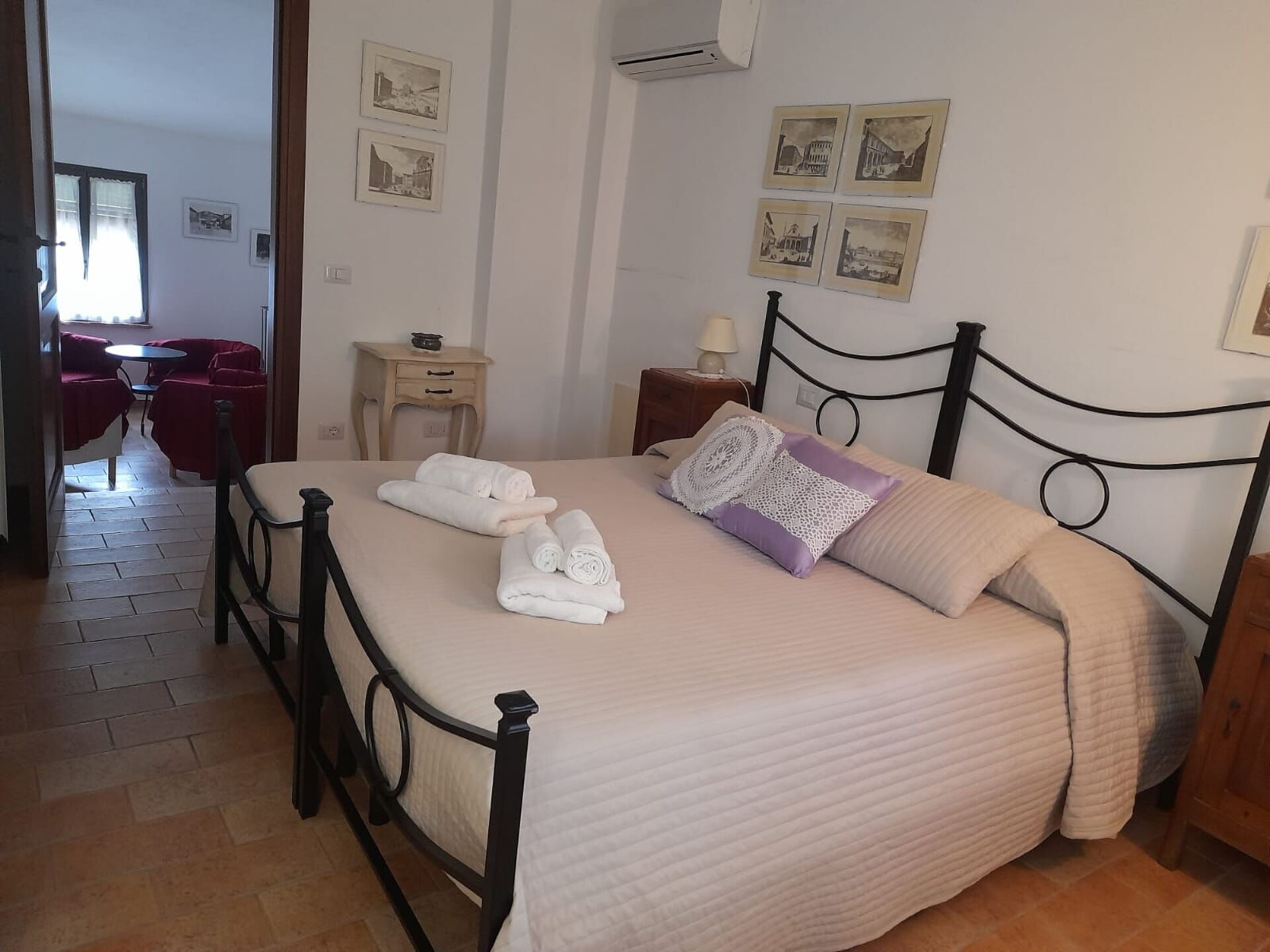La Nonna with entrance onto the large living room with double sofa bed, an arch takes us to the separate and well-equipped kitchen, a small corridor with three steps and we arrive at the double bedroom with complete ensuite bathroom.