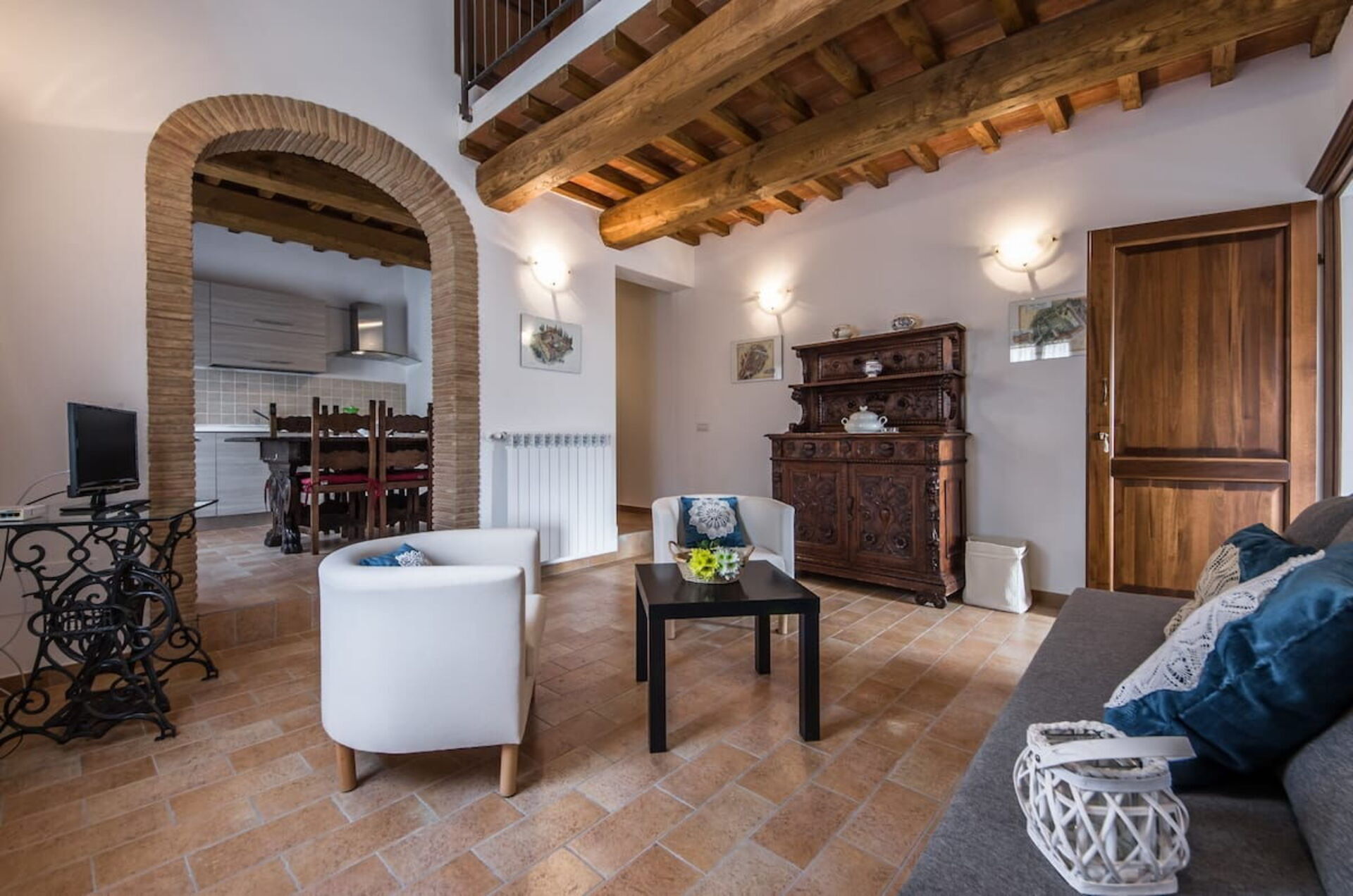 San Gimignano, living room with kitchenette with a wonderful view of San Gimignano, double bedroom and complete ensuite bathroom. The stairs in the living room lead to a delightful mezzanine with 4 armchairs and a table, two further steps take us to the double bedroom and ensuite bathroom.