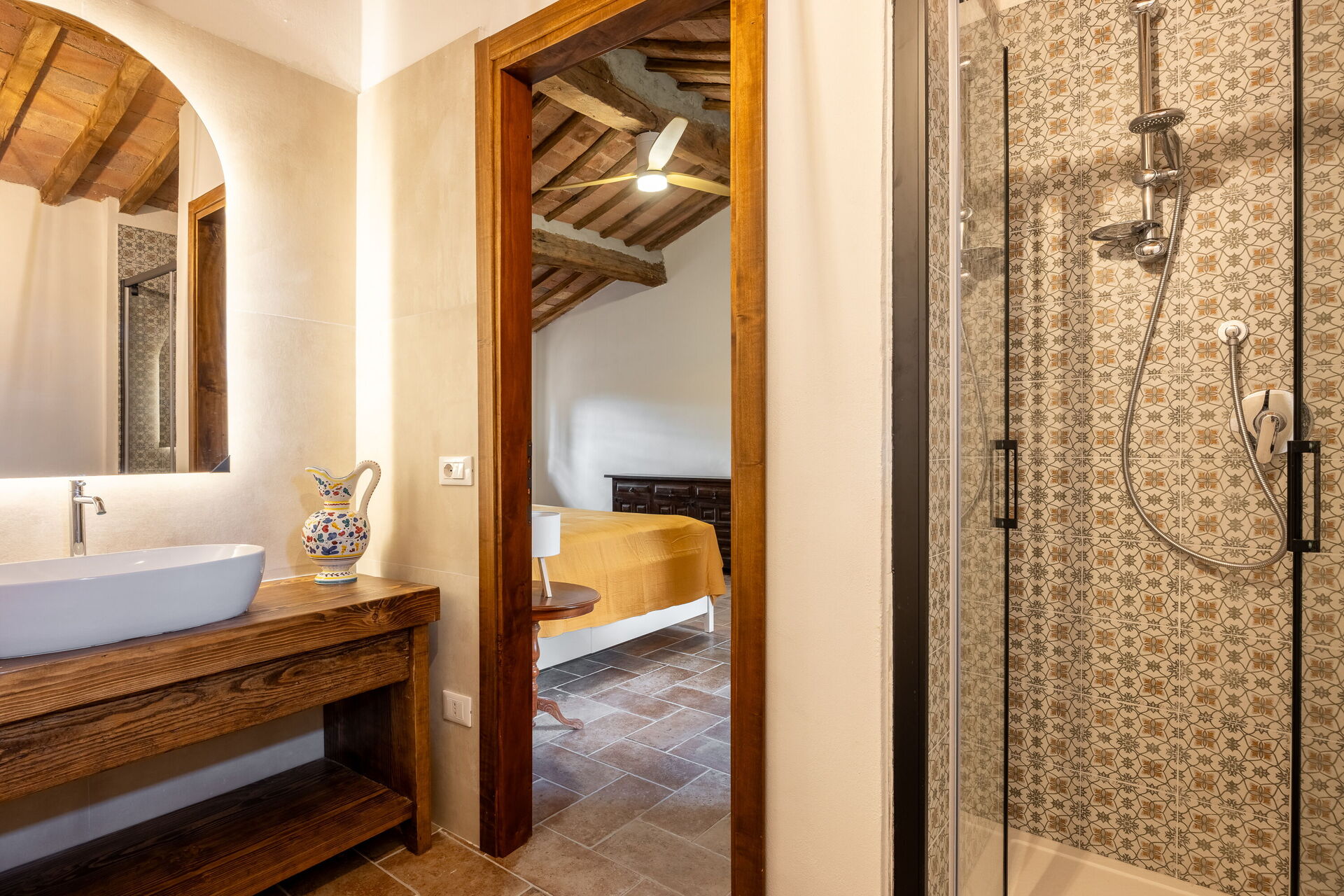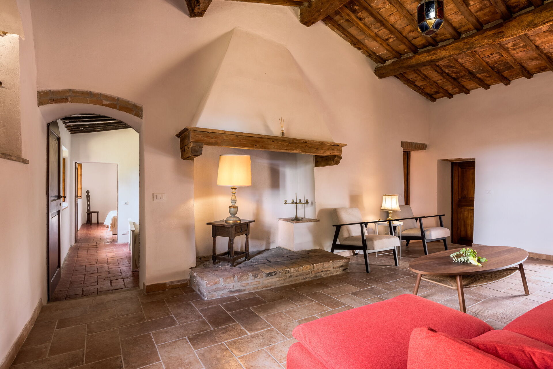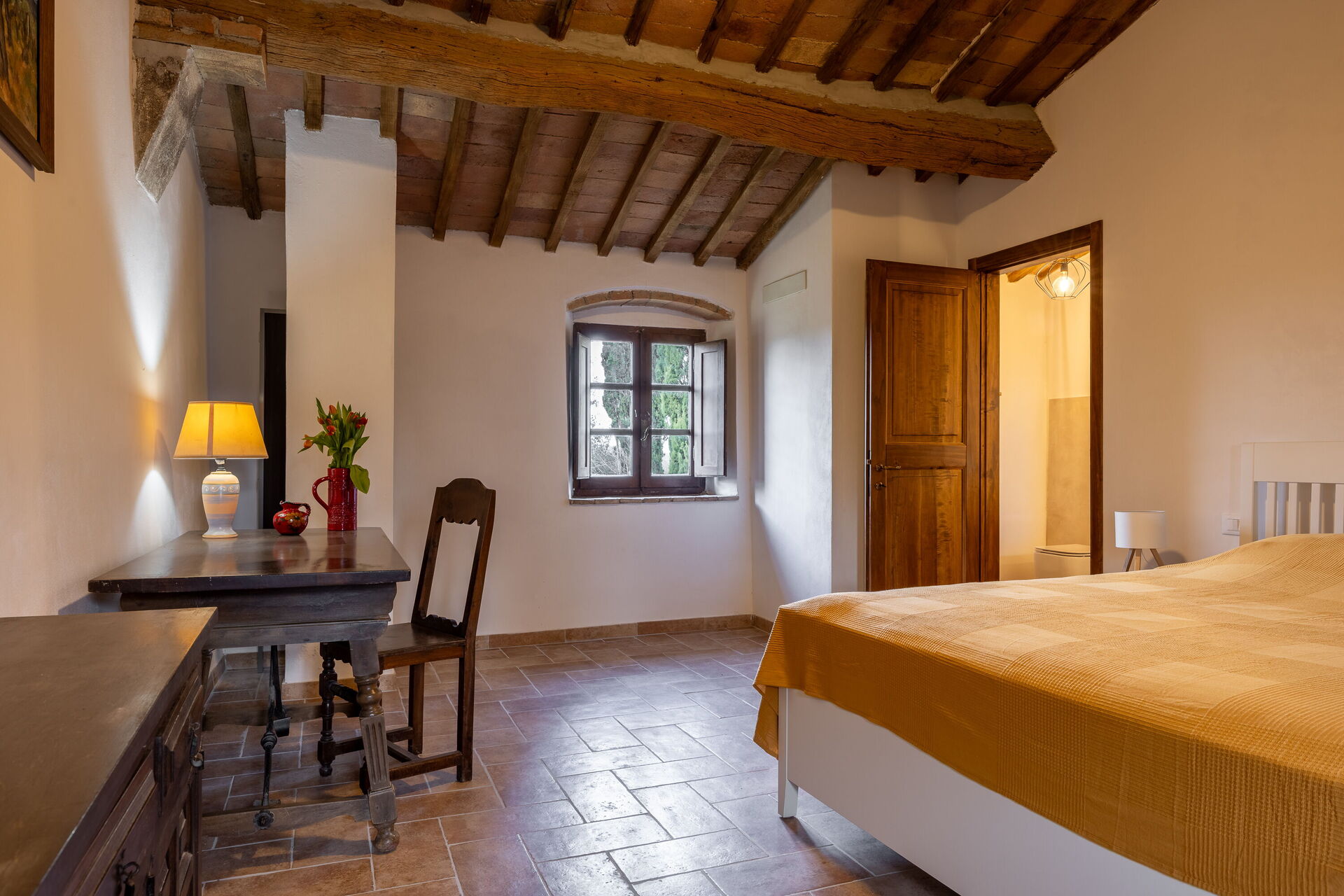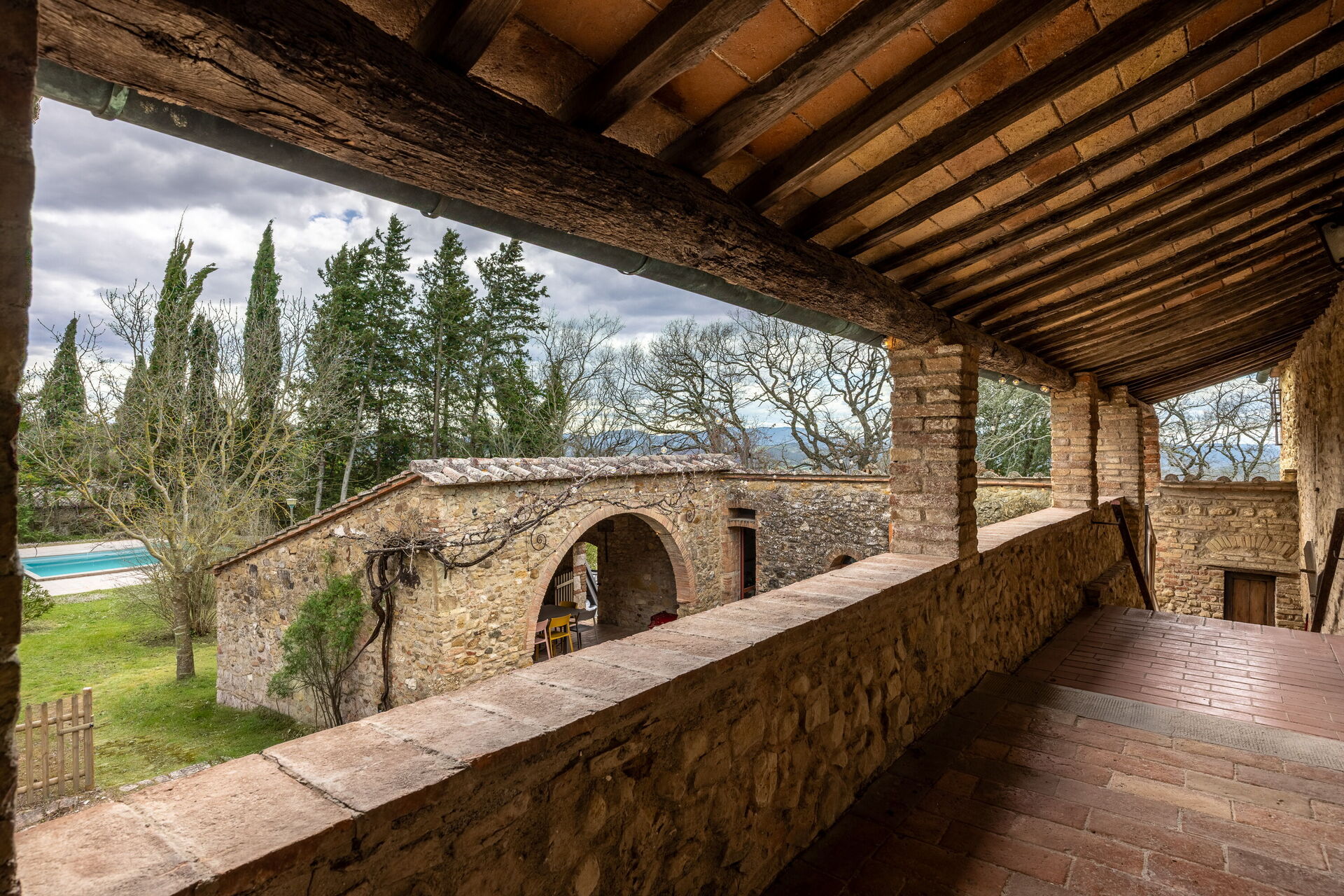 Its strategic location makes it ideal for exploring Tuscany: San Gimignano is just 30 minutes away, Siena 40 minutes, Volterra 50 minutes, and Florence about one hour away, as well as the charming villages of the Val d’Elsa. The panoramic swimming pool, located in front of the main farmhouse, offers moments of pure peace and well-being.