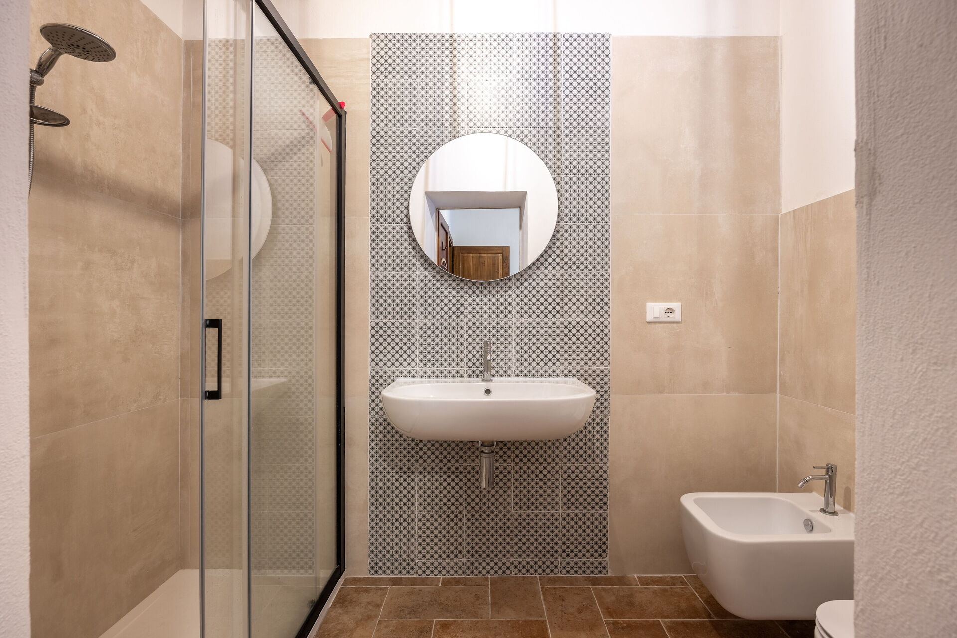 First floor (accessible only via an external staircase): 2 double bedrooms with en-suite bathrooms with showers, kitchen, living room, 2 double bedrooms each connected to a walk-through room with a French bed, and 1 bathroom with shower.