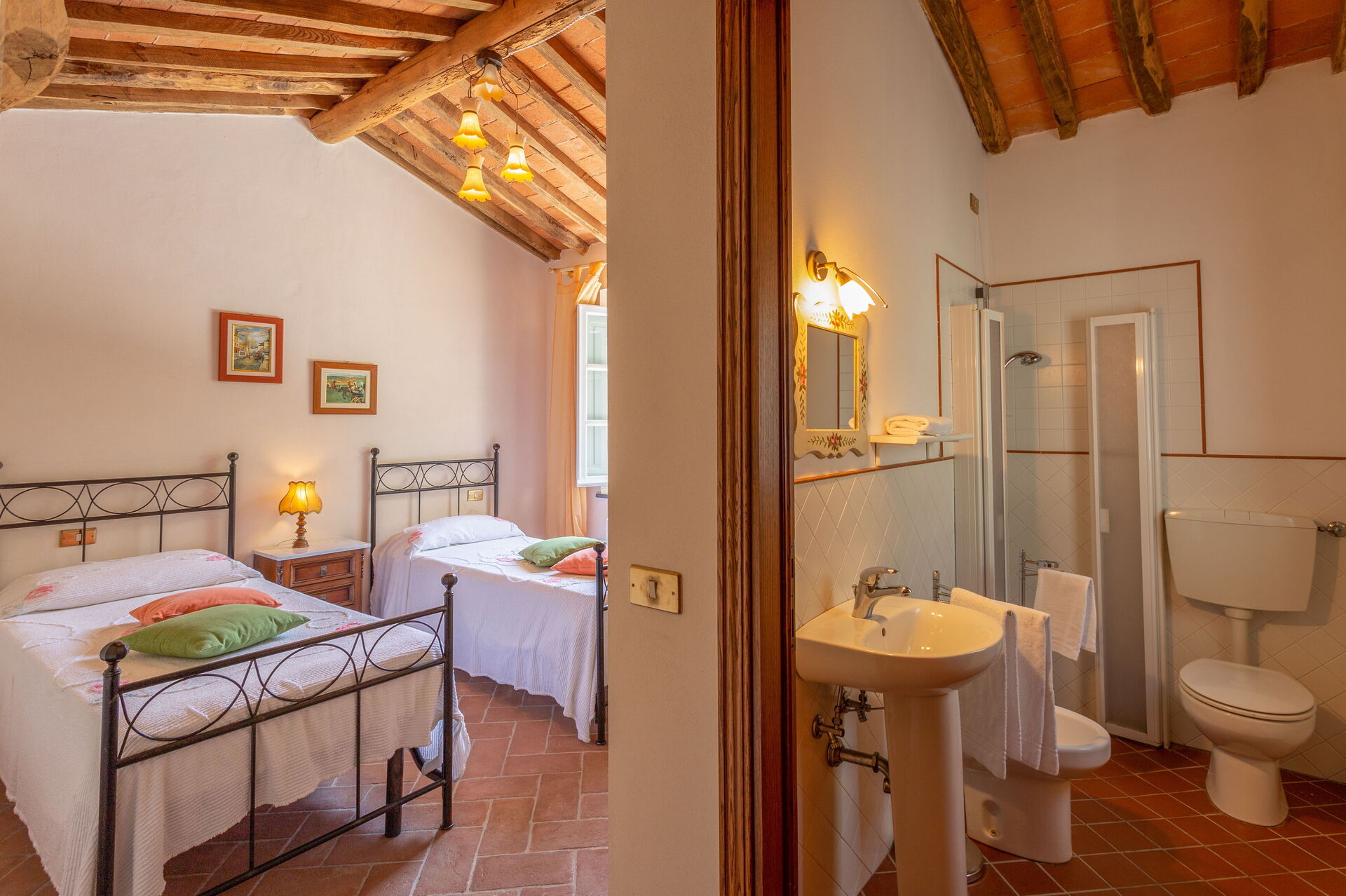 On the first floor with access via wooden stairs: 1 bedroom with two single beds with private bathroom with shower (toilet / bidet).
