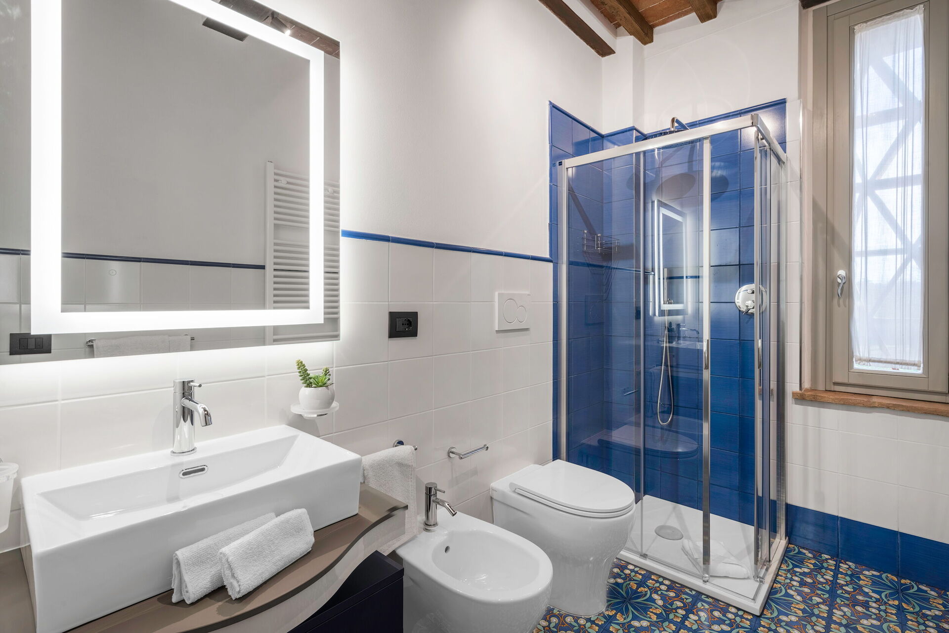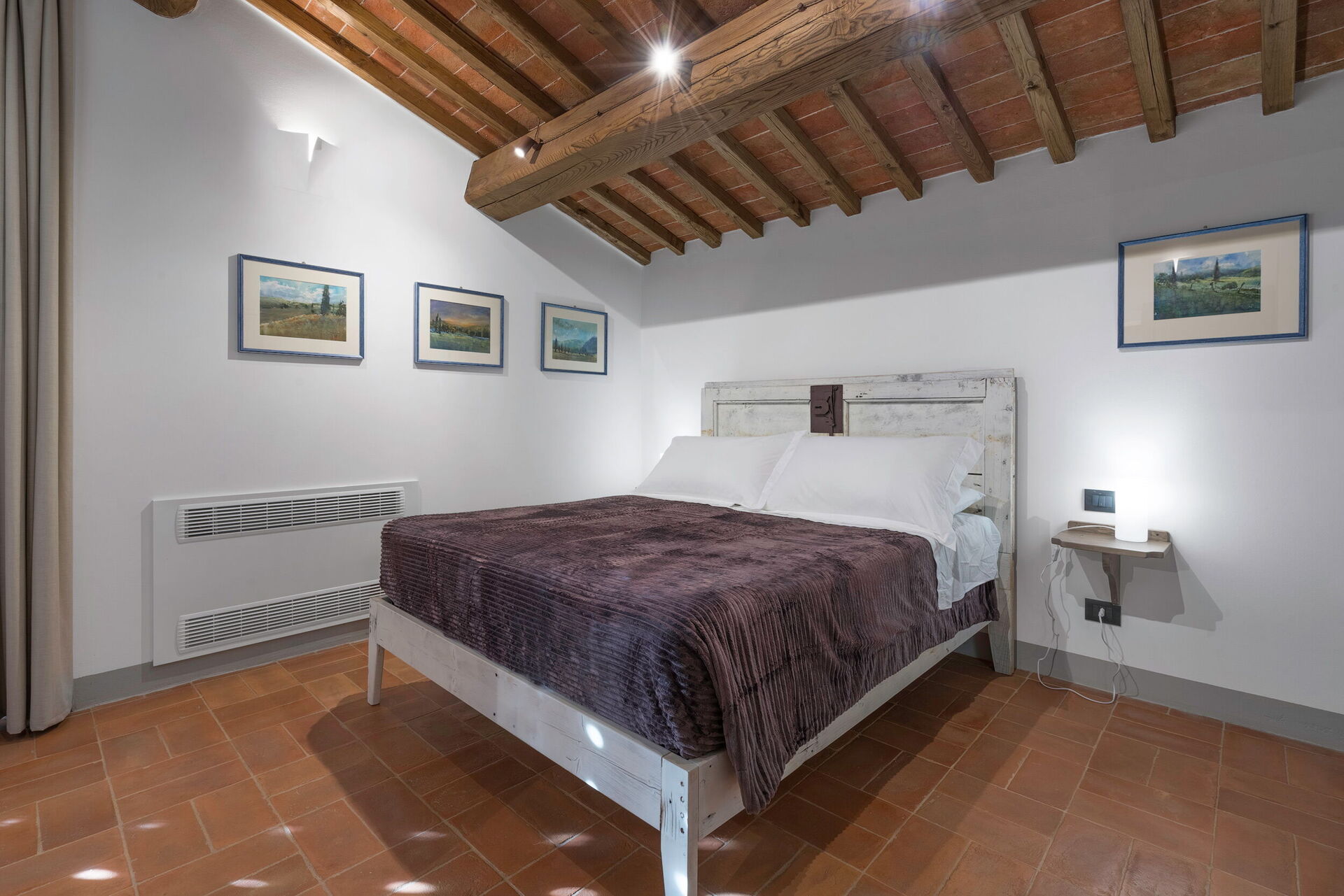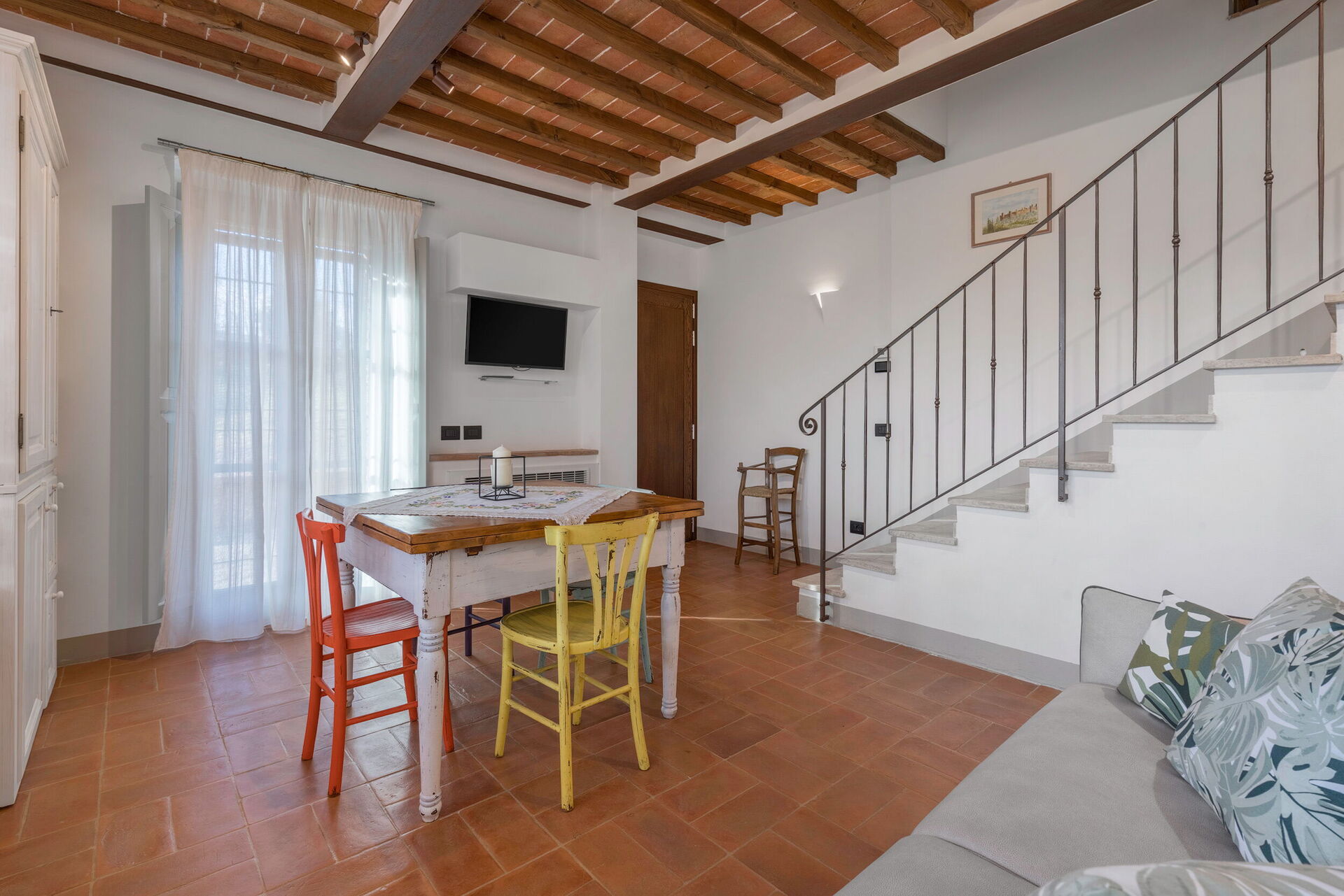 The apartment has been recently renovated and tastefully furnished in Tuscan style. It is spread over two levels. On the ground floor: living room with a fully equipped concealed kitchenette, including all appliances (dishwasher, 2 induction hobs, microwave oven, fridge, and freezer). On the first floor: one double bedroom and a bathroom with shower. Fully air-conditioned and equipped with Wi-Fi connection.