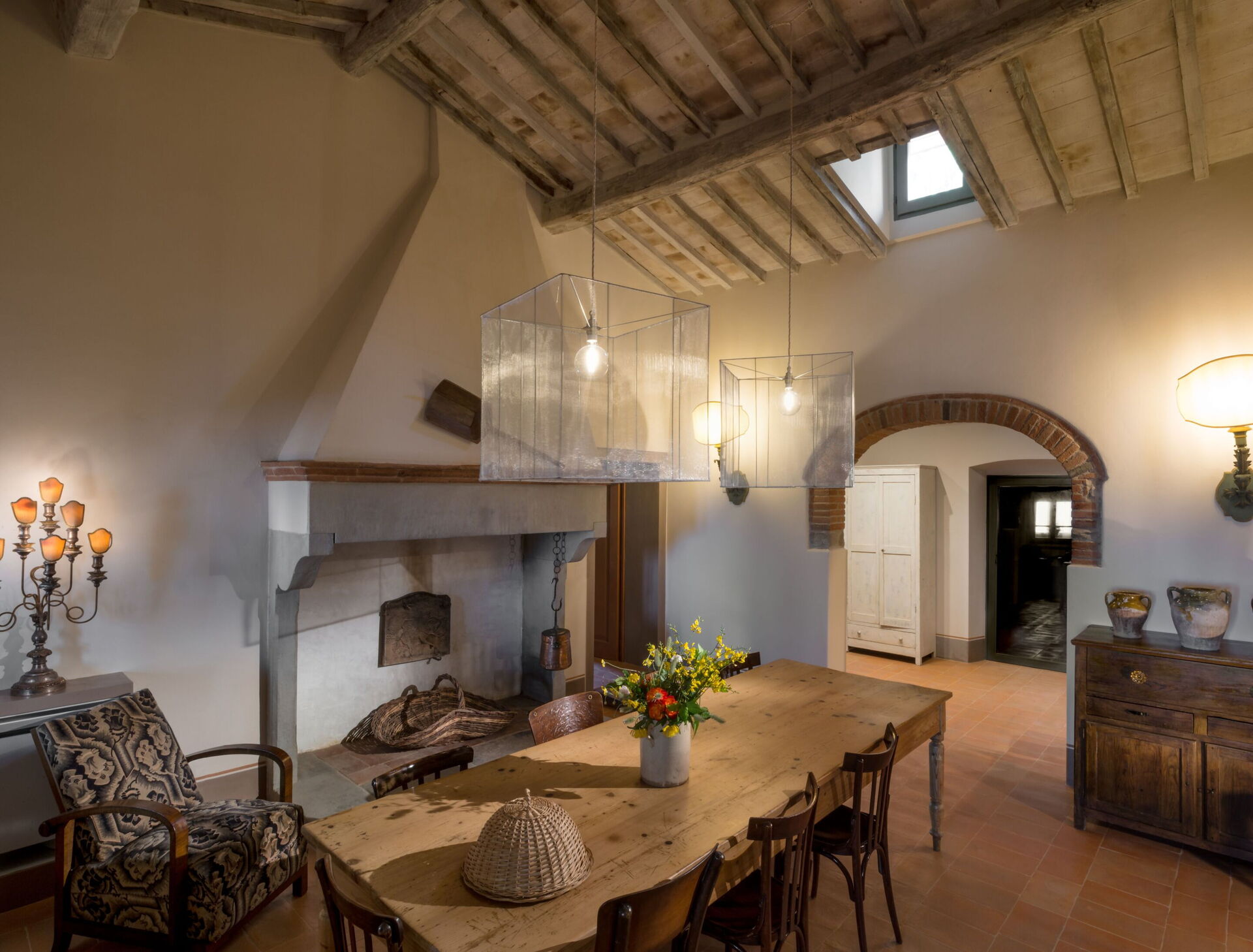In the main dining room, the large fireplace makes the environment of Villa Bottaia particularly warm and romantic, ideal for sharing unforgettable moments with travel companions. In the loggia on the ground floor, open to the garden, a large dining table is part of the furniture.