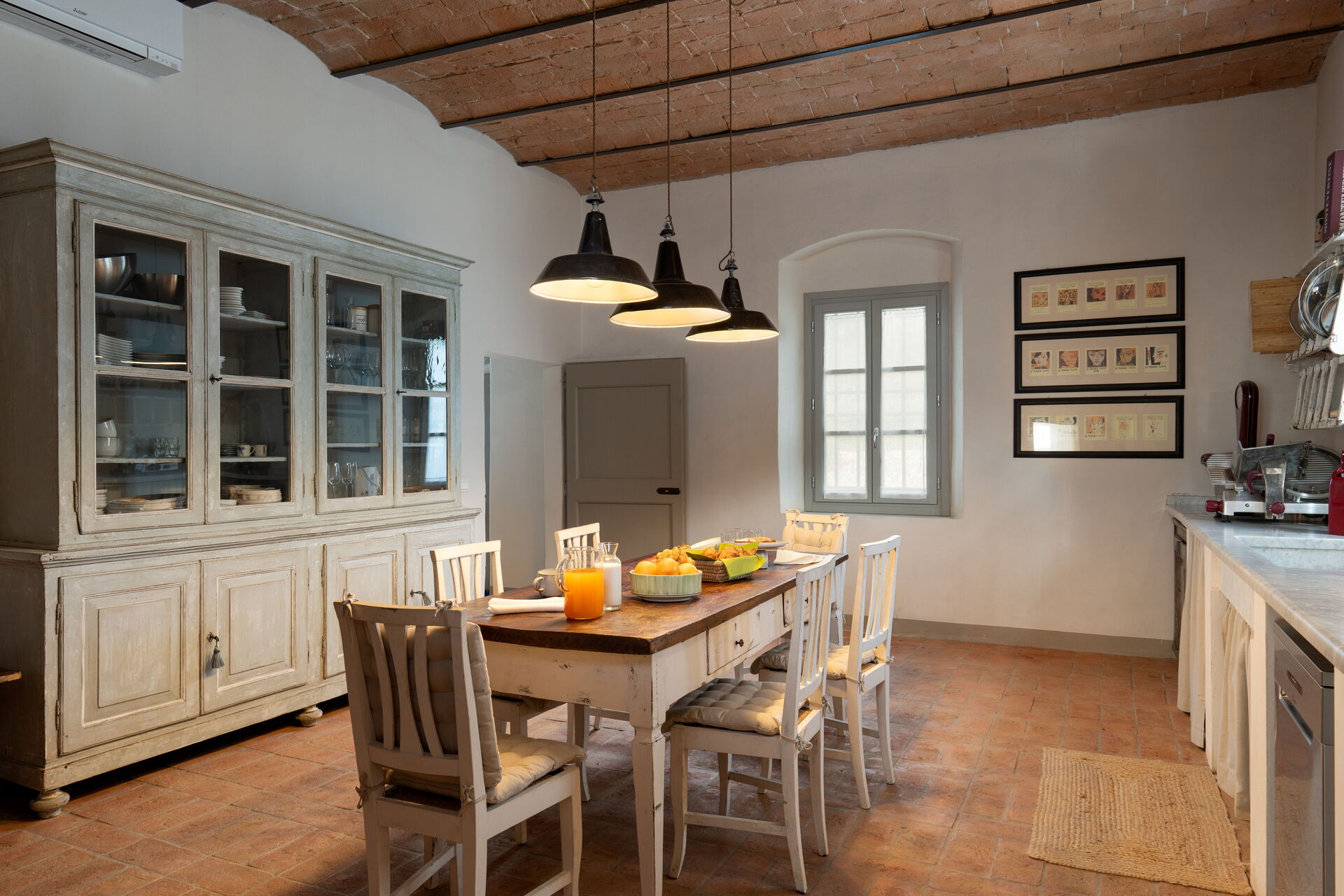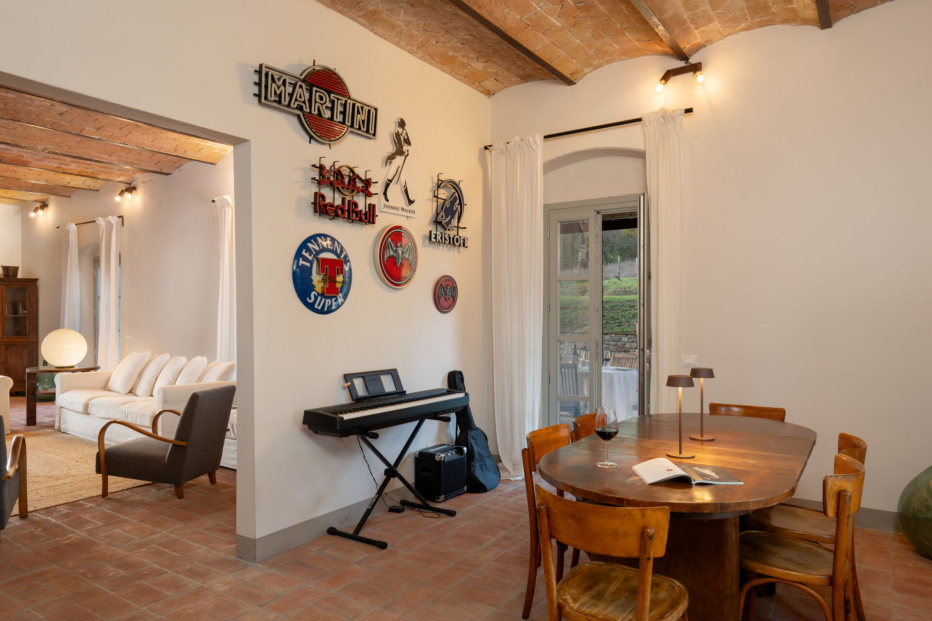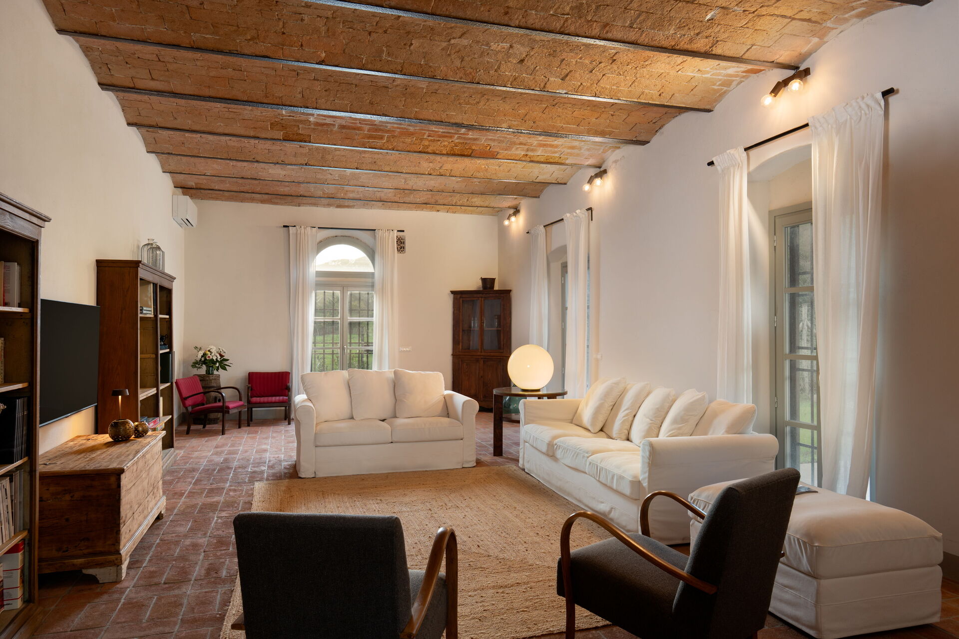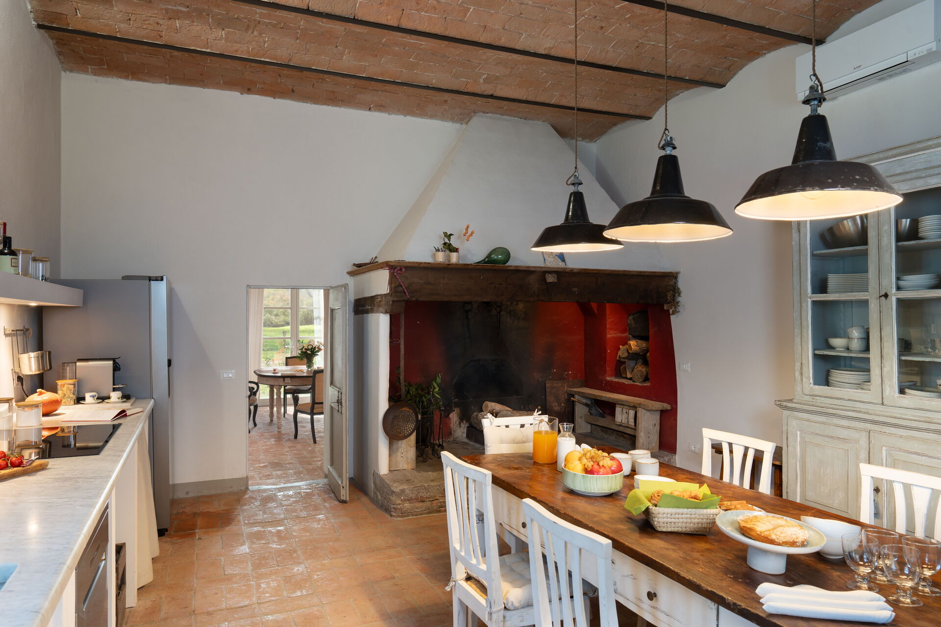 Typical Tuscan farmhouse nestled in the hills of the Mugello, recently restored maintaining traditional architectural features such as wooden beams and ancient brick arched ceilings.