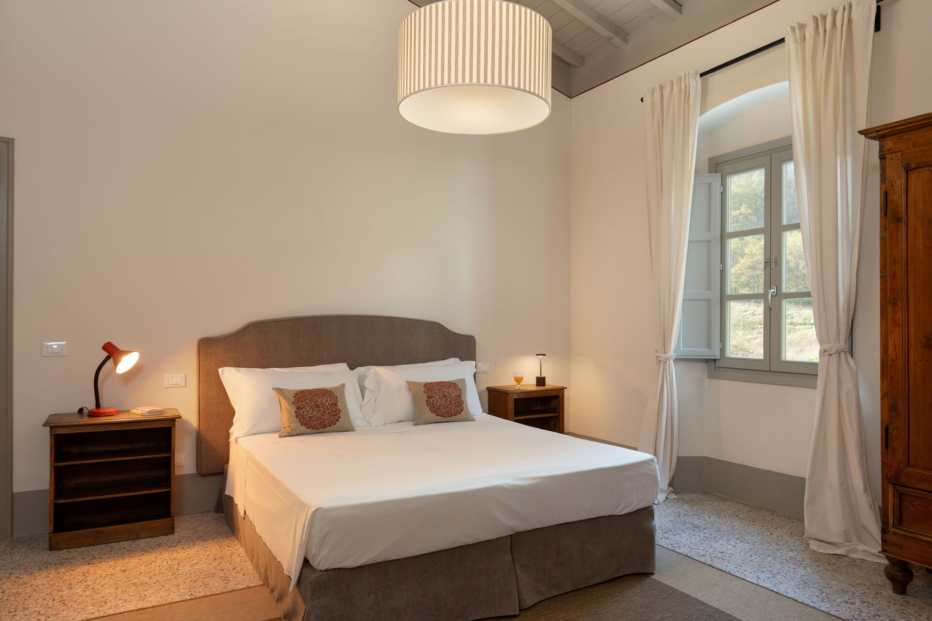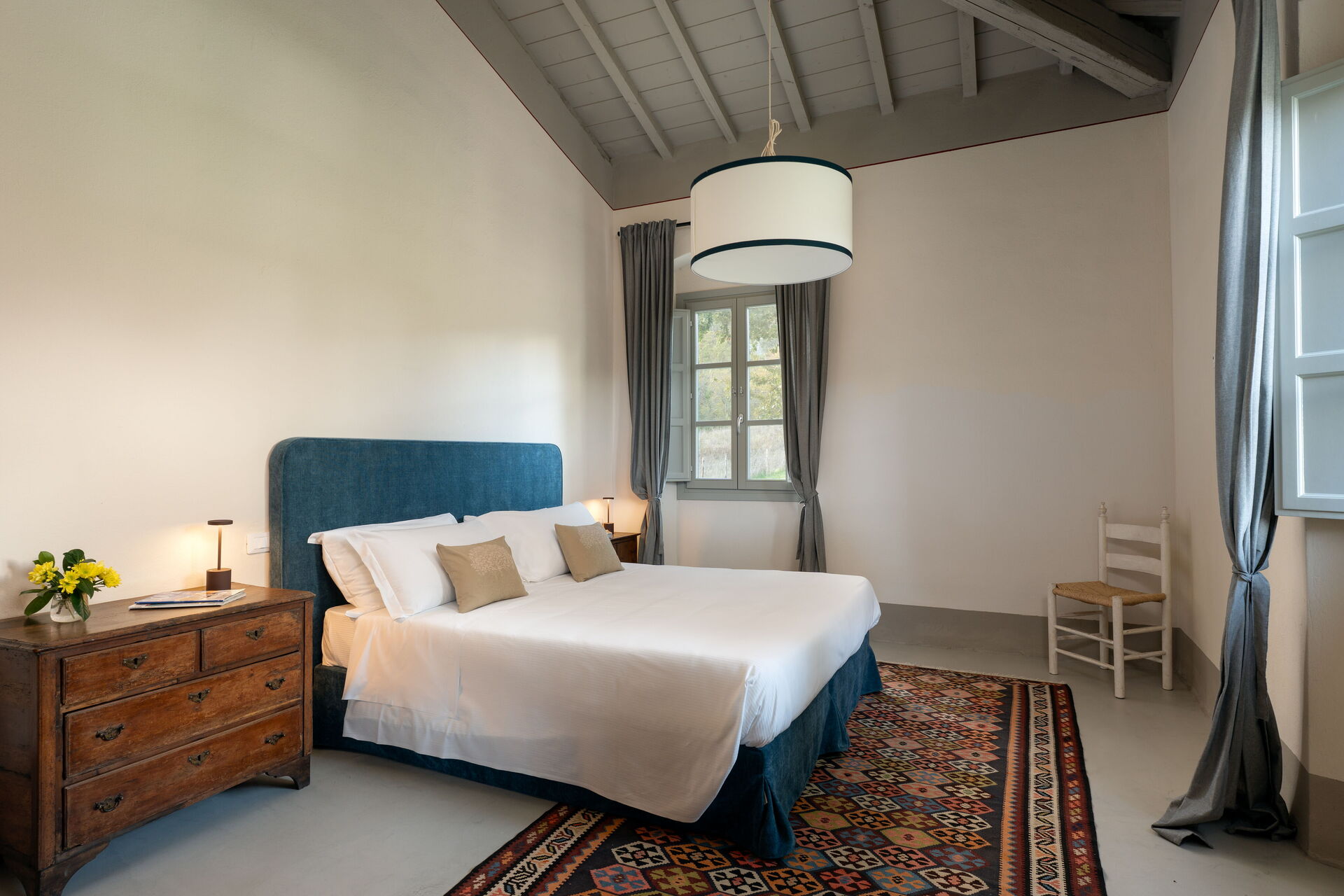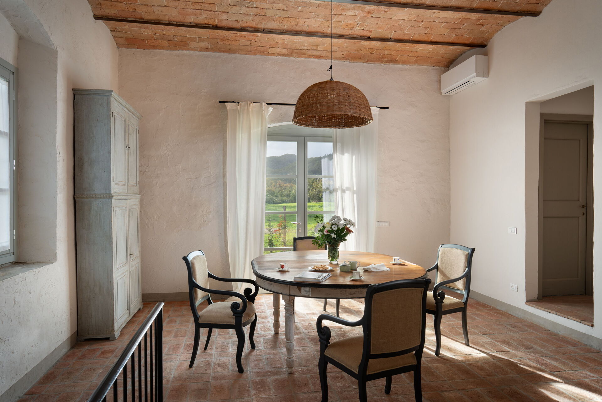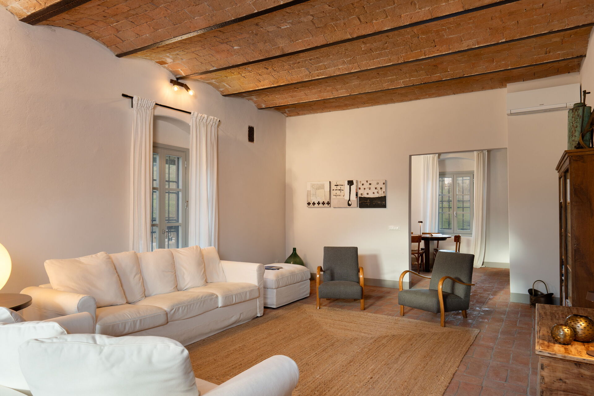 Typical Tuscan farmhouse nestled in the hills of the Mugello, recently restored maintaining traditional architectural features such as wooden beams and ancient brick arched ceilings.
