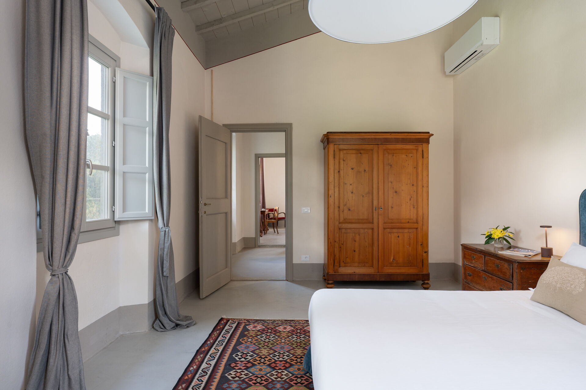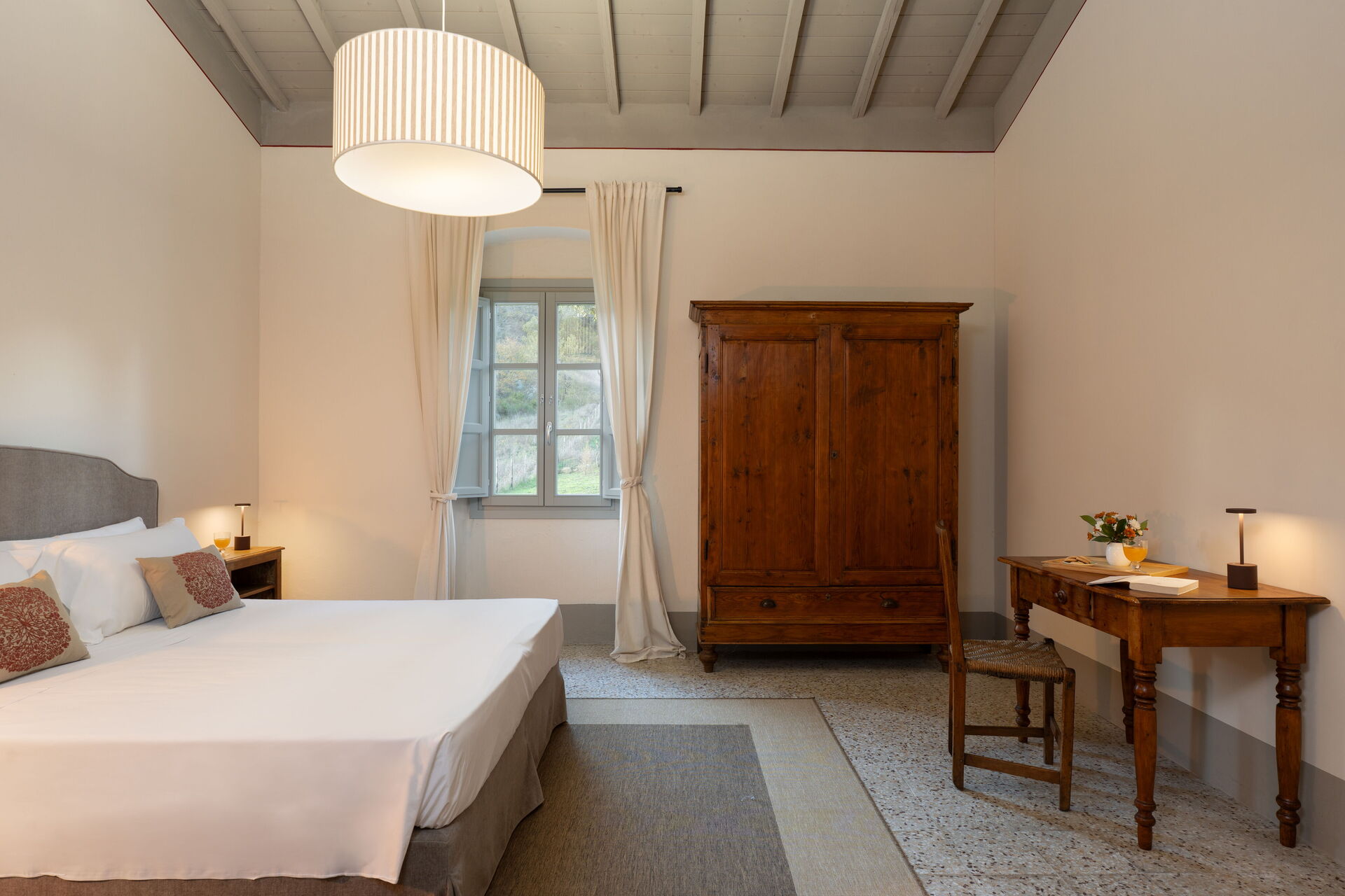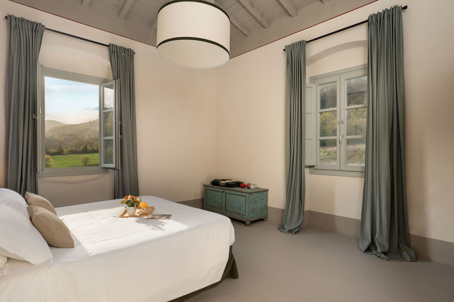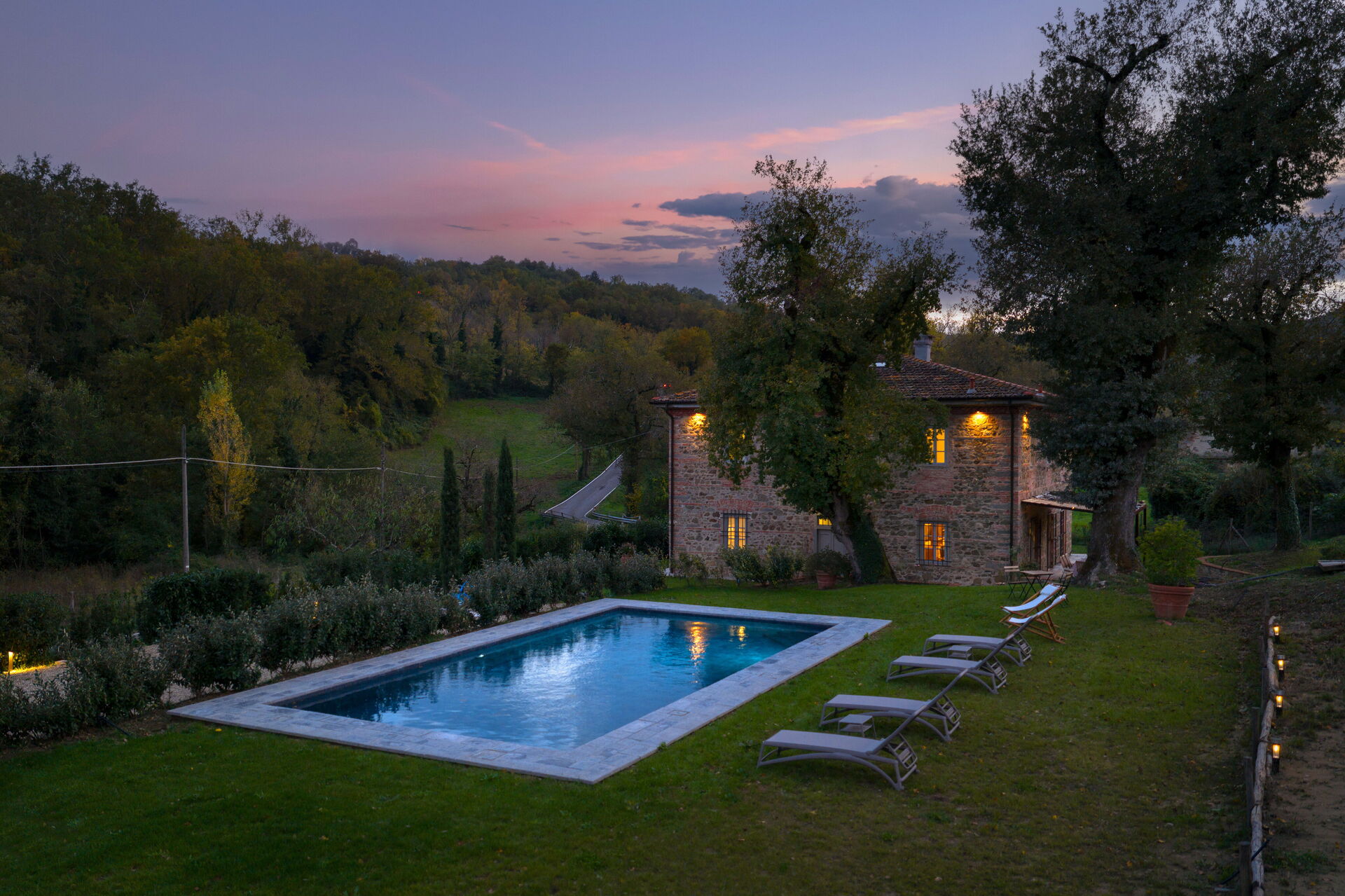 Typical Tuscan farmhouse nestled in the hills of the Mugello, recently restored maintaining traditional architectural features such as wooden beams and ancient brick arched ceilings.