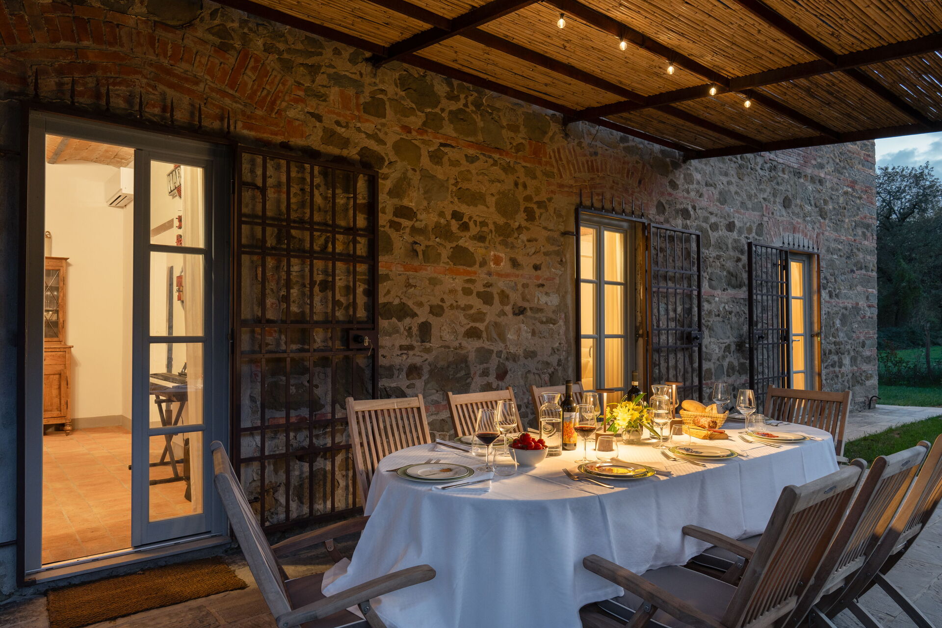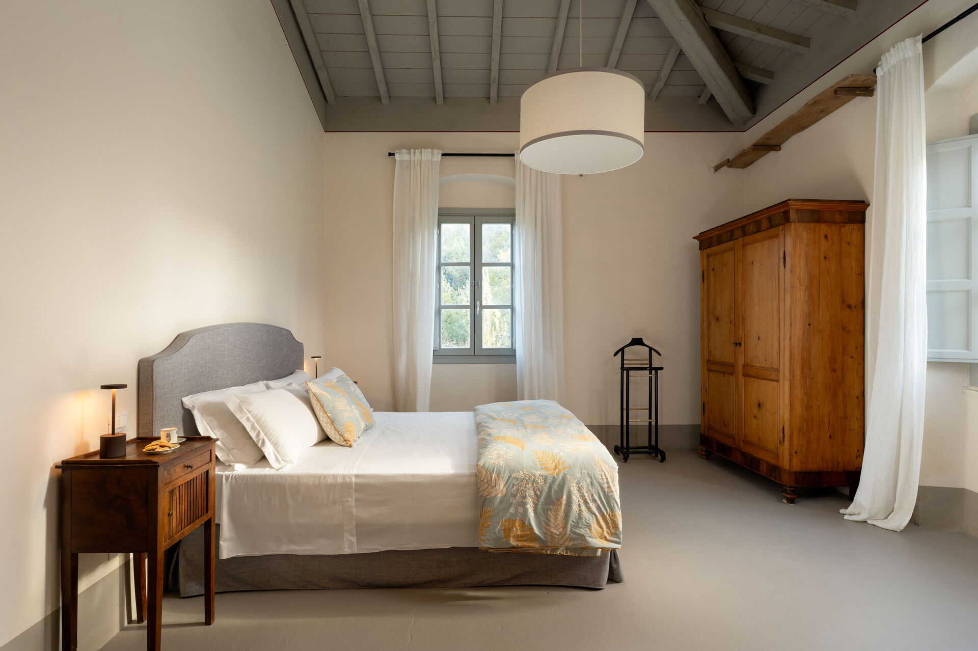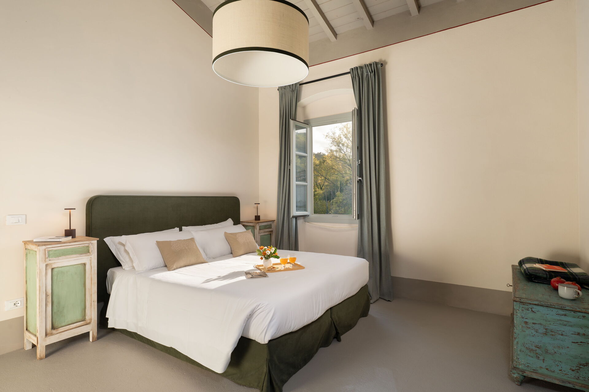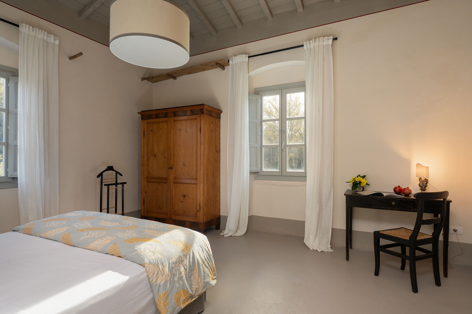 Typical Tuscan farmhouse nestled in the hills of the Mugello, recently restored maintaining traditional architectural features such as wooden beams and ancient brick arched ceilings.