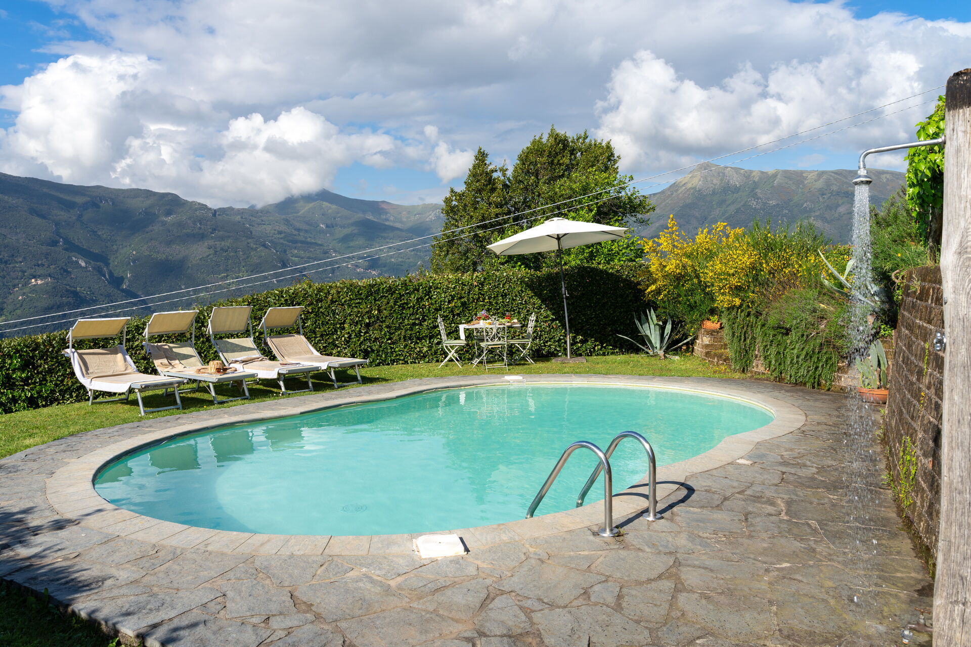 Cosy villa arranged on the ground floor, from which you can enjoy a fantastic view that sweeps from the sea to the Apuan Alps. The exclusive garden and the oval swimming pool (8m x 5m depth 1.2-1.5m), surrounded by hedges and trees, offer intimacy and privacy. Originally a farmhouse, the Villa still retains many of its rustic features, such as ceilings with wooden beams, terracotta floors and traditional wooden furniture, which add an authentic atmosphere to the place. The well-equipped kitchen offers everything you need for an unforgettable stay. The property also has a covered loggia equipped with garden furniture, wooden table and barbecue for outdoor lunches and dinners. Free WI-FI Internet. Parking 300 meters from the property. The house is located 1 km from the small village of Pedona (small grocery store, bar and restaurant); at 4 km. from Camaiore, with its historic sites and the Friday market; at 15 km. from Viareggio (railway station); at 45 km. from Pisa (airport).