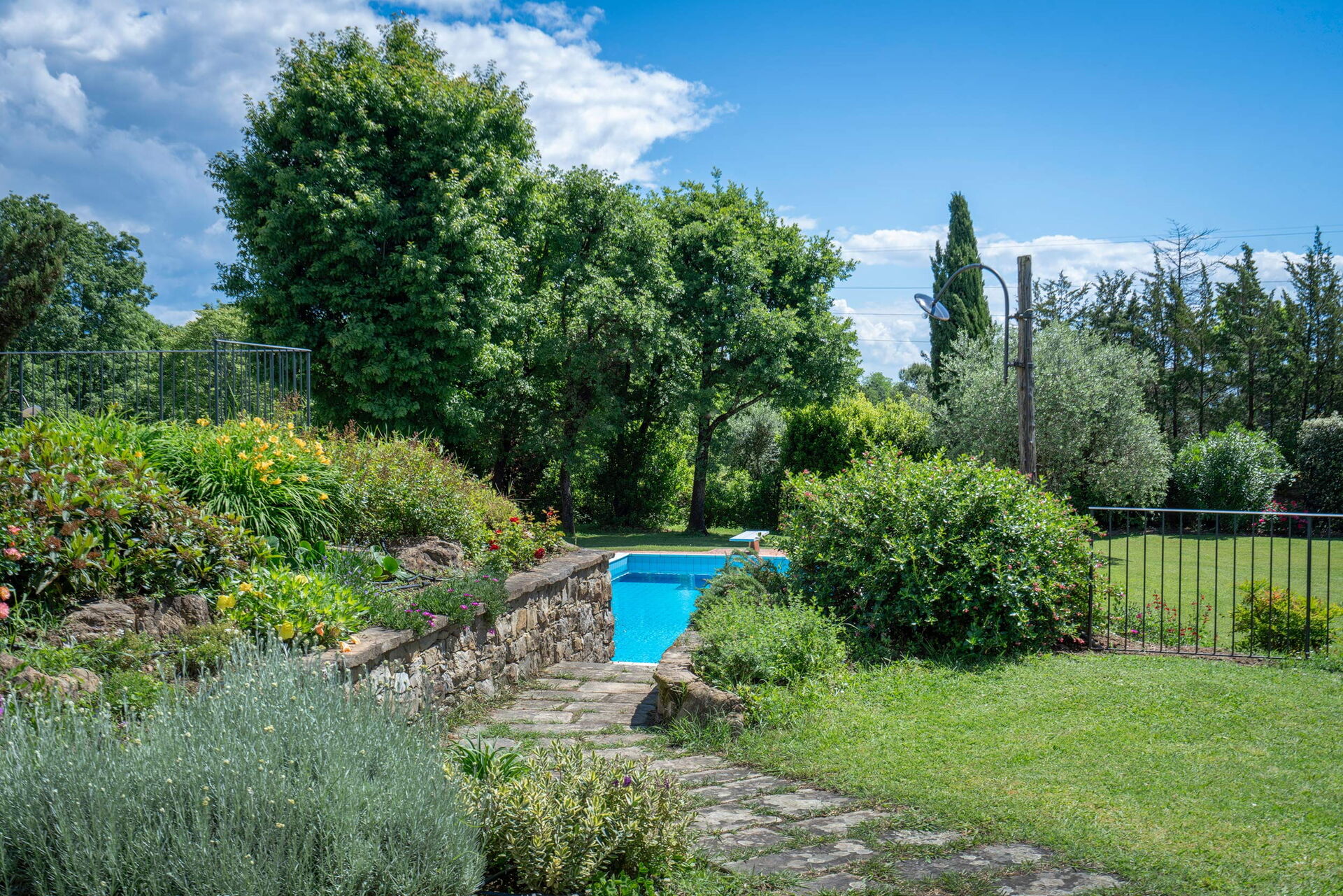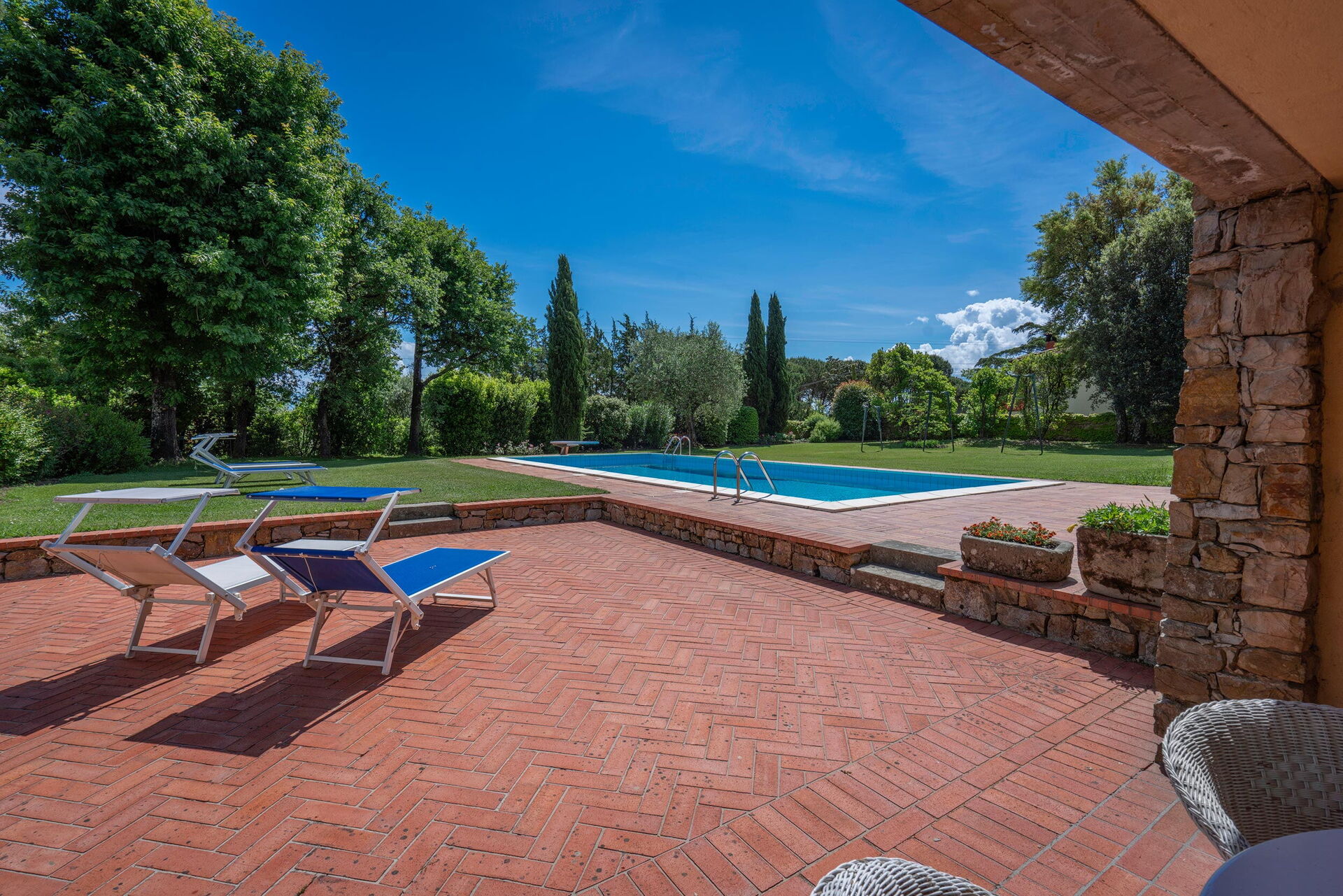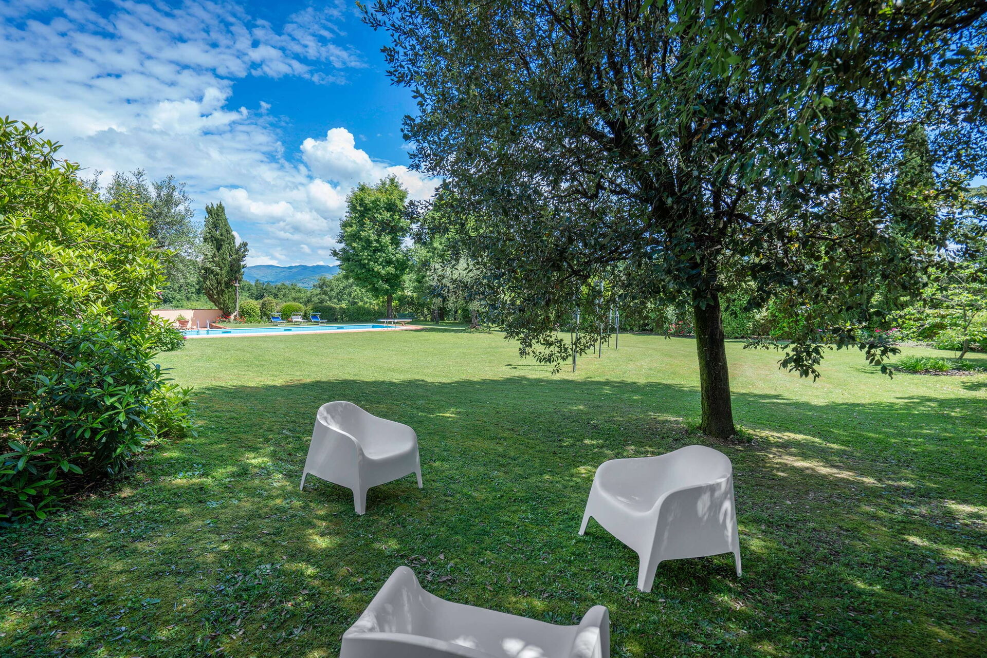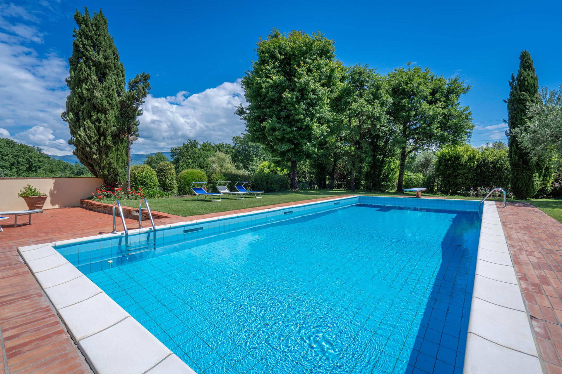 Historic villa in the Pistoia countryside with swimming pool ( 6 x 12 x 1,10-2,40 m) for exclusive use. The villa has a large fenced park ideal for your children to play. A covered veranda, pergola and outdoor shower are available to guests.
