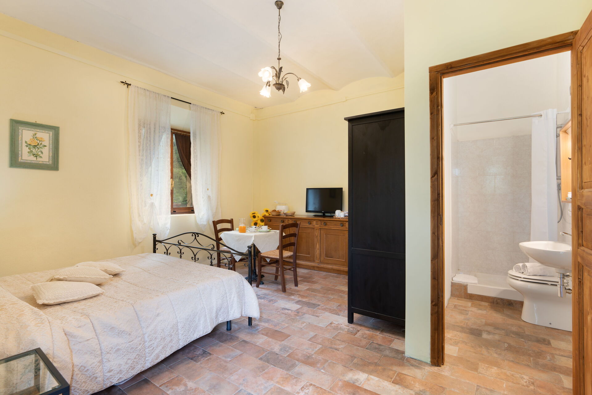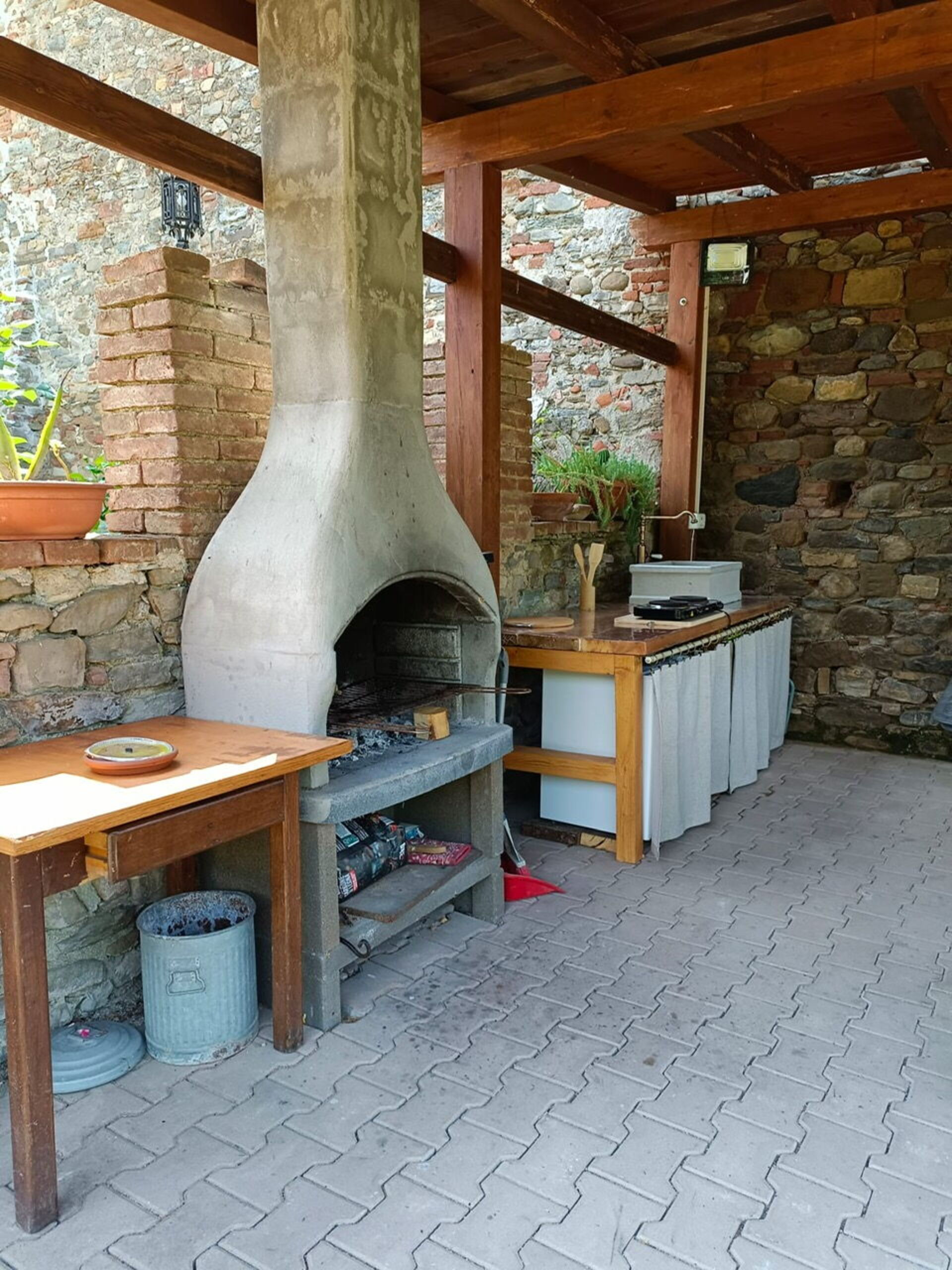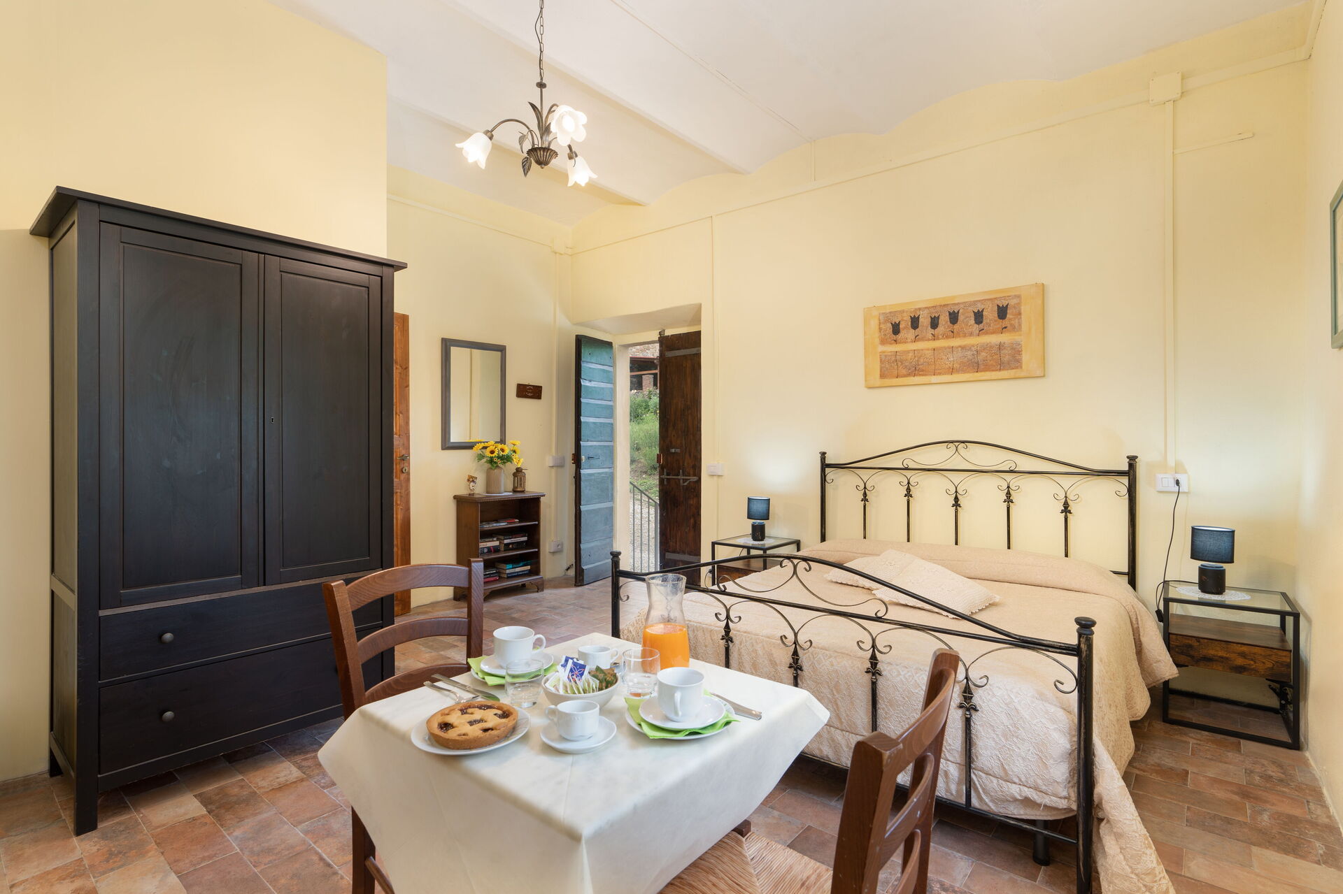 The housekeeper, who lives next to the villa, is at guests' service for quick lunches or typical dinners, upon request and payment (from a minimum of 15 euro per person to a maximum of 45 euro depending on the menu chosen). The locanda does not have an internal kitchen, but outside, under the loggia, there is an area equipped with a barbecue, electric hotplates, a small refrigerator, a sink, a worktop with drawers containing cutlery and shelves with plates, glasses and various cookware. Breakfast to be eaten in the room or in the dining room, daily tidying of rooms and bathrooms and final cleanings are included in the rental price.