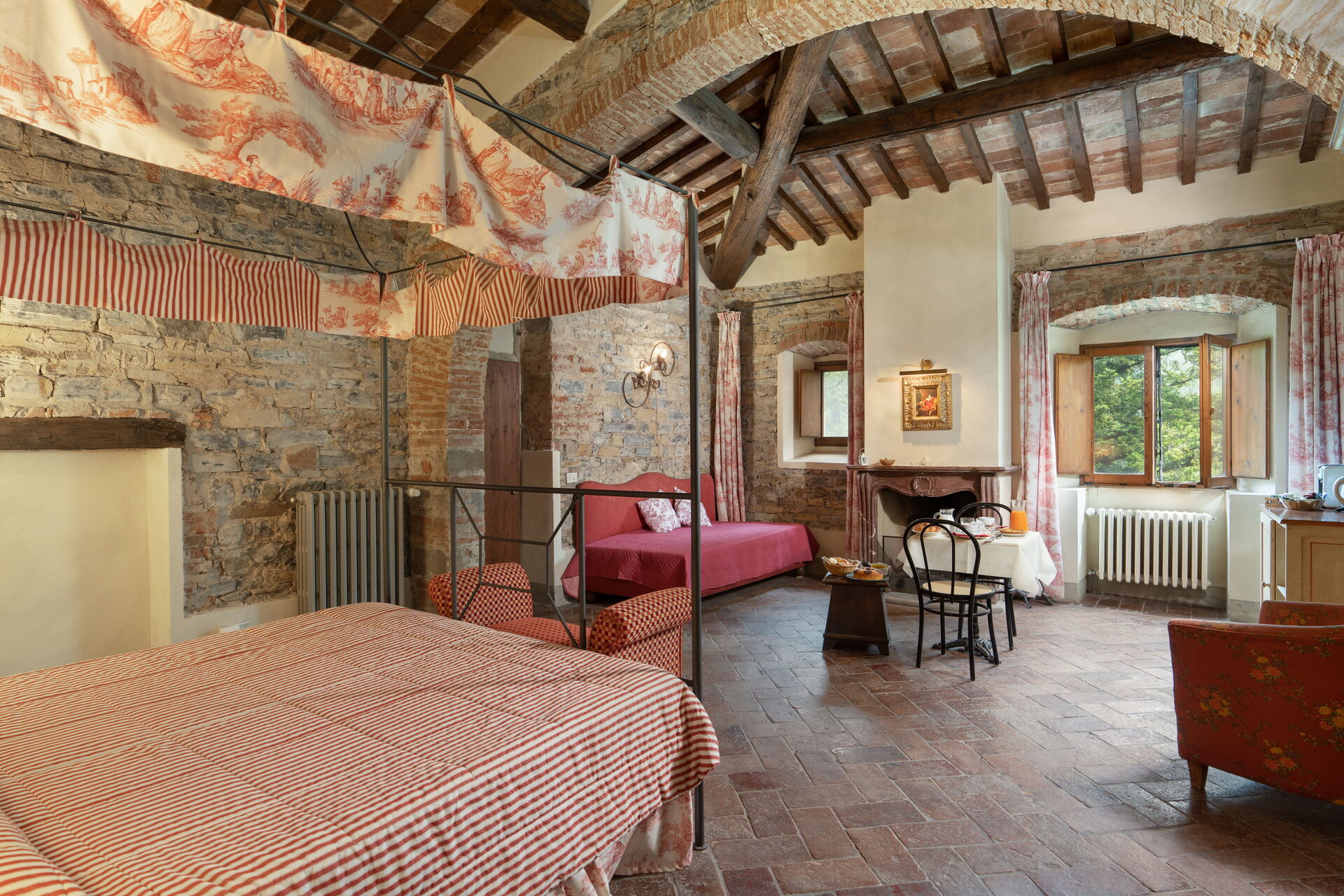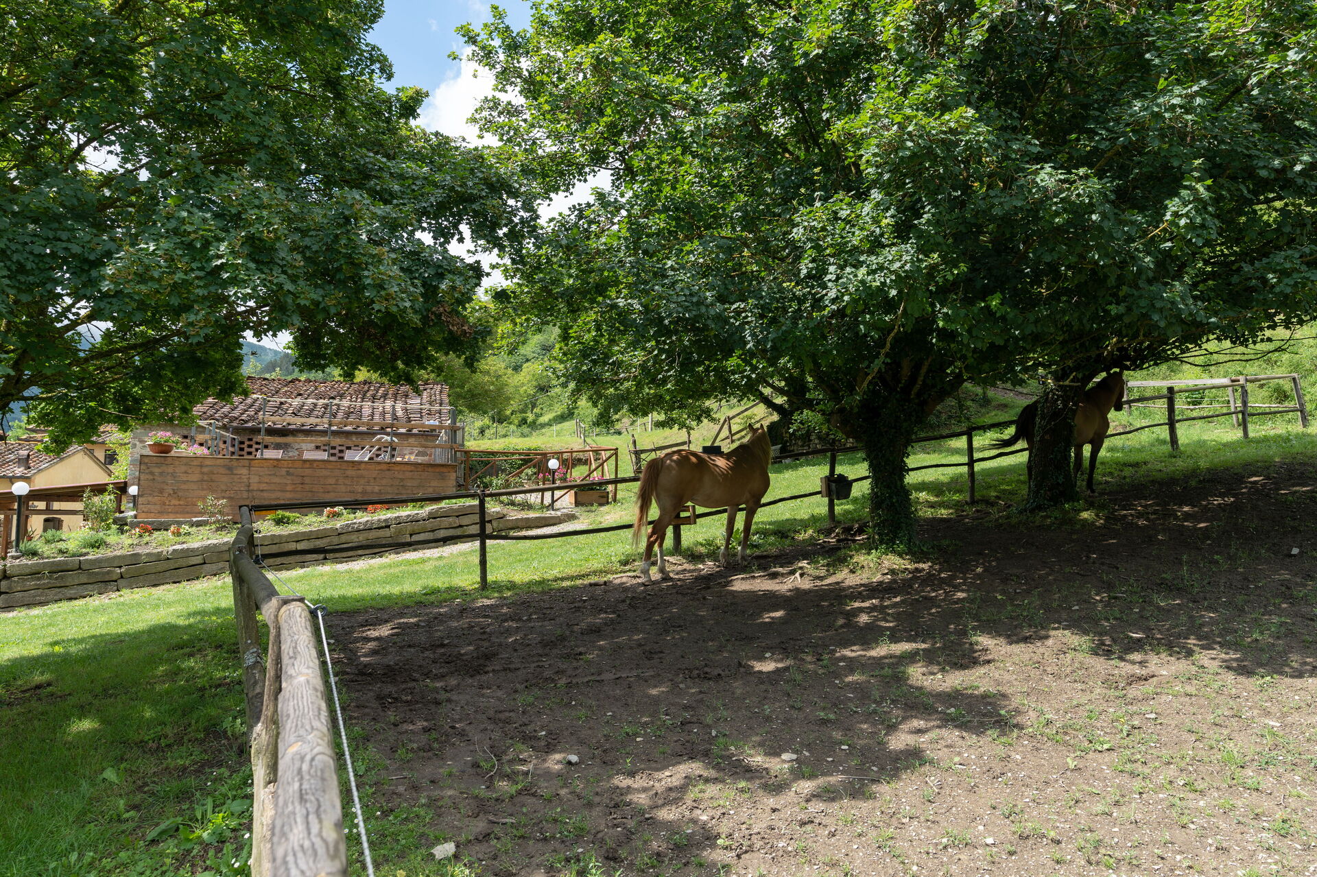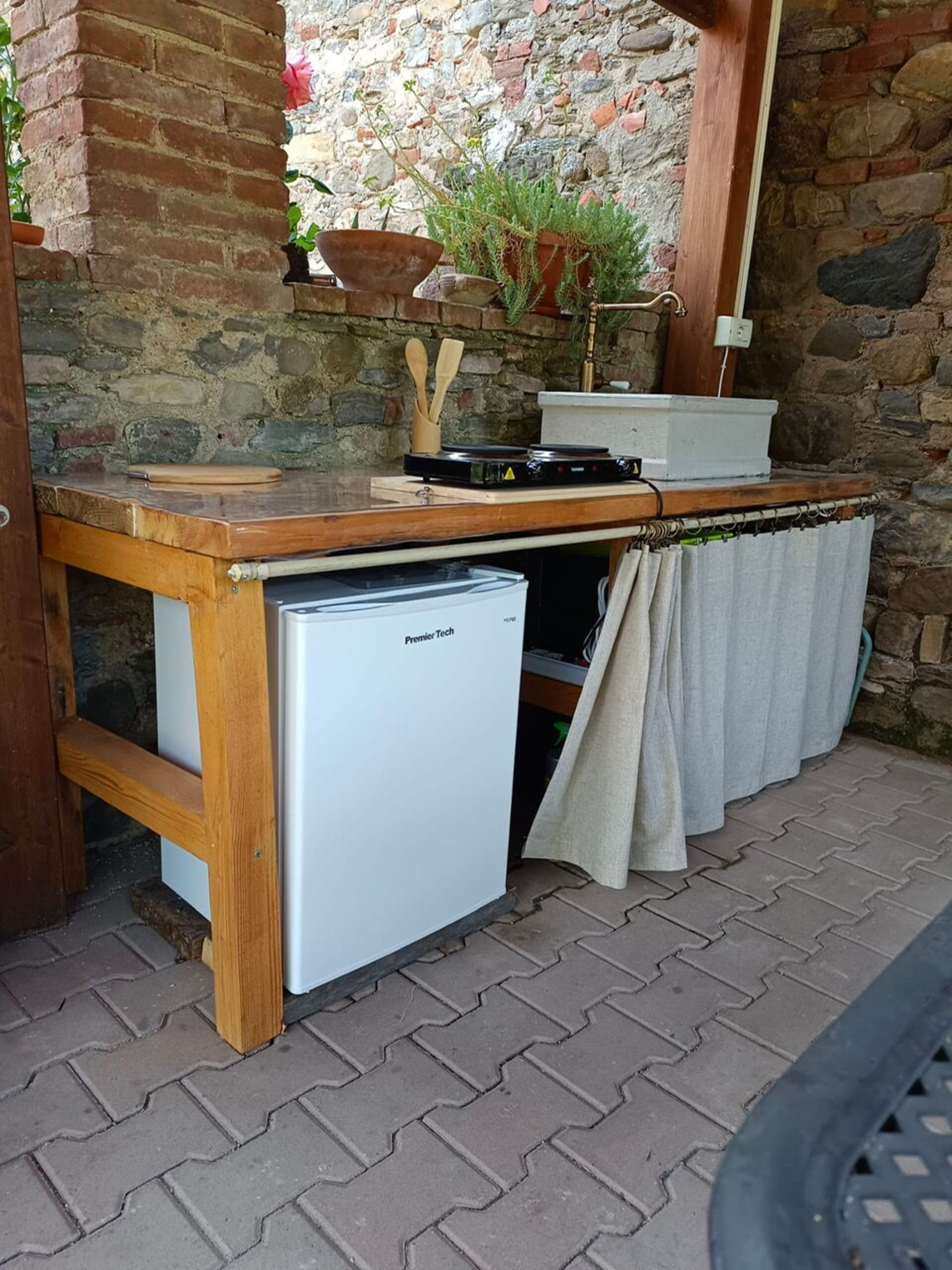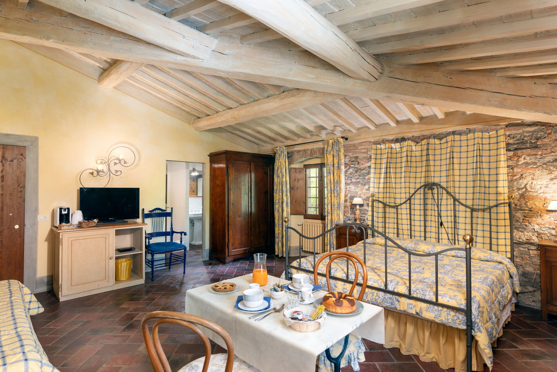 The housekeeper, who lives next to the villa, is at guests' service for quick lunches or typical dinners, upon request and payment (from a minimum of 15 euro per person to a maximum of 45 euro depending on the menu chosen). The locanda does not have an internal kitchen, but outside, under the loggia, there is an area equipped with a barbecue, electric hotplates, a small refrigerator, a sink, a worktop with drawers containing cutlery and shelves with plates, glasses and various cookware. Breakfast to be eaten in the room or in the dining room, daily tidying of rooms and bathrooms and final cleanings are included in the rental price.